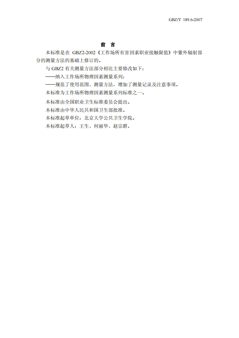 工作场所物理因素测量GBZT189.6-2007348072@abc4个月前发布关注私信0.16MB3页025工作场所物理因素测量GBZT189.6-2007此内容为付费资源,请付费后查看¥23¥32黄金会员免费钻石会员免费立即购买您当前未登录!建议登陆后购买,可保存购买订单付费资源 第1页 / 共3页 第2页 / 共3页 试读已结束,还剩1页,您可下载完整版后进行离线阅读 THE END标准规范 文本预览 ICS13.100C52GBZ中华人民共和国国家职业卫生标准GBZT189.6-2007工作场所物理因素测量紫外辐射Measurement of ultraviolet radiation in the workplace2007-04-20发布2007-11-01实施中华人民共和国卫生部发布 查看更多 收起部分 喜欢就支持一下吧收藏
