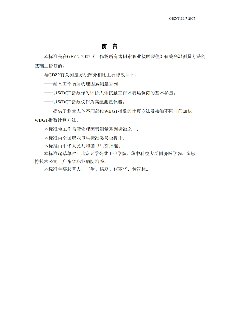 工作场所物理因素测量GBZT189.7-2007348072@abc4个月前发布关注私信92.24KB5页034工作场所物理因素测量GBZT189.7-2007此内容为付费资源,请付费后查看¥23¥32黄金会员免费钻石会员免费立即购买您当前未登录!建议登陆后购买,可保存购买订单付费资源 第1页 / 共5页 第2页 / 共5页 试读已结束,还剩3页,您可下载完整版后进行离线阅读 THE END标准规范 文本预览 ICS13.100C52GBZ中华人民共和国国家职业卫生标准GBZ/T189.7-2007工作场所物理因素测量高温Measurement of heat stress in the workplace2007-04-20发布2007-11-01实施中华人民共和国卫生部发布 查看更多 收起部分 喜欢就支持一下吧收藏