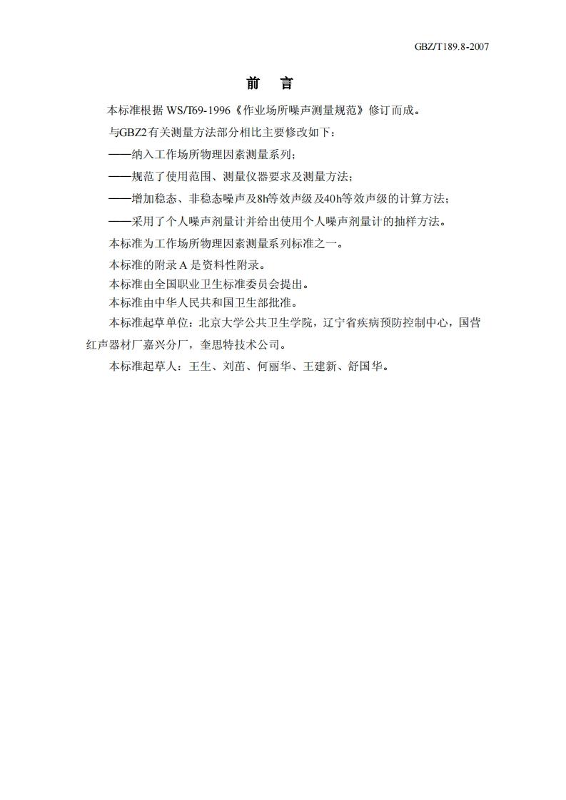 工作场所物理因素测量GBZT189.8-2007348072@abc4个月前发布关注私信0.16MB7页041工作场所物理因素测量GBZT189.8-2007此内容为付费资源,请付费后查看¥23¥32黄金会员免费钻石会员免费立即购买您当前未登录!建议登陆后购买,可保存购买订单付费资源 第1页 / 共7页 第2页 / 共7页 试读已结束,还剩5页,您可下载完整版后进行离线阅读 THE END标准规范 文本预览 ICS13.100C52GBZ中华人民共和国国家职业卫生标准GBZ/T189.8-2007工作场所物理因素测量噪声Measurement of noise in the workplace2007-04-20发布2007-11-01实施中华人民共和国卫生部发布 查看更多 收起部分 喜欢就支持一下吧收藏
