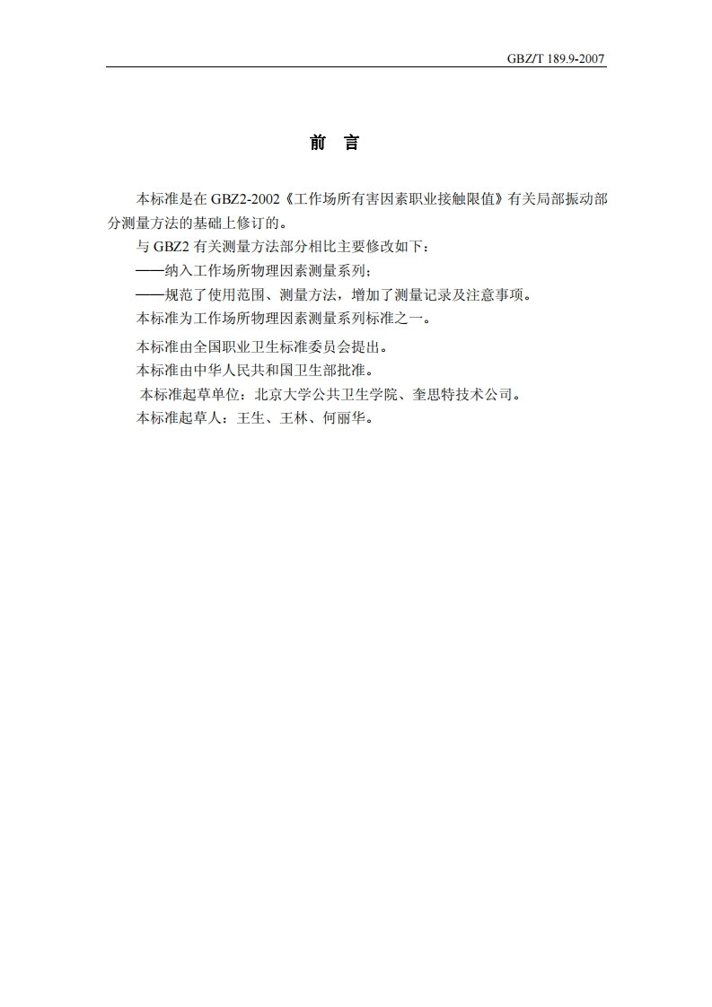 工作场所物理因素测量GBZT189.9-2007348072@abc4个月前发布关注私信0.15MB7页028工作场所物理因素测量GBZT189.9-2007此内容为付费资源,请付费后查看¥23¥32黄金会员免费钻石会员免费立即购买您当前未登录!建议登陆后购买,可保存购买订单付费资源 第1页 / 共7页 第2页 / 共7页 试读已结束,还剩5页,您可下载完整版后进行离线阅读 THE END标准规范 文本预览 ICS13.100C52GBZ中华人民共和国国家职业卫生标准GBZT189.9-2007工作场所物理因素测量手传振动Measurement of hand-transmitted vibration in the workplace2007-04-20发布2007-11-01实施中华人民共和国卫生部发布 查看更多 收起部分 喜欢就支持一下吧收藏