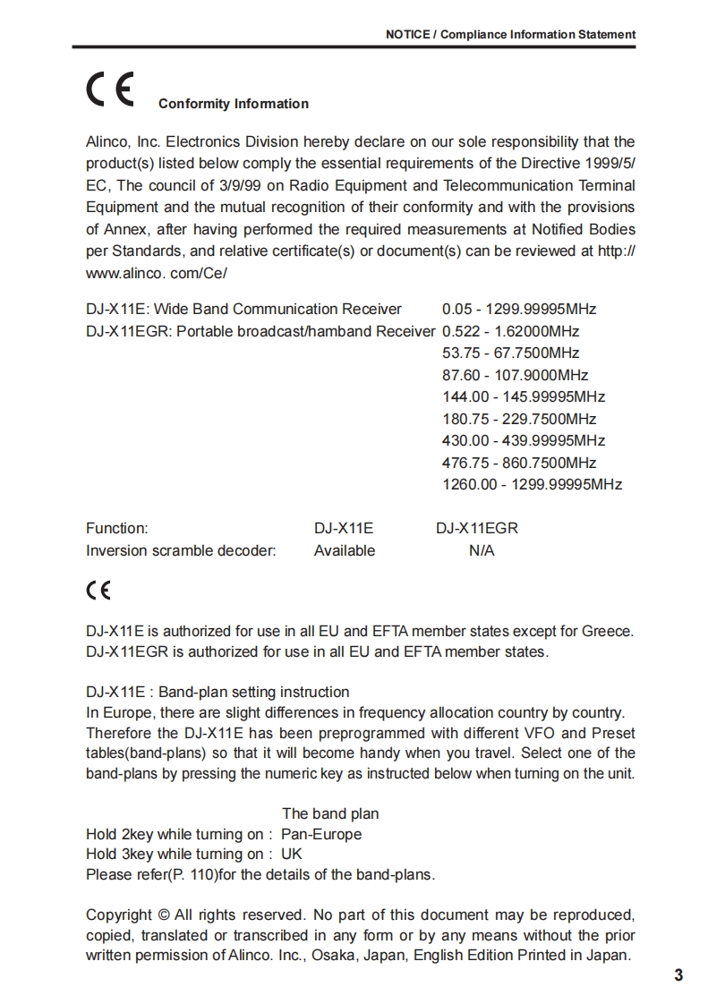 ALINCOWIDE BAND COMMUNICATION RECEIVERDJ-X11Instruction ManualALINCOAUDIO望图0⑨竖ENT赢D-X11Thank you for purchasing your new Alinco receiver.This instruction manual contains important safety and operatinginstructions.Please read this manual carefully before using the product and keep it for future reference.ALINCO,INC