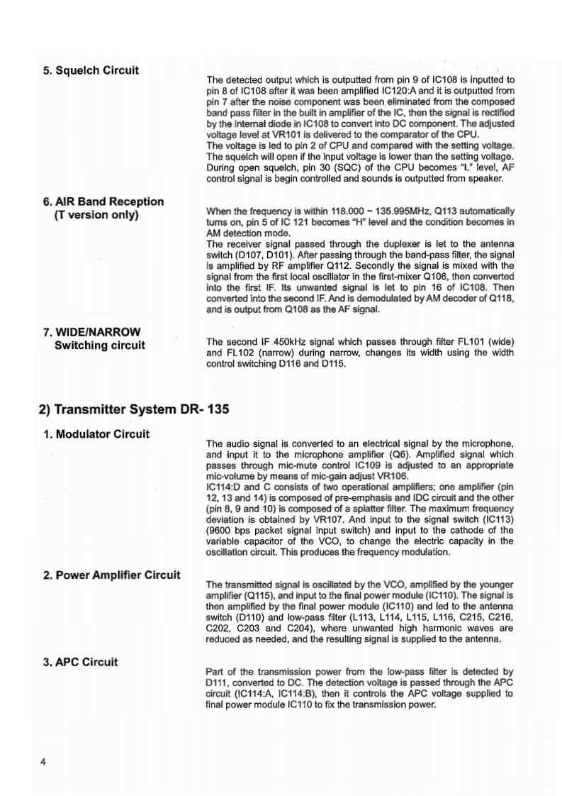 DR-135/435MkIIService ManualCONTENTSSPECIFICATIONSMechanical Parts.…3GENERAL......22Packing Parts...........年888年8年用g书08年8年0年年33TRANSMITTER.…ACCESSORIES3RECEIVER.............2ACCESSORIES (SCREW SET)...........TNC(EJ41U)】0444…40444044…34CIRCUIT DISCRIPTIONTNC (EJ41U)Packing Parts...............351)Receiver System DR-135.3.42)Transmitter System DR-135...DR-135 ADJUSTMENTPLL Synthesizer Circuit DR-135.①1)Adjustment Spot.........364Receiver System DR-435........................5.62)VCO and RX Adjustment Specification..3Transmitter System DR-435.73)TX Adjustment Specification.............376)PLL Synthesizer Circuit DR-435................7.84)RX Test Specification...................387)CPU and Peripheral Circuit...................5)TX Test Specification.....398)Power Supply Circuit...9M38268MCA075GP(XA1130)..10-12DR-435 ADJUSTMENT1)Adjustment Spot..........40SEMICONDUCTOR DATA2)VCO and RX Adjustment Specification.41)NJM7808FA(XA0102).33TX Adjustment Specification............42TC4S66FXA0115)........134)RX Test Specification....433AN8010MXA0119)135)TX Test Specification..............444)BU4052BCF(XA0236)…135)TC4W53FU(XA0348)............14PC BOARD VIEW6)TA31136FN(XA0404).....141)CPU Unit Side A DR-135(UP0536)......457)LA4425A(XA0410)..152)CPU Unit Side B DR-135(UP0536)458)BR24L32FJ(XA0604Z).153)CPU Unit Side A DR-435 (UP0543)......69S-80845ALMP(XA0620)......15CPU Unit Side B DR-435(UP0543)......4610)L88MS05TLL(XA0675).155)MAIN Unit Side A DR-135(UP0536).....4711)S-816A50AMC(XA0925)166)MAIN Unit Side B DR-135 (UP0536)....712)LM2904 PWR (XA1103)..167)MAIN Unit Side ADR-435(UP0543).....813)LM2902PVWR(XA1106)168)MAIN Unit Side B DR-435(UP0543)....414)MB15E07SR(XA1107)179)TNC Unit Side A(UP0402)(option)......4915)RA60H1317M1(XA1108)..…110)TNC Unit Side A(UP0402)(option)......4916)S-AU82L(XA1142).1917)Transistor,Diode and LED Outline Drawing...20SCHEMATIC DIAGRAM18)LCD Connection (TTR3626UPFDHN).211)CPU Unit DR-135.....502)CPU Unit DR-435.EXPLODED VIEWMAIN Unit DR-135......521)Top and Front View.....24)MAIN Unit DR-435........................2Bottom View...............25)TNC Unit (option).....543)LCD Assembly.…BLOCK DIAGRAMPARTS LIST1)DR-13555CPU Unit.…25,262)DR-435.5MAIN Unit DR-13526-29MAIN Unit DR-435.29-32ALINCOINC.