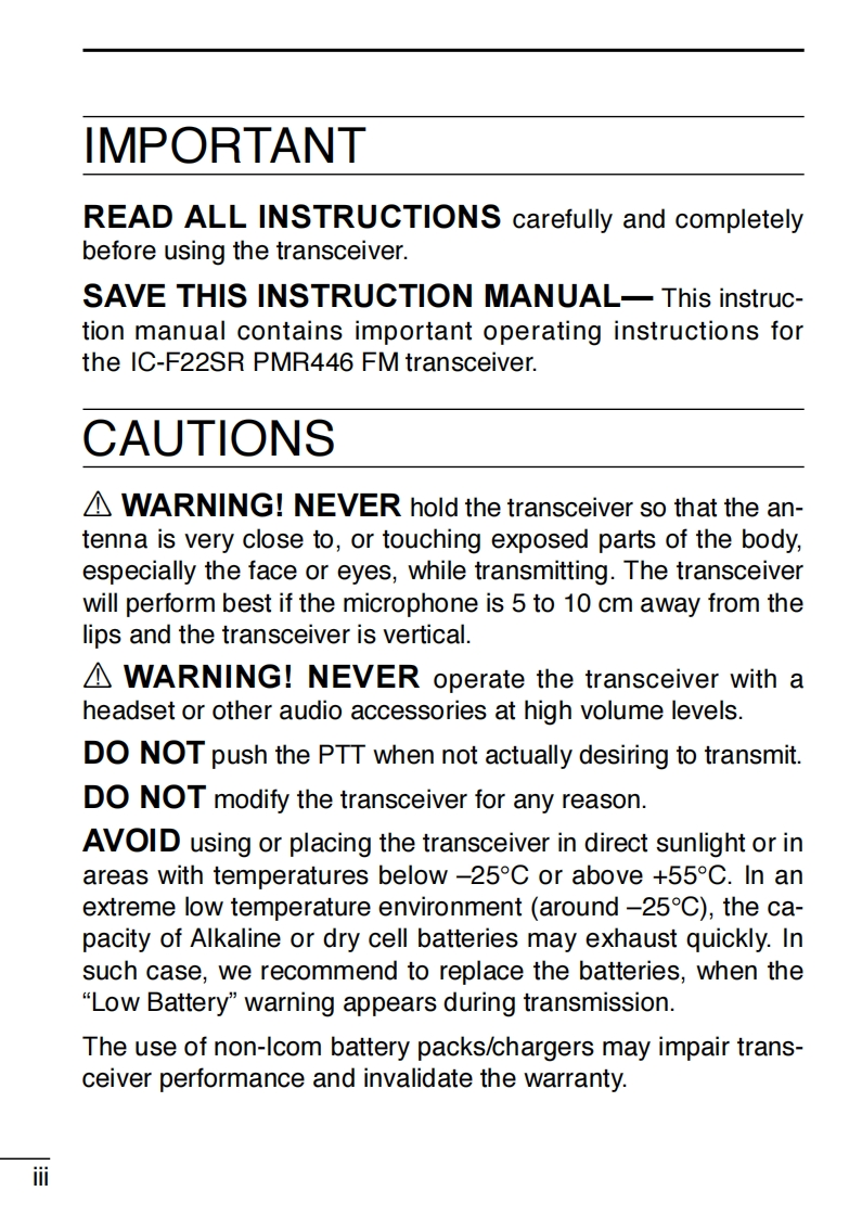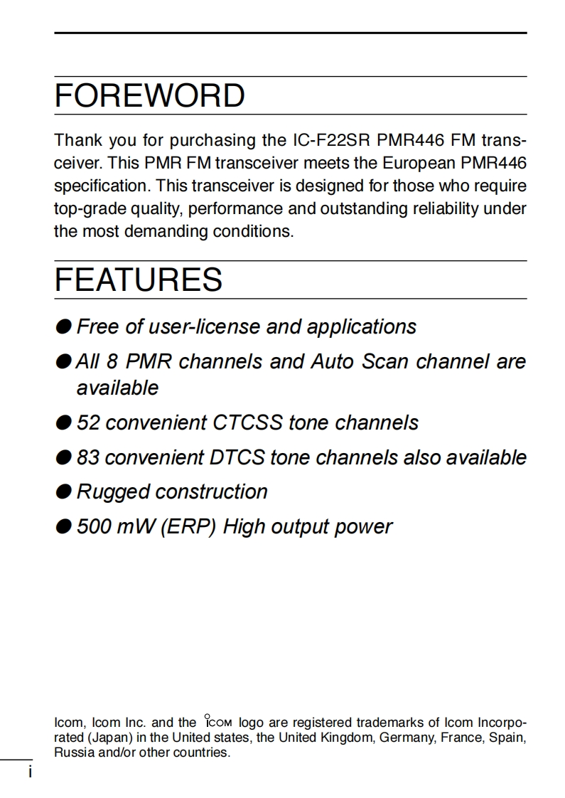 IC-F22SR_Manual操作说明书手册找手册网31天前发布关注私信0.44MB36页021IC-F22SR_Manual操作说明书手册此内容为付费资源,请付费后查看¥19¥21黄金会员免费钻石会员免费登录购买付费资源 第1页 / 共36页 第2页 / 共36页 第3页 / 共36页 第4页 / 共36页 第5页 / 共36页 第6页 / 共36页 第7页 / 共36页 第8页 / 共36页 第9页 / 共36页 第10页 / 共36页 试读已结束,还剩26页,您可下载完整版后进行离线阅读 THE END艾可慕 文本预览 ICOMINSTRUCTION MANUALPMR446 FM TRANSCEIVERIC-F22SRCOMIcom Inc. 查看更多 收起部分 喜欢就支持一下吧收藏