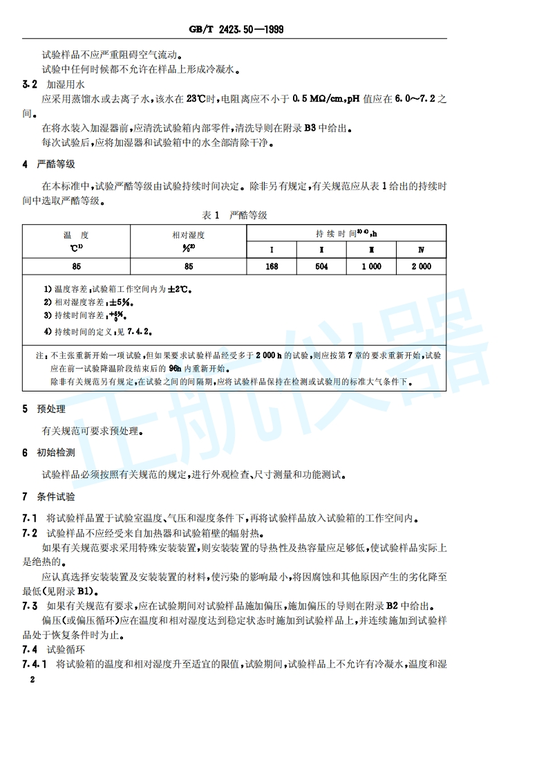 中华人民共和国国家标准电工电子产品环境试验第2部分:试验方法试验Cy:恒定湿热G邻/T2423.50一1999主要用于元件的加速试验idt IEC68-2-67:1995Environmental testing for electric and electronic products-Part 2:Tests-Test Cy:Damp heat,steady state,acceleratedtest primarily intended for components1范围本标准规定了一种以加速方式评价小型电工电子产品,主要是非气密元件耐湿热劣化效应的试验方法。本试验不适用于评价诸如腐蚀和变形等外部效应。2概述在本试验中,样品在较长的时间内承受很高的未饱和湿热蒸汽压力的作用。通常施加偏压。本试验在相对湿度为85%、温度为85℃的条件下提供了若干优先的试验持续时间。就塑封元件而言,劣化作用是因塑料吸收水汽和水汽沿引出端渗入而引起的。3试验装置的说明3.1试验箱试验箱应如此设计和制造:a)能产生表1中给出的温度和相对湿度条件,并至少保持2000h不间断,b)试验期间,应能提供受控的温湿度条件,并能根据规定的斜率升温和降温,©)试验箱内的温度和湿度应由放置在工作空间内或(和)能给出相同结果的其他区域内的传感装置监测d)应从工作空间不断排水,且不能重复使用,©)凝结水不允许落在试验样品上,)箱壁结构材料不应引起试验样品的明显腐蚀和降低加湿用水质量(见附录B1)。土2℃的温度容差考虑了测量的绝对误差、工作空间内任意两点间温度的变化和任一点的温度波动。为了将相对湿度维持在规定的土5%容差范围内,必须将工作空间任意两点的温差(任一瞬间的)保持在更小范围内。如果这样的温差超过1.5℃,规定的湿度容差将超差。因此,也需将由试验箱的加热器周期性地加热所引起的短期温度波动限制在类似值。国家质量技术监督局1999-10-10批准2000-05-01实施