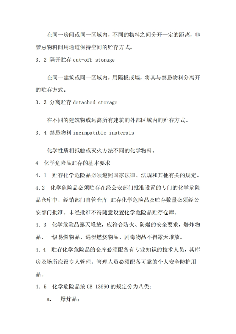 中华人民共和国国家标准常用化学危险品贮存通则Rule for storage of chemical dangersGB15603-19951主题内容与适用范围本标准规定了常用化学危险品(以下简称化学危险品)贮存的基本要求。本标准适用于常用化学危险品(以下简称化学危险品)出、入库,贮存及养护。2引用标准GB190危险货物包装标志GB13690常用危险化学品的分类及标志GBJ16建筑设计防火规范3定义3.1隔离贮存segregated storage