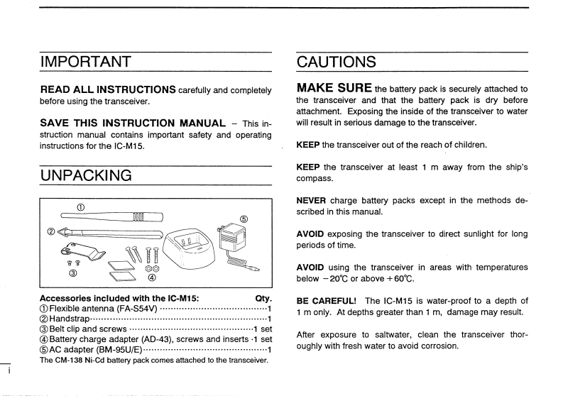 IC-M15-USA-Instruction-manual操作说明书手册找手册网31天前发布关注私信2.39MB24页033IC-M15-USA-Instruction-manual操作说明书手册此内容为付费资源,请付费后查看¥19¥21黄金会员免费钻石会员免费登录购买付费资源 第1页 / 共24页 第2页 / 共24页 第3页 / 共24页 第4页 / 共24页 第5页 / 共24页 第6页 / 共24页 第7页 / 共24页 第8页 / 共24页 第9页 / 共24页 第10页 / 共24页 试读已结束,还剩14页,您可下载完整版后进行离线阅读 THE END艾可慕 文本预览 COMINSTRUCTION MANUALVHF MARINE TRANSCEIVER(U.S.A.version)IC-M15This device complies with Part 15 ofthe FCC rules.Operation is subjectto the condition that this device doesnot cause harmful interference.长Icom Inc. 查看更多 收起部分 喜欢就支持一下吧收藏
