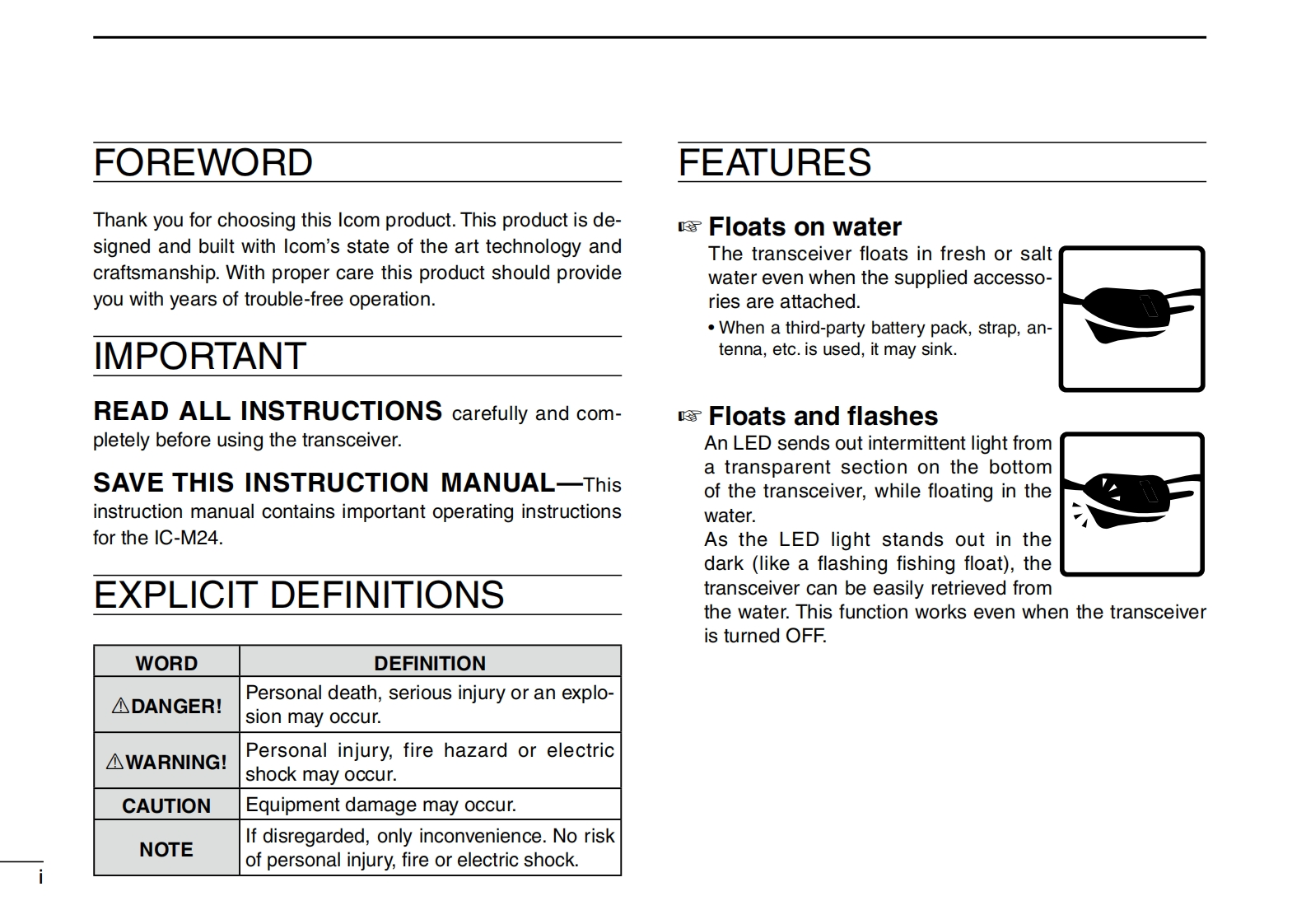 IC-M24-Instruction-manual操作说明书手册找手册网32天前发布关注私信3.15MB40页024IC-M24-Instruction-manual操作说明书手册此内容为付费资源,请付费后查看¥19¥21黄金会员免费钻石会员免费登录购买付费资源 第1页 / 共40页 第2页 / 共40页 第3页 / 共40页 第4页 / 共40页 第5页 / 共40页 第6页 / 共40页 第7页 / 共40页 第8页 / 共40页 第9页 / 共40页 第10页 / 共40页 试读已结束,还剩30页,您可下载完整版后进行离线阅读 THE END艾可慕 文本预览 INSTRUCTION MANUALVHF MARINE TRANSCEIVERIC-M24COMFLOAT'NFLASHThis device complies with Part 15 of the FCCRules.Operation is subject to the condition that62this device does not cause harmful interference.IC-M24画〔离圖可墨圆图四Icom Inc. 查看更多 收起部分 喜欢就支持一下吧收藏