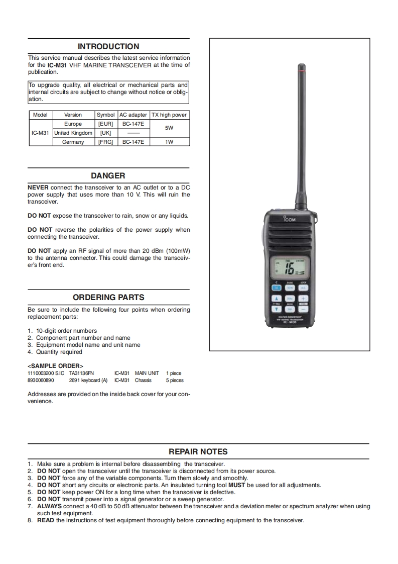 IC-M31-Service-manual维修手册含电器原理图找手册网32天前发布关注私信7.20MB30页025IC-M31-Service-manual维修手册含电器原理图此内容为付费资源,请付费后查看¥19¥21黄金会员免费钻石会员免费登录购买付费资源 第1页 / 共30页 第2页 / 共30页 第3页 / 共30页 第4页 / 共30页 第5页 / 共30页 第6页 / 共30页 第7页 / 共30页 第8页 / 共30页 第9页 / 共30页 第10页 / 共30页 试读已结束,还剩20页,您可下载完整版后进行离线阅读 THE END艾可慕 文本预览 icOMSERVICEMANUALVHF MARINE TRANSCEIVERIC-M31Icom Inc. 查看更多 收起部分 喜欢就支持一下吧收藏