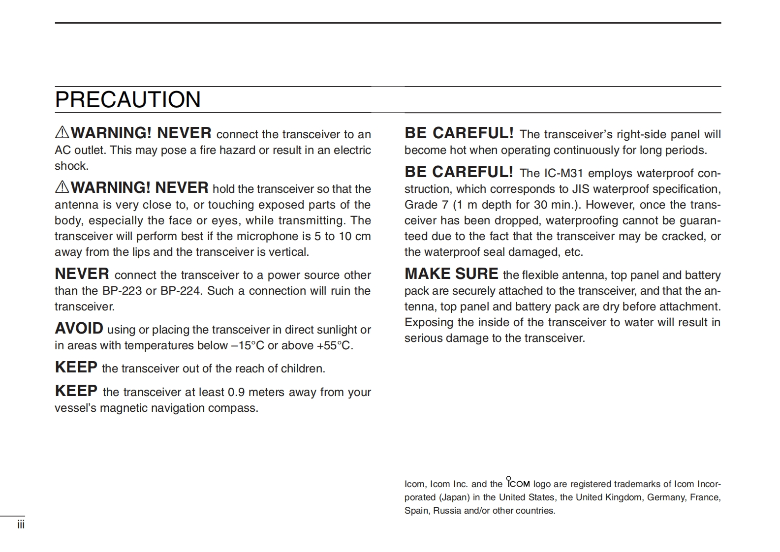 IC-M31_Manual操作说明书手册找手册网32天前发布关注私信1.11MB36页050IC-M31_Manual操作说明书手册此内容为付费资源,请付费后查看¥19¥21黄金会员免费钻石会员免费登录购买付费资源 第1页 / 共36页 第2页 / 共36页 第3页 / 共36页 第4页 / 共36页 第5页 / 共36页 第6页 / 共36页 第7页 / 共36页 第8页 / 共36页 第9页 / 共36页 第10页 / 共36页 试读已结束,还剩26页,您可下载完整版后进行离线阅读 THE END艾可慕 文本预览 COMINSTRUCTION MANUALVHF MARINE TRANSCEIVERIC-M3TCOMUALLOCK6SCNHDIAL+MONISQLIcom Inc. 查看更多 收起部分 喜欢就支持一下吧收藏