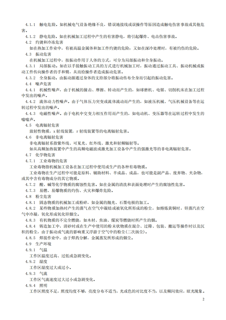 机械加工设备危险有害因素分类中华人民共和国国家标准GB12299-90国家技术监督局1990-04-03批准1990-12-01实施1主题内容与适用范围本标准规定了机械加工设备危险与有害因素的分类方法和范围。本标准适用于金属切削机床、锻压设备、铸造设备、焊接设备、起重设备。2术语2.1危险因素在机械加工设备生产过程中,能对人造成伤亡或对物造成突出性损坏的因素。2.2有害因素在机械加工设备生产过程中,能影响人的身心健康,导致疾病(含职业病),或对物造成慢性损坏的因素。2.3机械的危险与有害因素机械加工设备直接造成人身伤亡事故的灾害性因素。2.4非机械的危险与有害因素在机械加工设备生产过程及作业环境中能导致伤亡(非机械性损伤)事故或诱发职业病的因素。3机械的危险与有害因素分类3.1静止的危险3.1.1切削刀具的刀刃。3.1.2机械加工设备突出较长的机械部分。3.1.3毛坯、工具、设备边缘锋利飞边和粗糙表面。3.1.4引起滑跌、坠落的工作平台。3.2直线运动的危险3.2.1接近式的危险.纵向运动的构件,如龙门刨床的工作台、牛头刨床的滑枕、外圆磨床的往复工作台:b.横向运动的构件,如升降式铣床的工作台。3.2.2经过式的危险a.单纯作直线运动的部位,如运转中的带链:b.作直线运动的凸起部分,如运动中的金属接头:C.运动部位和静止部位的组合,如工作台与底座的组合:d.作直线运动的刃物,如牛头刨的刨刀、带锯床的带锯。3.3旋转运动的危险3.3.1卷进单独旋转机械部件中的危险,如卡盘、进给丝杆等单独旋转的机械部件以及磨削砂轮、铣刀等加工刃具。3.3.2卷进旋转运动中两个机械部件间的危险,如朝相反方向旋转的两个轧辊之间,相互啮合的齿轮。3.3.3卷进旋转机械部件与固定构件间的危险,如砂轮与砂轮支架之间,传输带与传输带架之间。3.3.4卷进旋转机械部件与直线运动件间的危险,如皮带与皮带轮、链条与链轮、齿条与齿轮。3.3.5旋转运动加工件打击或绞轧的危险,如伸出机床的细长加工件。3.4振动部件夹住的危险机构部件的一些结构可以呈现如振动体一样的振动引起被振动体部件夹住的危险。3.5飞出物击伤的危险3.5.1飞出的刀具或机械部件,如未夹紧的刀片、紧固不牢的接头、破碎的砂轮片等。3.5.2飞出的切屑或工件,如连续排出的或破碎而飞散的切屑,锻造加工中飞出的工件。4非机械的危险与有害因素分类4.1电击伤1