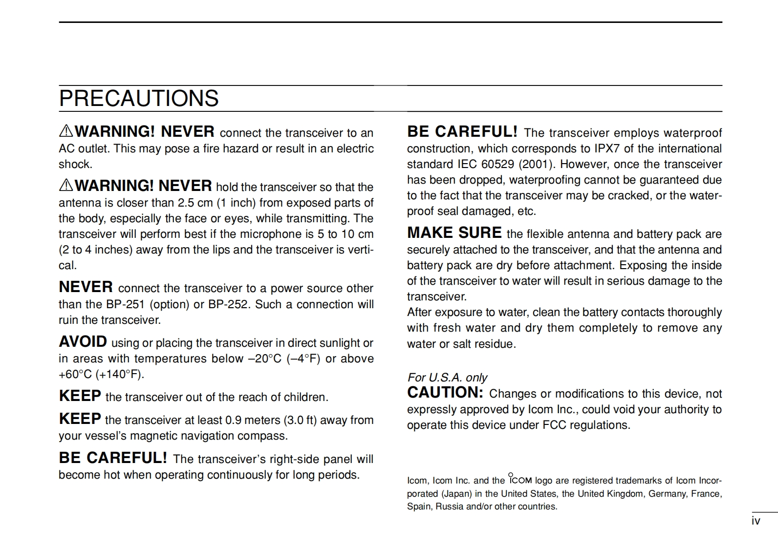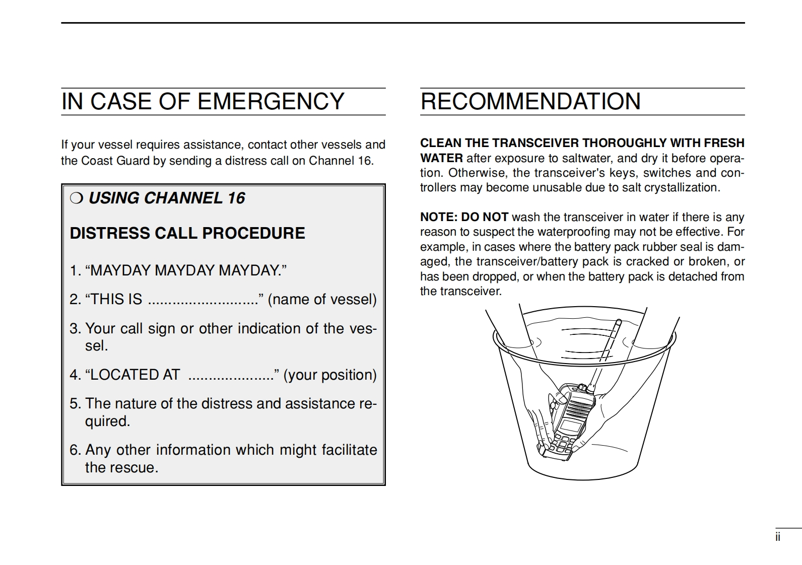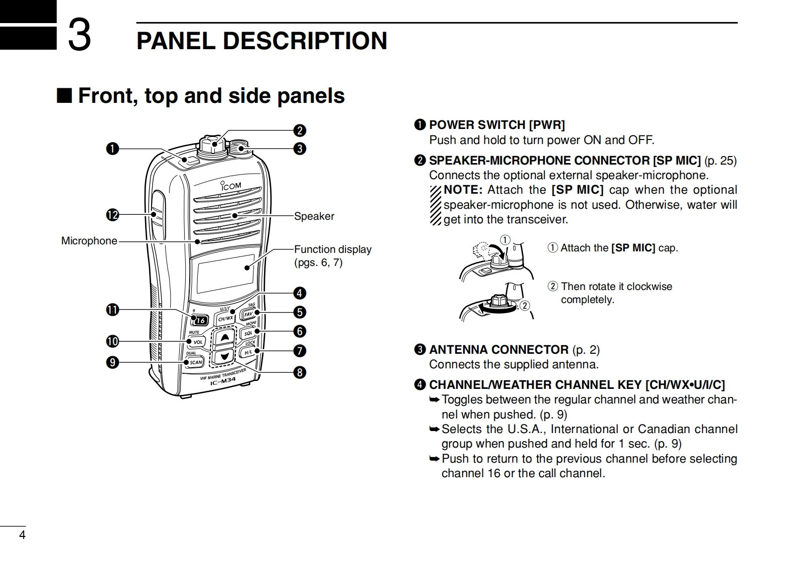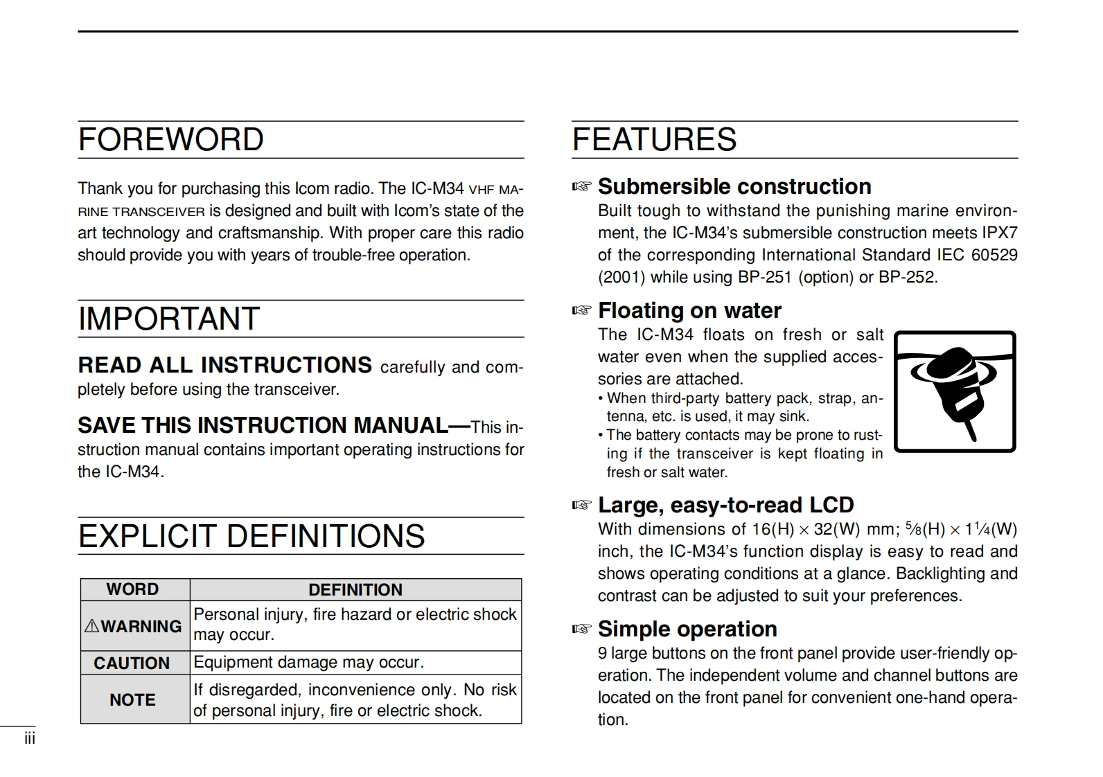 COMINSTRUCTION MANUALVHF MARINE TRANSCEIVERC-M34COMSUBMCRSIBLEThis device complies with Part 15 of the FCCFLOATINGRules.Operation is subject to the condition thatU//Cthis device does not cause harmful interference.06CH/WX回VOLAUALLOCKSCANIcom Inc.VHF MARINE TRANSCEIVER1C-M34