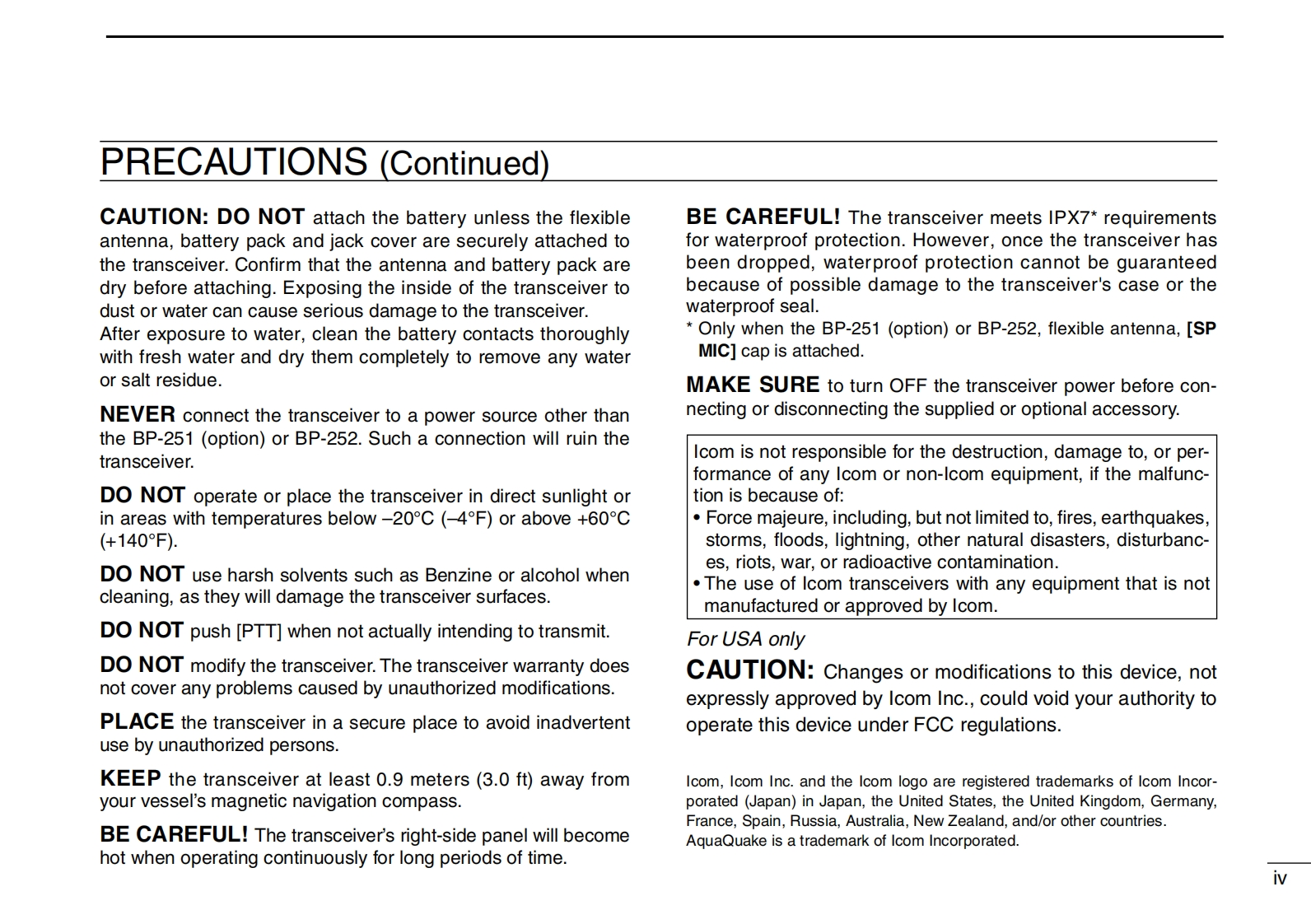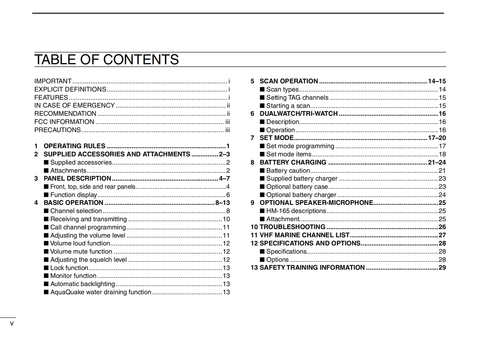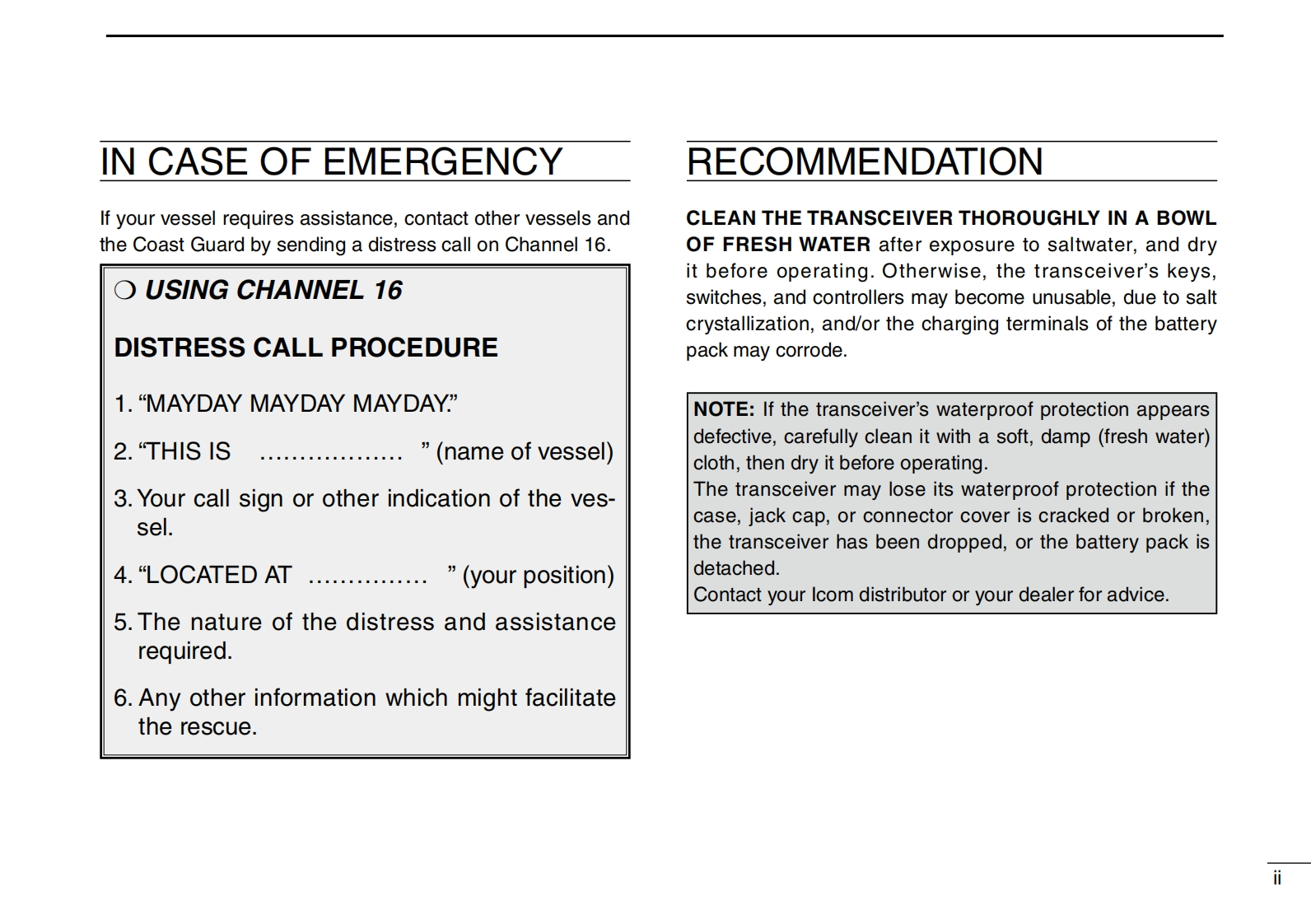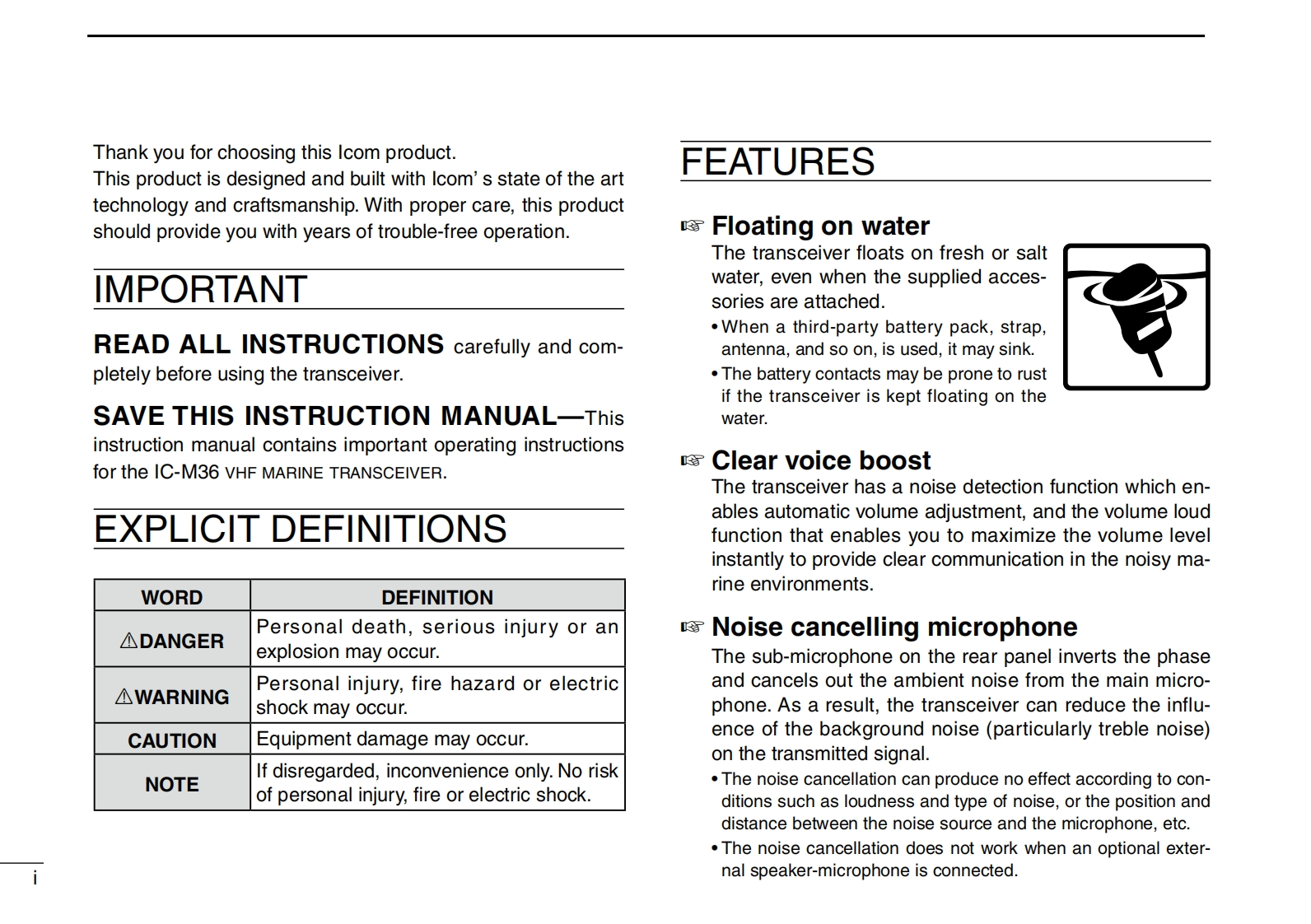 IC-M36-Instruction-manual操作说明书手册找手册网31天前发布关注私信1.21MB36页021IC-M36-Instruction-manual操作说明书手册此内容为付费资源,请付费后查看¥19¥21黄金会员免费钻石会员免费登录购买付费资源 第1页 / 共36页 第2页 / 共36页 第3页 / 共36页 第4页 / 共36页 第5页 / 共36页 第6页 / 共36页 第7页 / 共36页 第8页 / 共36页 第9页 / 共36页 第10页 / 共36页 试读已结束,还剩26页,您可下载完整版后进行离线阅读 THE END艾可慕 文本预览 INSTRUCTION MANUALVHF MARINE TRANSCEIVERIC-M36ICOMFLOATINGAThis device complies with Part 15 of the FCC Rules.Operation issubject to the condition that this device does not cause harmfulinterference.巴CLEAR VOICE BOOST+ 查看更多 收起部分 喜欢就支持一下吧收藏