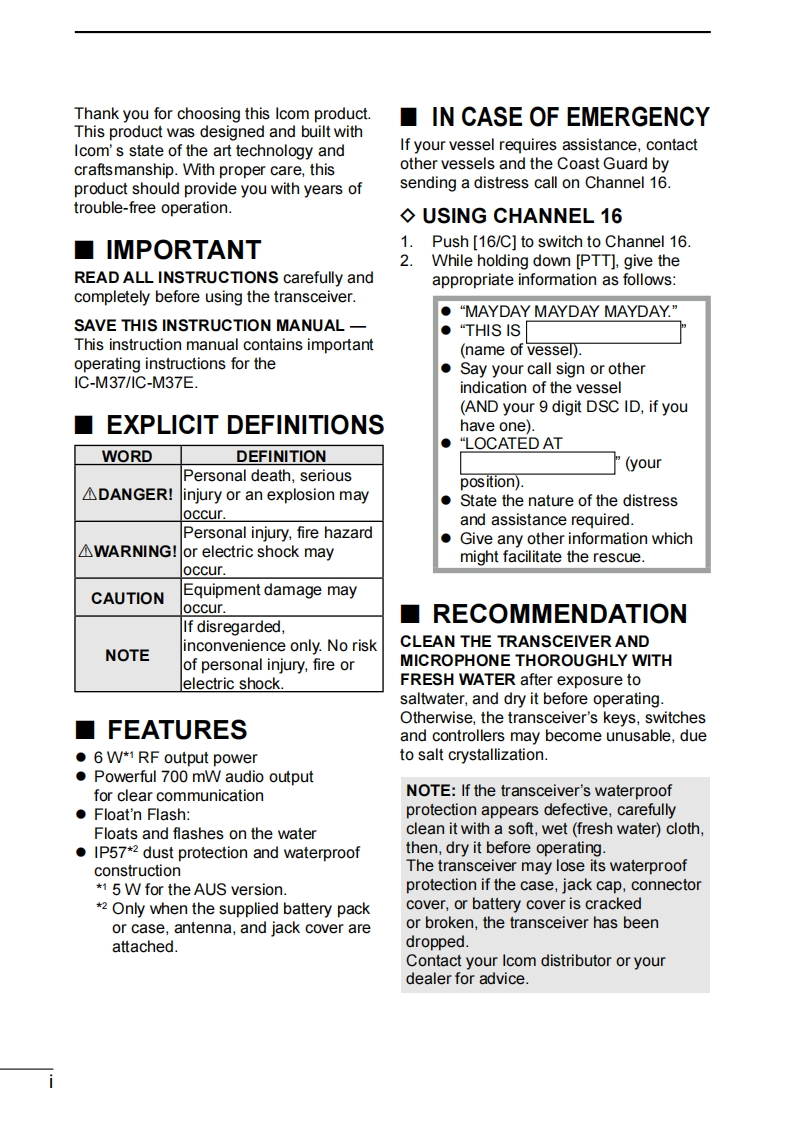 IC-M37-Instruction-manual操作说明书手册找手册网31天前发布关注私信1.33MB36页032IC-M37-Instruction-manual操作说明书手册此内容为付费资源,请付费后查看¥19¥21黄金会员免费钻石会员免费登录购买付费资源 第1页 / 共36页 第2页 / 共36页 第3页 / 共36页 第4页 / 共36页 第5页 / 共36页 第6页 / 共36页 第7页 / 共36页 第8页 / 共36页 第9页 / 共36页 第10页 / 共36页 试读已结束,还剩26页,您可下载完整版后进行离线阅读 THE END艾可慕 文本预览 INSTRUCTION MANUALVHF MARINE TRANSCEIVERIE M3ZECOM1=ME7This device complies with Part 15 ofthe FCC rules.Operation is subject tothe condition that this device does not鼢cause harmful interference.Icom Inc. 查看更多 收起部分 喜欢就支持一下吧收藏