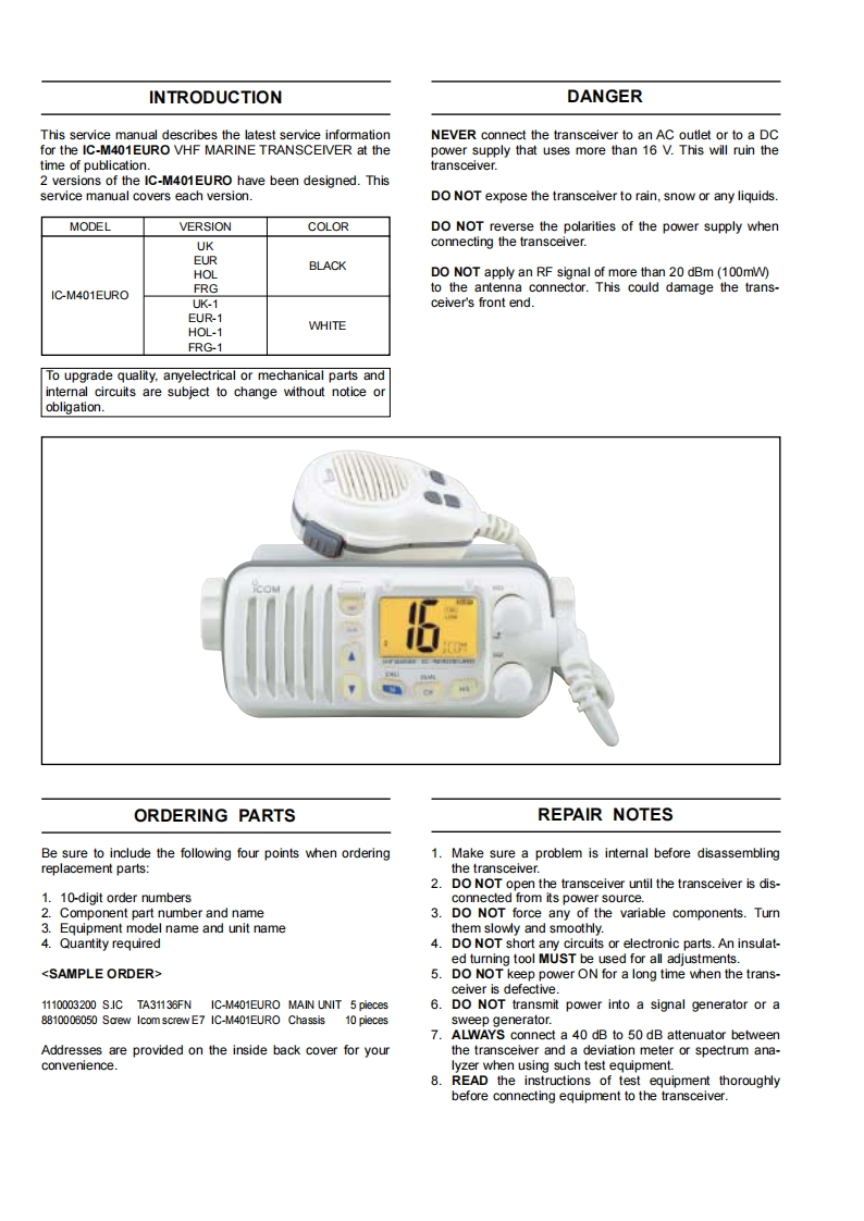 IC-M401Euro-service-manual维修手册含电器原理图找手册网32天前发布关注私信1.32MB36页032IC-M401Euro-service-manual维修手册含电器原理图此内容为付费资源,请付费后查看¥19¥21黄金会员免费钻石会员免费登录购买付费资源 第1页 / 共36页 第2页 / 共36页 第3页 / 共36页 第4页 / 共36页 第5页 / 共36页 第6页 / 共36页 第7页 / 共36页 第8页 / 共36页 第9页 / 共36页 第10页 / 共36页 试读已结束,还剩26页,您可下载完整版后进行离线阅读 THE END艾可慕 文本预览 icOm'SERVICEMANUALVHF MARINE TRANSCEIVERC-M4OTEUROIcom Inc. 查看更多 收起部分 喜欢就支持一下吧收藏