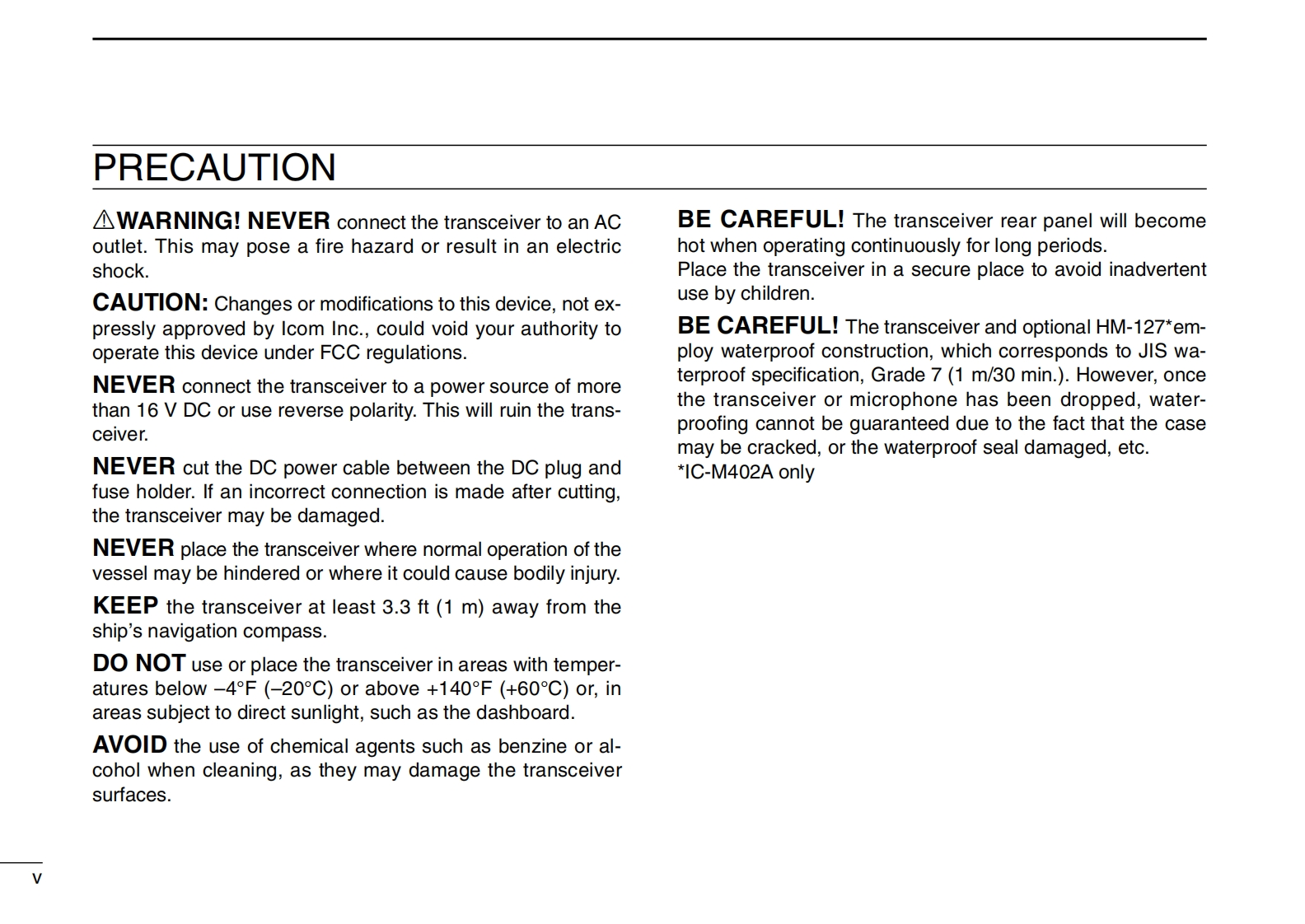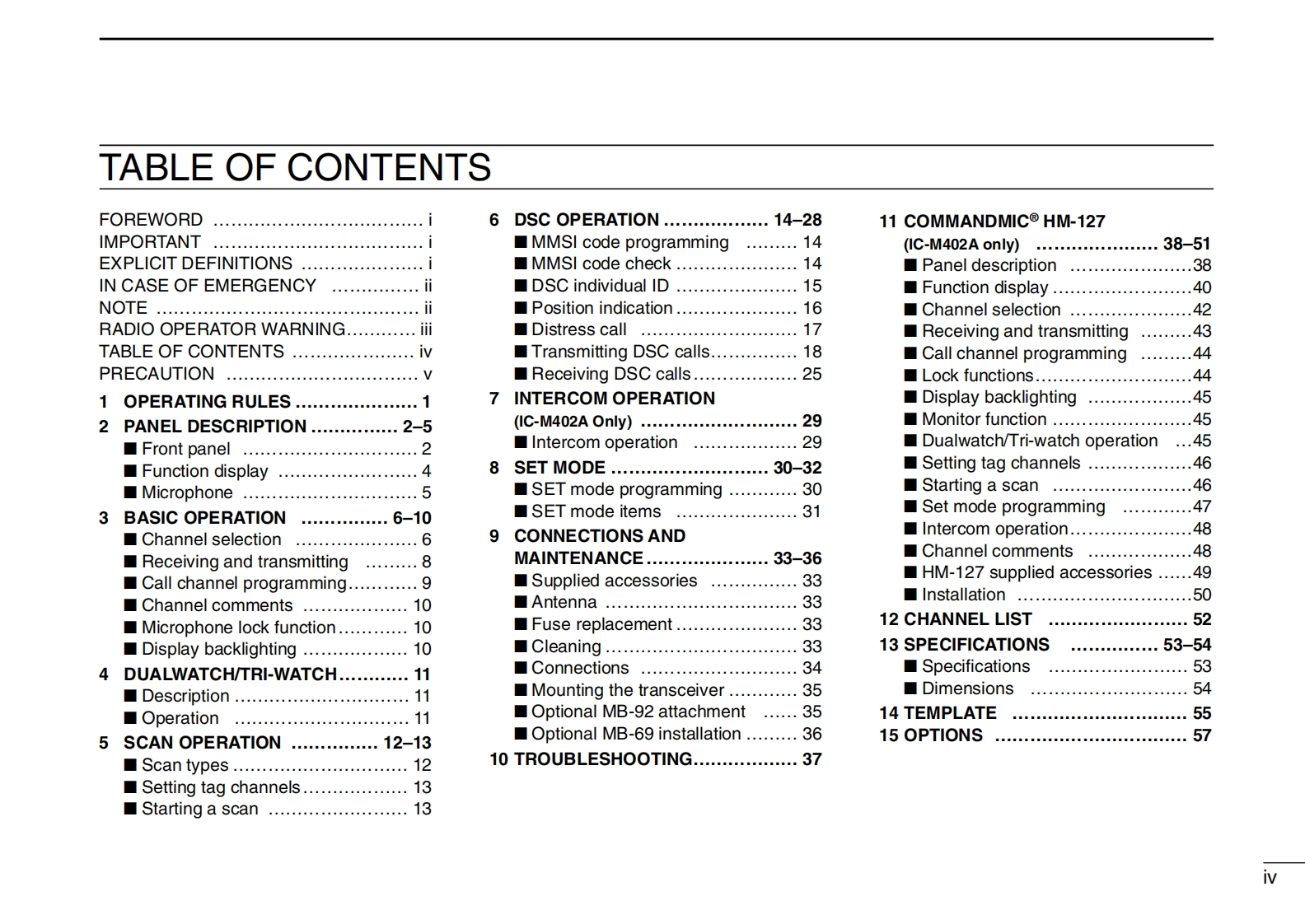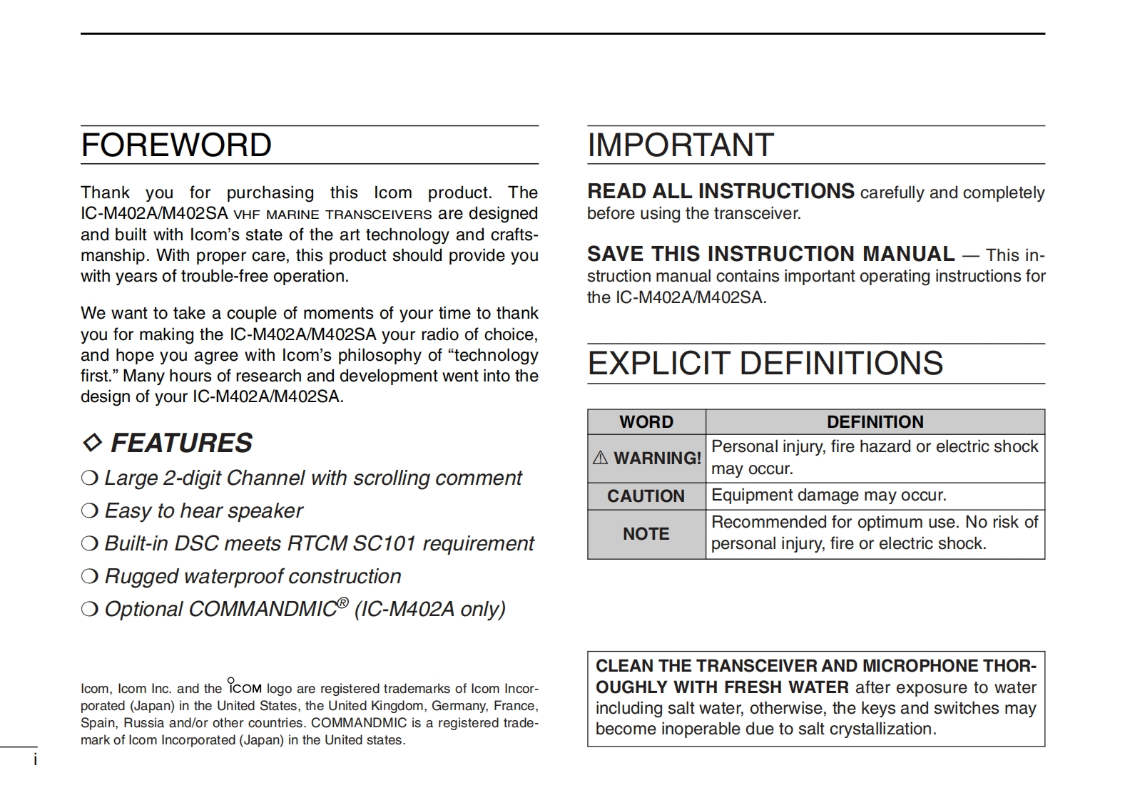 IC-M402A_IC-M402SA_Manual操作说明书手册找手册网32天前发布关注私信1.79MB64页048IC-M402A_IC-M402SA_Manual操作说明书手册此内容为付费资源,请付费后查看¥19¥21黄金会员免费钻石会员免费登录购买付费资源 第1页 / 共64页 第2页 / 共64页 第3页 / 共64页 第4页 / 共64页 第5页 / 共64页 第6页 / 共64页 第7页 / 共64页 第8页 / 共64页 第9页 / 共64页 第10页 / 共64页 试读已结束,还剩54页,您可下载完整版后进行离线阅读 THE END艾可慕 文本预览 COMINSTRUCTION MANUALVHF MARINE TRANSCEIVERIC-M402A(REMOTE-CONTROL MIC COMPATIBLE)IC-M402SACOMVOLDISTRESBUSYTAGVHF MARINE1C-M402DUALTAG16CH/WXSCANIcom Inc. 查看更多 收起部分 喜欢就支持一下吧收藏