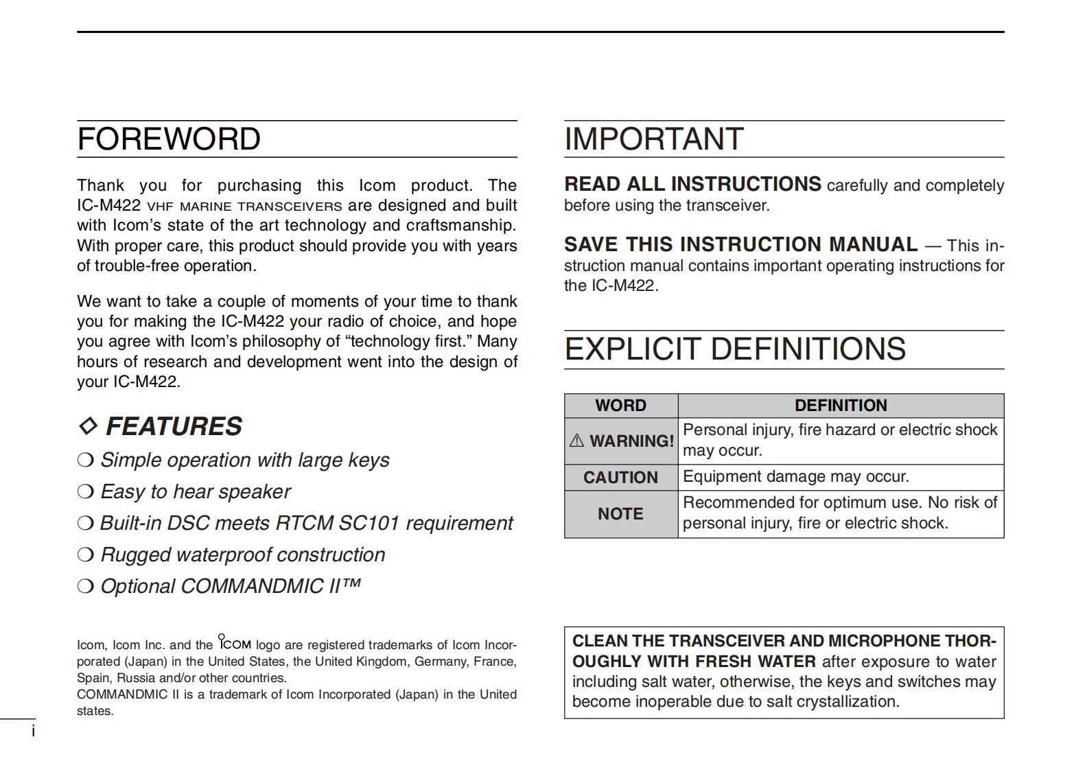IC-M422_Manual操作说明书手册找手册网32天前发布关注私信1.97MB64页029IC-M422_Manual操作说明书手册此内容为付费资源,请付费后查看¥19¥21黄金会员免费钻石会员免费登录购买付费资源 第1页 / 共64页 第2页 / 共64页 第3页 / 共64页 第4页 / 共64页 第5页 / 共64页 第6页 / 共64页 第7页 / 共64页 第8页 / 共64页 第9页 / 共64页 第10页 / 共64页 试读已结束,还剩54页,您可下载完整版后进行离线阅读 THE END艾可慕 文本预览 COMINSTRUCTION MANUALVHF MARINE TRANSCEIVERC-M422VHF MARINE海1C-M422BUSYUSARX)WR PUSH-ONCOMDUALPOS16CH/WXDSCU/IICTAGPALO/DXIcom Inc. 查看更多 收起部分 喜欢就支持一下吧收藏