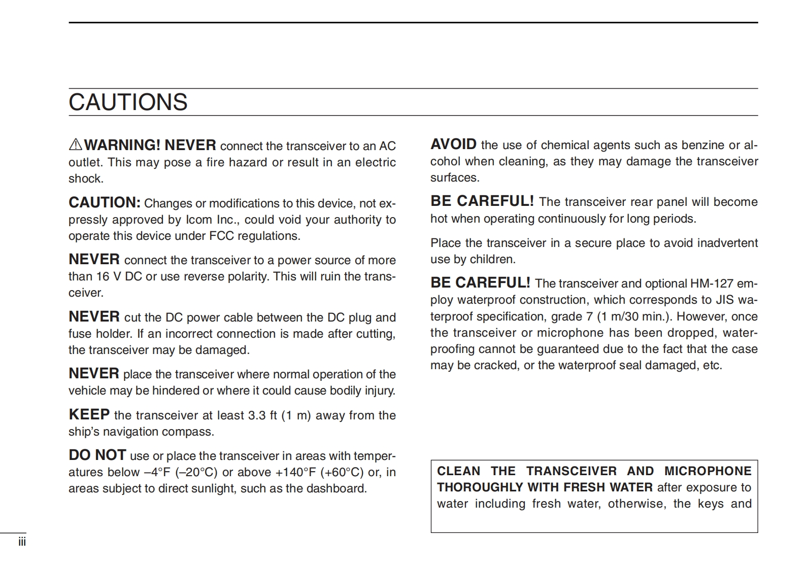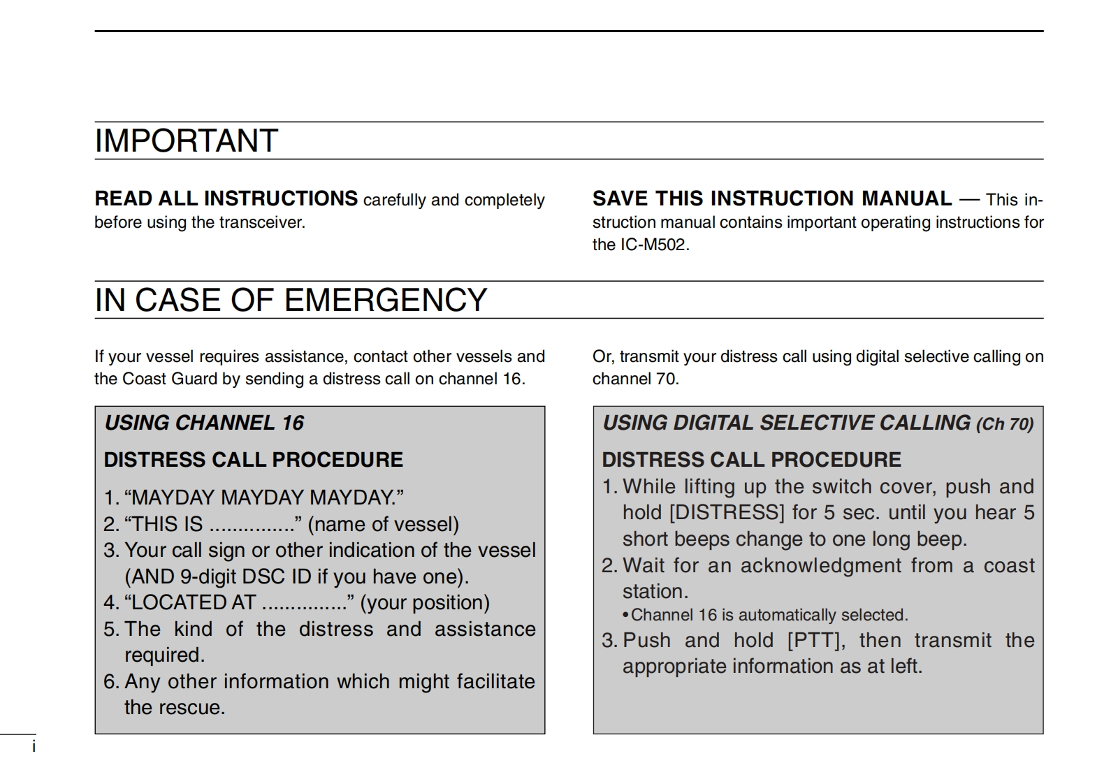 ICOMINSTRUCTION MANUALVHF MARINE TRANSCEIVERIC-M502This device complies with Part 15 of the FCC rules.Operation is sub-ject to the following two conditions:(1)This device may not causeharmful interference,and(2)this device must accept any interferencereceived,including interference that may cause undesired operation.|com Inc.
