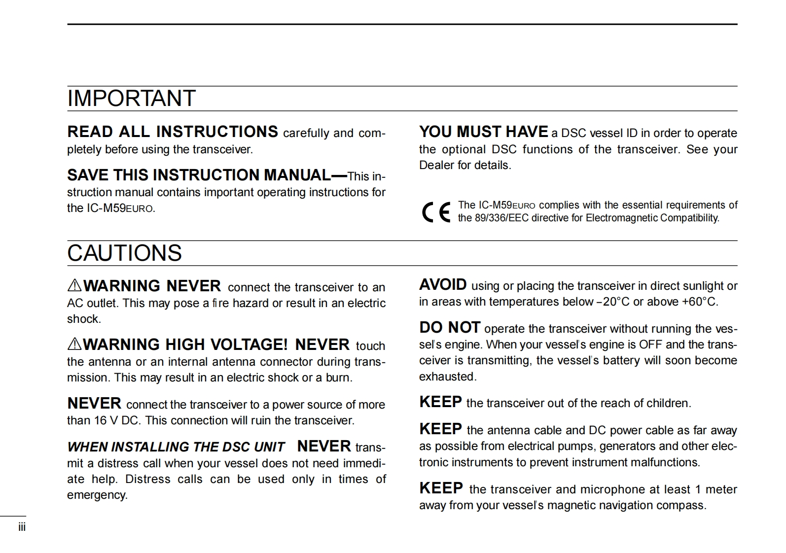 IC-M59Euro-Instruction-manual操作说明书手册-1找手册网32天前发布关注私信0.42MB32页047IC-M59Euro-Instruction-manual操作说明书手册-1此内容为付费资源,请付费后查看¥19¥21黄金会员免费钻石会员免费登录购买付费资源 第1页 / 共32页 第2页 / 共32页 第3页 / 共32页 第4页 / 共32页 第5页 / 共32页 第6页 / 共32页 第7页 / 共32页 第8页 / 共32页 第9页 / 共32页 第10页 / 共32页 试读已结束,还剩22页,您可下载完整版后进行离线阅读 THE END艾可慕 文本预览 COMINSTRUCTION MANUALVHF MARINE TRANSCEIVERC-M59EUROICOMVHF MARINE IC-M59EUROPWR/VOLOFFSQUELCHTAGTRICLRSCAN DUAL16MHVLO)DIALIcom Inc. 查看更多 收起部分 喜欢就支持一下吧收藏