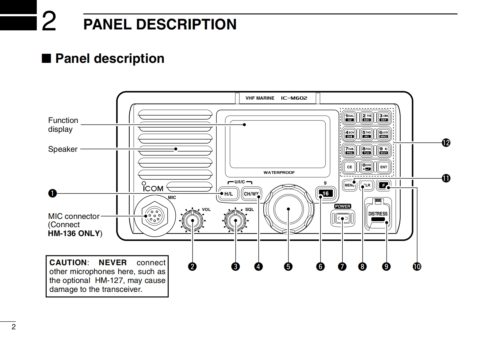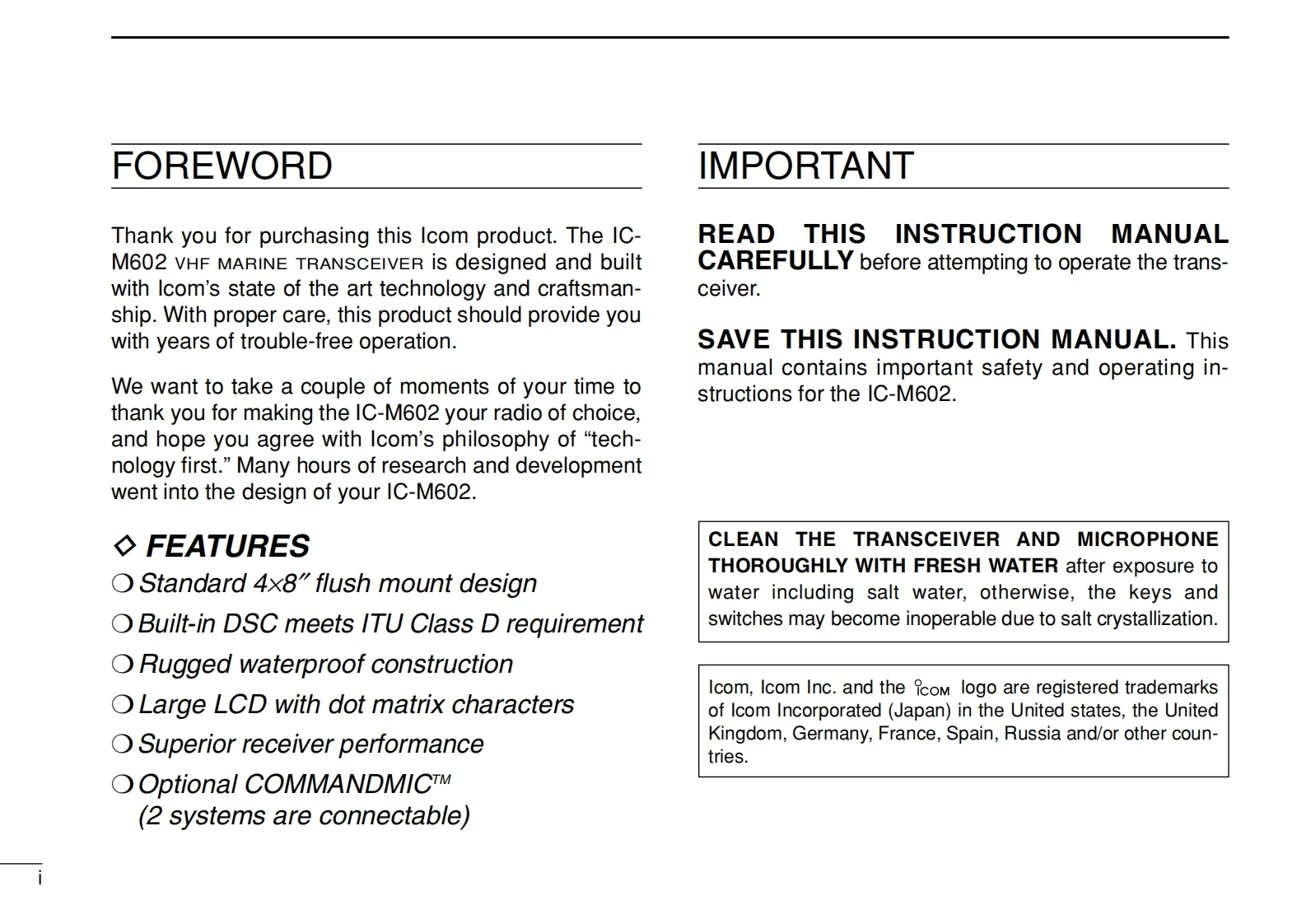 COMINSTRUCTION MANUALVHF MARINE TRANSCEIVERVHF MARINE ICIC-M602姆圈温25wU3TAG16過盟圖ICOM回16This device complies with Part 15 of the FCC rules.Operation is sub-ject to the following two conditions:(1)This device may not causeharmful interference,and(2)this device must accept any interferencereceived,including interference that may cause undesired operation.Icom Inc.
