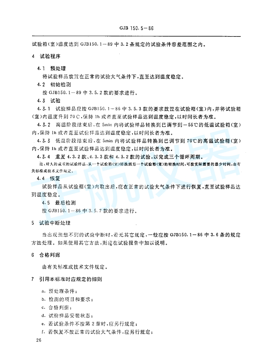 中华人民共和国国家军用标准军用设备环境试验方法温度冲击试验GJB150.5-86Environmental test methods for military equipmentsTemperature shock test本标准规定了军州设备的温度神击试验方法,是制定军用设备技术条件或产品标准等技术文件相应部分的基础和选用依据。GJB150.1一86《军用设备环境试脸方法总则》的规定适用于本标准。本标准适用于可能遇到温度急剧变化环境的军用设备(如飞机不控温机舱设备,或者外挂、空投、空运设备)。本标准不适用于经受暧空气和太阳福射加热后浸入冷水承受温度冲击或受发动机、压气机的气体快速瞬态所引起温度冲击的军用设备。1试验目的确定军用设备在周围大气提度急剧变化时的适应性。2试验条件2.1试验温度:高温为70℃低温为一55℃:。2.2试验温度保持时间:h域者直至试验样品达到温度稳定,以时间长者为准。2.3转换时间:不大于5min。2.4循环次数:3次。3对试验箱(室)的要求本标准应用温度冲击试验箱(室)或采用高温试验箱(室)和低温试验箱(室)进行温度冲击试验,以提供试验样品经受周材空气温度急剧发生变化的环境温度。3.1品温试验箱(室)的娄求,以符台心JB150.3一86《军用设备环境试验方法高温试脸》的第3章各条所规定的要求3.2低温试验箱(望)的要求,应符合GJB150.4一86《军用设备环境试验方法低温试验》的第3章各条所规定的婴求。3.3温度冲击试验箱(室)提供高温试验部份和低温试验部份,应分别符合GJB150.3一86和GJB150.4一86的第3章各条所规定的要求。3.4试验箱(室)的容积应保证在试验样品放入后不超过试验温度保持时间的10%就能使国防科学技术工业委员会1986一12一09发布1987-01-01实施25