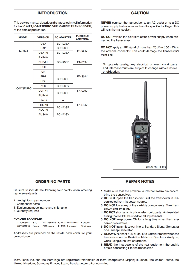 IC-M73-Service-manual维修手册含电器原理图找手册网31天前发布关注私信2.68MB35页034IC-M73-Service-manual维修手册含电器原理图此内容为付费资源,请付费后查看¥19¥21黄金会员免费钻石会员免费登录购买付费资源 第1页 / 共35页 第2页 / 共35页 第3页 / 共35页 第4页 / 共35页 第5页 / 共35页 第6页 / 共35页 第7页 / 共35页 第8页 / 共35页 第9页 / 共35页 第10页 / 共35页 试读已结束,还剩25页,您可下载完整版后进行离线阅读 THE END艾可慕 文本预览 icoMSERVICEMANUALVHF MARINE TRANSCEIVERIC-M73IC-M73EUROS-14919Xz-C1April 2013Icom Inc. 查看更多 收起部分 喜欢就支持一下吧收藏