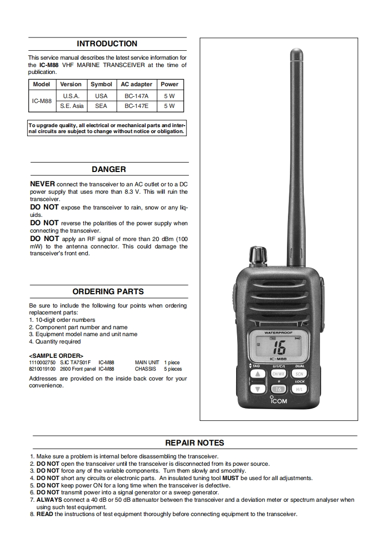 IC-M88-Service-manual维修手册含电器原理图找手册网32天前发布关注私信8.26MB39页044IC-M88-Service-manual维修手册含电器原理图此内容为付费资源,请付费后查看¥19¥21黄金会员免费钻石会员免费登录购买付费资源 第1页 / 共39页 第2页 / 共39页 第3页 / 共39页 第4页 / 共39页 第5页 / 共39页 第6页 / 共39页 第7页 / 共39页 第8页 / 共39页 第9页 / 共39页 第10页 / 共39页 试读已结束,还剩29页,您可下载完整版后进行离线阅读 THE END艾可慕 文本预览 icoMSERVICEMANUALVHF MARINE TRANSCEIVERIC-M88Icom Inc. 查看更多 收起部分 喜欢就支持一下吧收藏