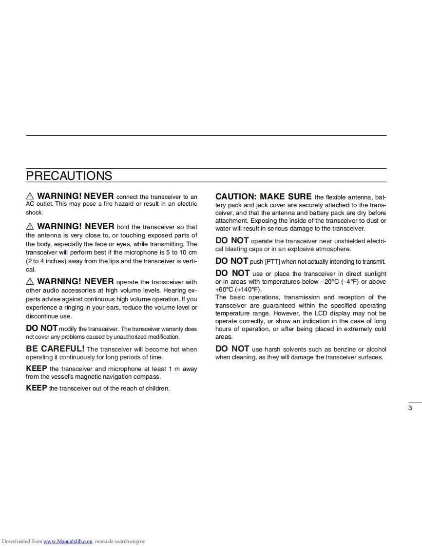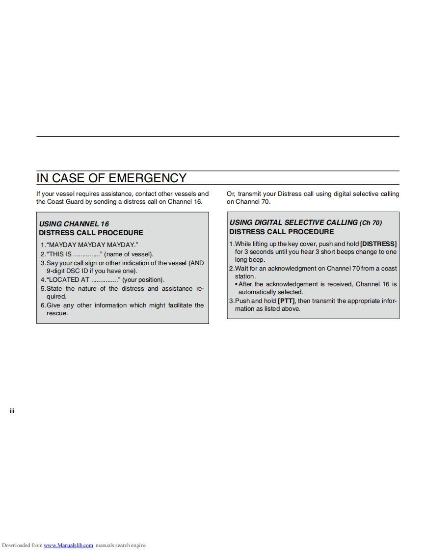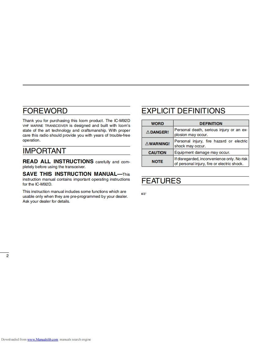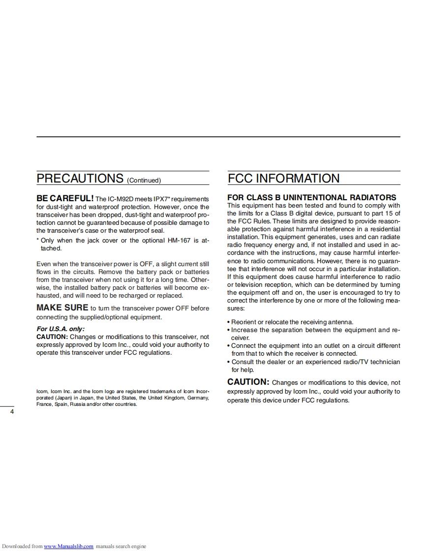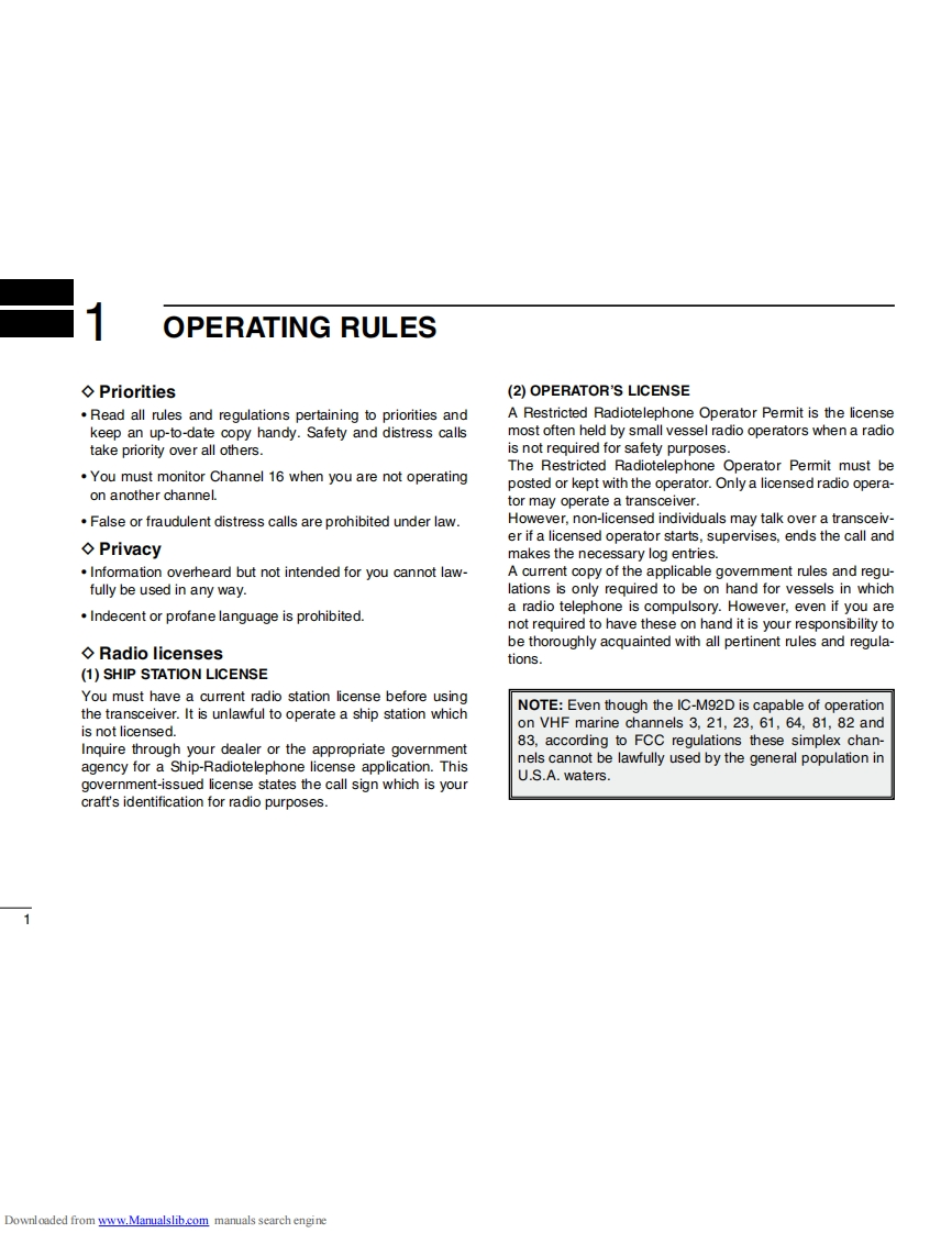 iCOMINSTRUCTION MANUALVHF MARINE TRANSCEIVERIC-M92D回回回回This device complies with Part 15 of the FCCRules.Operation is subject to the condition thatthis device does not cause harmful interference.@)Icom Inc.Downloaded from www.Manualslib.com manuals search engine