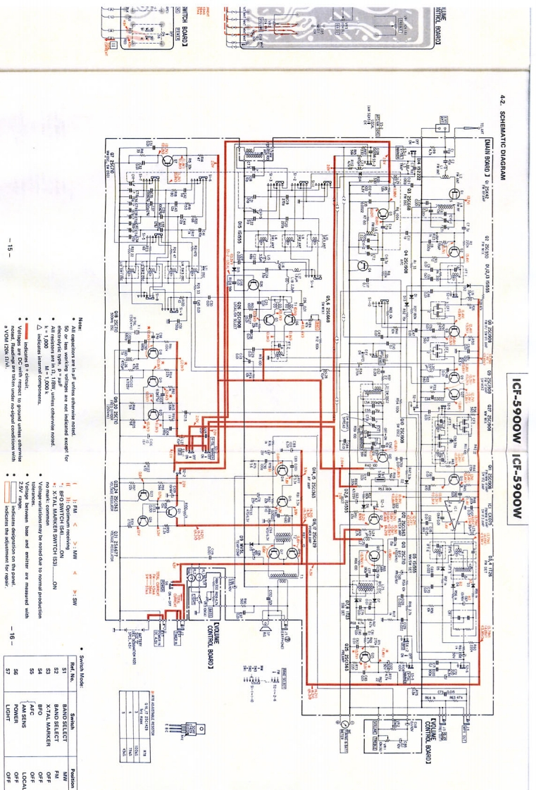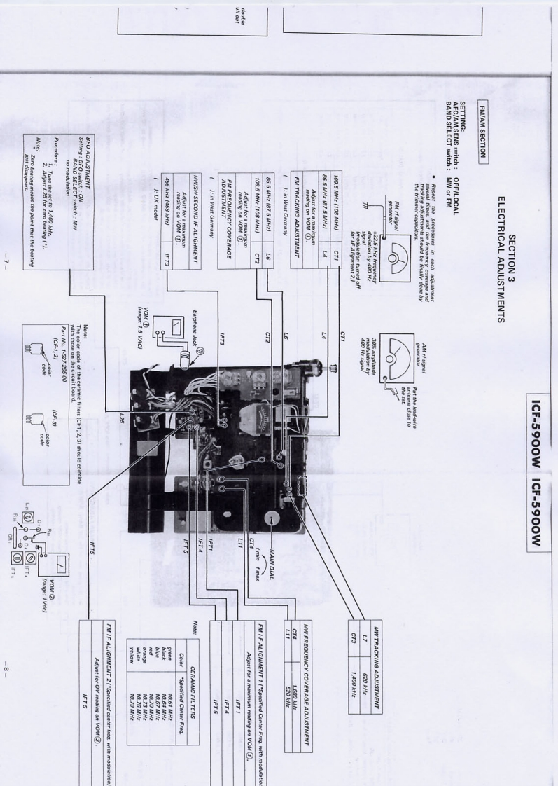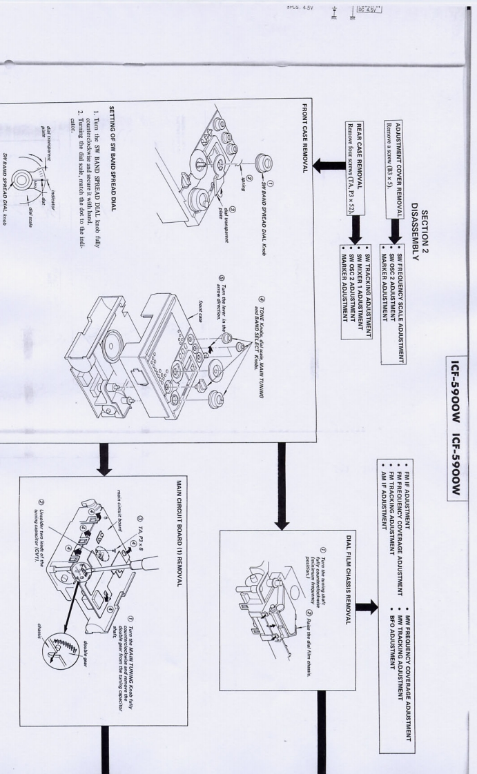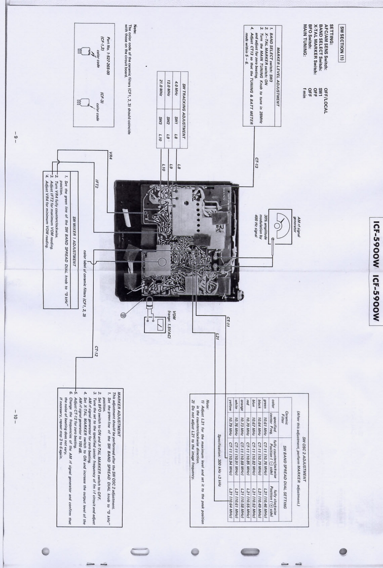ICF-5900WUS ModelCanadian ModelUK ModelAEP ModelE ModelFM/AMMULTI-BAND RECEIVERSPECIFICATIONSPower Requirements:4.5 V dc,three batteries size D(IEC designation R20)US and Canadian Model120 V ac,60Hz with Sony ac power adaptor AC-110UK,AEP and E Model220-240V ac(100,110-127V adjustable)50/60Hz with optional Sony ac power adaptor AC-3WAC-456C (West Germany Model)or 12V car battery with optional Sony car battery cord DCC-127HPower Output:1,900mW de(Total Harmonic Distortion 10%)Power Consumption:US and Canadian Model6W ac (60Hz)with Sony ac power adaptor AC-110UK.AEP and E Model7.4VA(50Hz)6.8VA(60Hz)with optional ac power adaptor AC-3WCircuit Systems:FM/MW:SuperheterodyneSW:Dual conversion superheterodyneFrequency Range:FM:87.5-108 MHzSW1:3.9-10MHz(77-30mlSW2:11.7-20MHz(25.6-15m)SW3:20-28MHz15-10.7mlMW:530-1.605kHzAntennas:FM/SW:Telescopic antenna,external antenna terminalsMW:Built-in ferrite-rod antenna,external antenna terminal0Speaker:10 cm (4 inches)dia.Dimensions:Approx.223(W×234(h)×102(d)mm8%(W)×9%(h)×4(d)inchesSONY(Including projecting parts and controls)Weight:Approx.2.2 kg,4 Ib 7 oz(Including batteries)SERVICE MANUAL