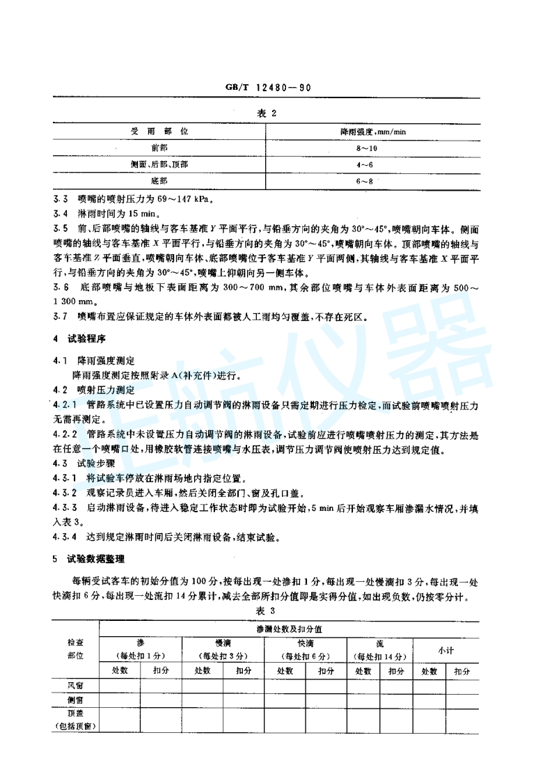 中华人民共和国国家标准客车防雨密封性试验方法GB/T12480-90Rain proof performance'testmothed for buses1主题内容与适用范围本标准规定了客车防雨密封性试验方法。本标准适用于GB3730.1规定的各类客车。双层客车及具有驾驶室和封闭式车厢的汽车可参照使用。2术语及其定义本标准所述客车防雨密封性是指客车处于静止状态,在规定的人工淋雨试验条件下,关闭全部门、窗和孔口盖时,防止雨水进入车厢的能力。2.1渗水从缝隙中缓慢出现,并沿着在内护面上漫延开去。2.2慢滴水从缝隙中出现,并且以少于等于每分钟60滴的速度离开车身内护面,断续地落下。2.3快滴水从缝隙中出现,并且以多于每分钟60滴的速度离开车身内护面,断续地落下。2.4流水从缝隙中出现,并沿着或离开车身内护面连续不断地向周围或向下流淌。3试验条件3.1淋雨试验时,气温应在5℃~35℃,气压应在99~102kP范围内,在室外淋雨试验台上进行试验应选择晴天或阴天,并且风速不超过1.5m/s。3.2淋雨试验时,不设行李舱(箱)的客车规定的车体受雨部位及其降雨强度见表1,设行李舱(箱)的客车规定的车体受雨部位及其降雨强度见表2。表1受雨部位降雨强度,mm/min前围上部8~10侧围上部、后围上部、顶部46注:①前围上部是指车体前部风窗下周边密封胶条下沿至车顶的部分,②侧固上部是指车体侧面侧窗窗框下沿至车顶的部分。③后围上部是指车体后部后窗下周边密封胶条下沿至车顶的部分,国家技术监督局1990-09-08批准1991-06-01实施