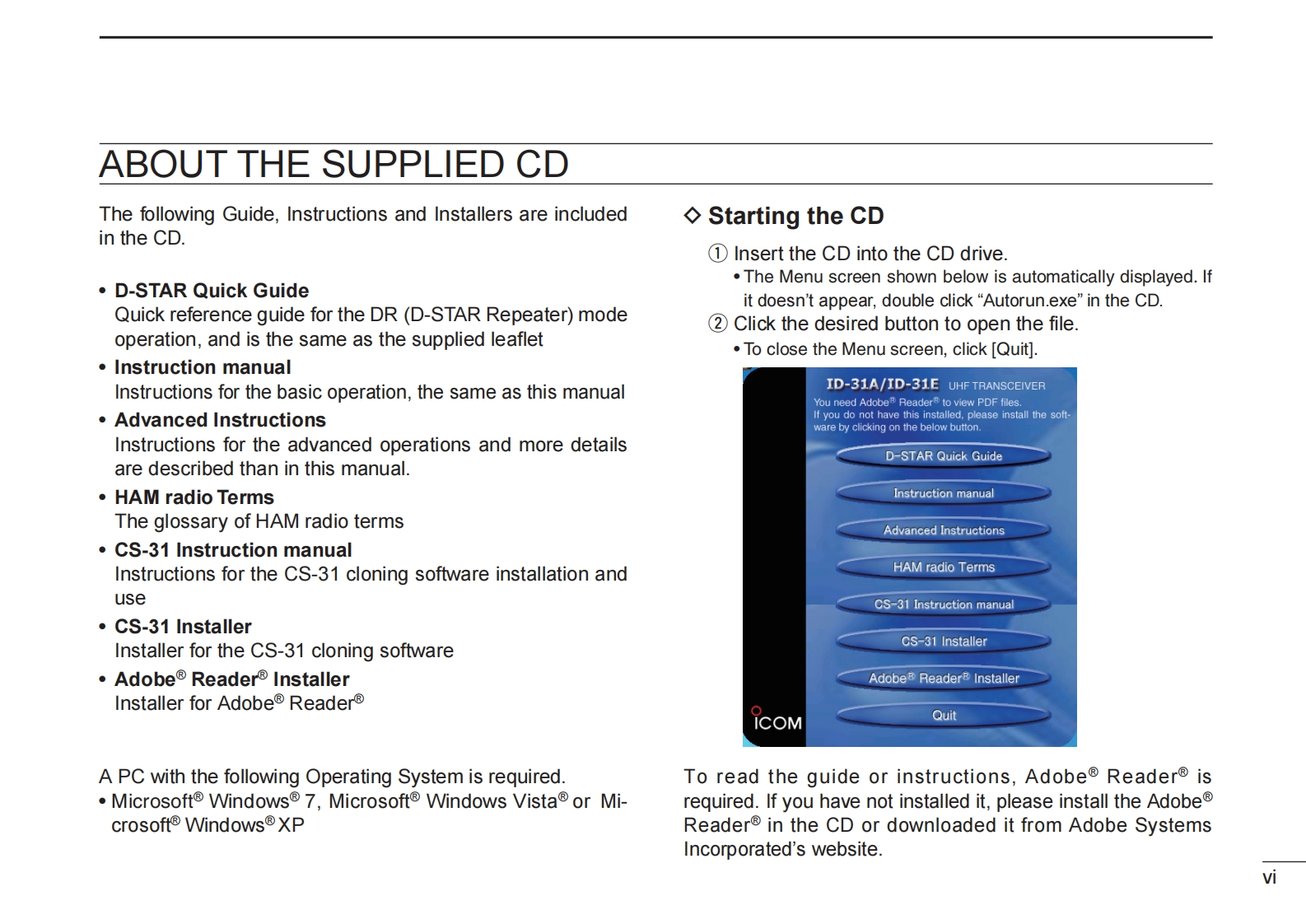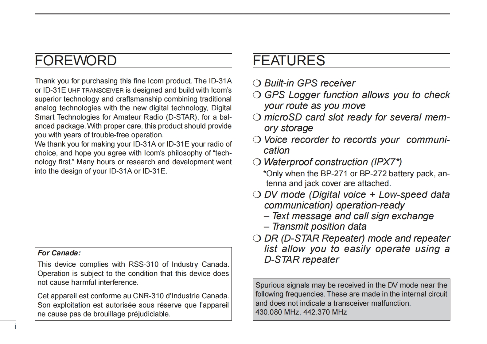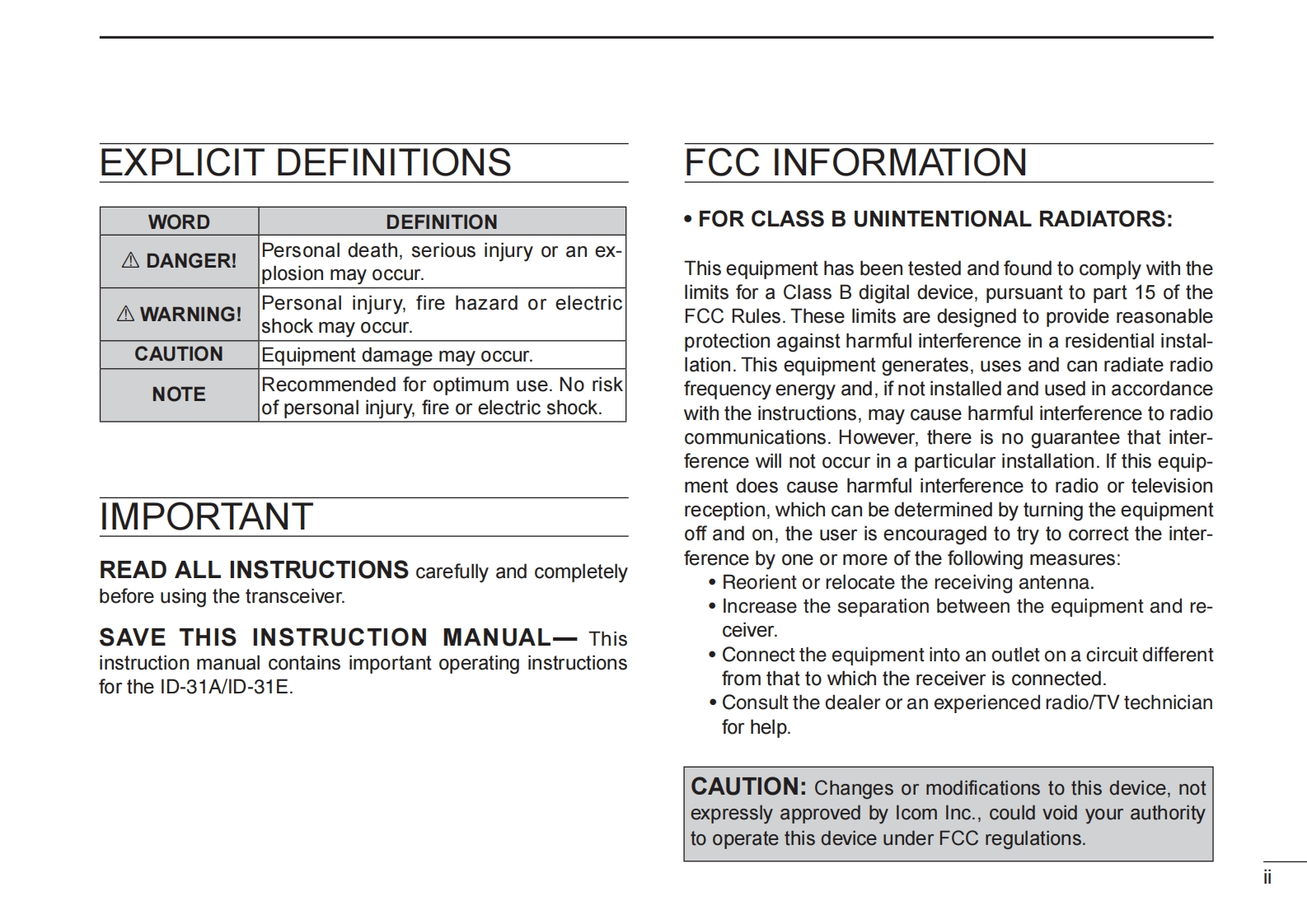 COMINSTRUCTION MANUALUHF TRANSCEIVERID-31AUHF TRANSCEIVERD-31ECOM1D-31EThis device complies with Part 15 of the FCC Rules.Operation issubject to the following two conditions:(1)this device may not causeharmful interference,and(2)this device must accept any interferencereceived,including interference that may cause undesired operation.WARNING:MODIFICATION OF THIS DEVICE TO RECEIVE CEL-LULAR RADIOTELEPHONE SERVICE SIGNALS IS PROHIBITEDUNDER FCC RULES AND FEDERAL LAW.The photo shows theIcom Inc.ID-31E version.