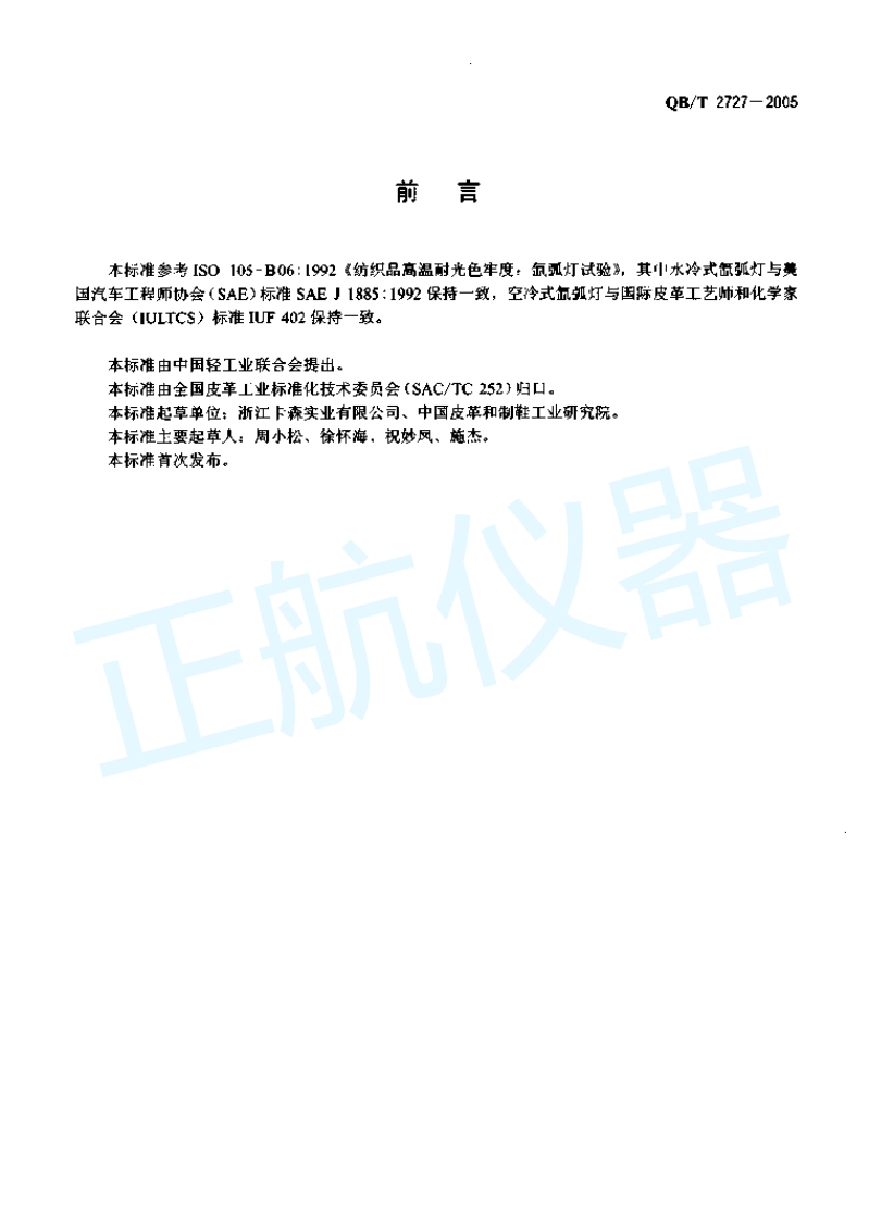 皮革色牢度试验耐光色牢度:氙弧348072@abc6个月前发布关注私信0.17MB6页038皮革色牢度试验耐光色牢度:氙弧此内容为付费资源,请付费后查看¥19¥23黄金会员免费钻石会员免费立即购买您当前未登录!建议登陆后购买,可保存购买订单付费资源 第1页 / 共6页 第2页 / 共6页 试读已结束,还剩4页,您可下载完整版后进行离线阅读 THE END标准规范 文本预览 ICS59.140分类号:Y45各东号:15779-200548中华人民共和国轻工行业标准QBfT2727-2005皮革色牢度试验耐光色牢度:氙弧Leather-Tests for colour fastness-Colour fastness to artificial light:Xenon arc2005-03-19发布2005-09-01实施中华人民共和国国家发展和改革委员会发布 查看更多 收起部分 喜欢就支持一下吧收藏