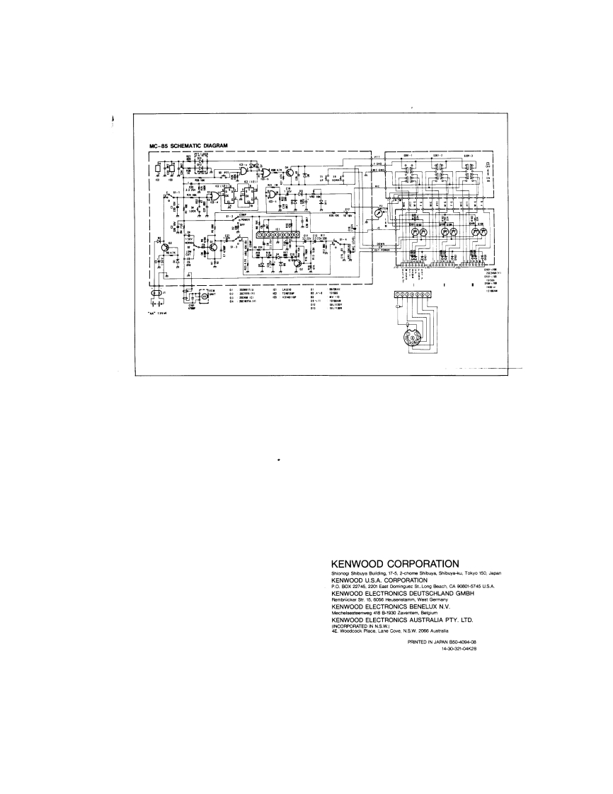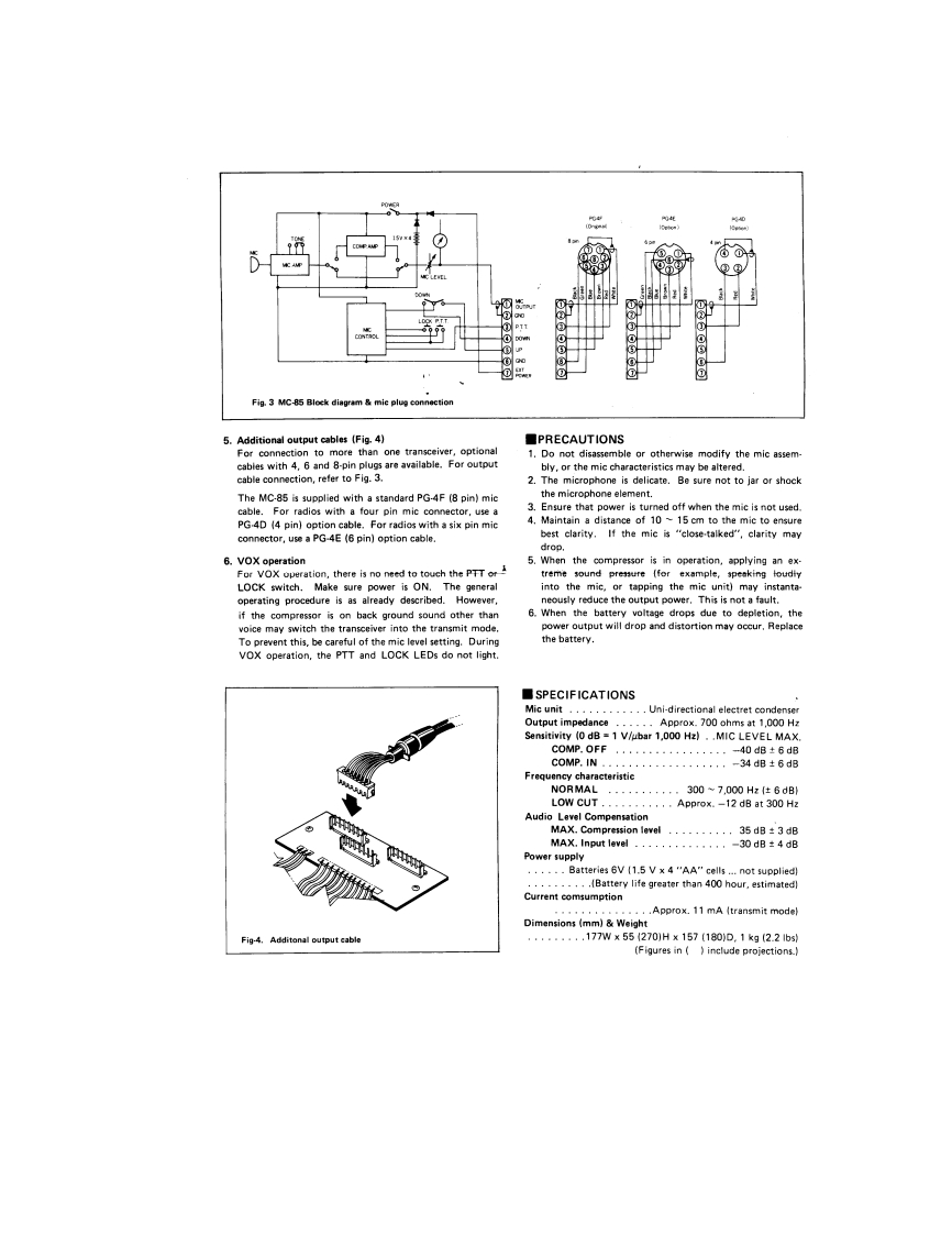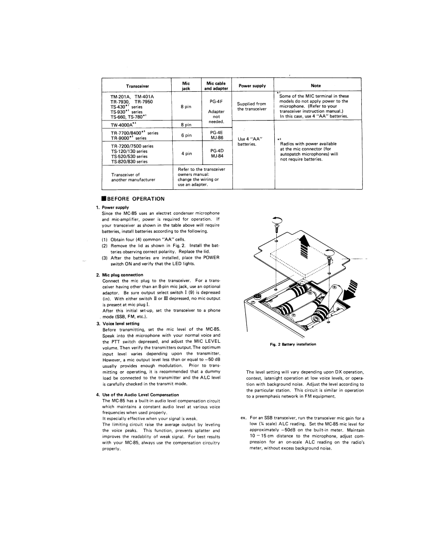 KENWOODCOMMUNICATION MICROPHONEFig-1MC-85G@@①INSTRUCTION MANUAL■FEATURESThe MC-85 is designed for use with a wide range of commu-nication equipment.The microphone's silver and dark graycolors match the various KENWOOD communication units.1.Employs a high quality uni-directional electret condensermicrophone.Gives excellent high frequency characteris-tics and prevent pickup of undesirable noise.2.Complete with an UP/DOWN switch and an electronic①LOCK-PTT switch.3.The microphone has an output select circuit and can beconnected to three transceivers.4.Because of the built-in limiter circuit,voice can be heardmore clearly.This makes it ideal for DX operation.5.Microphone output is indicated by a level meter.6.A sound quality select circuit is provided,which can be7)Audio level compensation controlswitched between DX and local operation.This slide control is used to control the level of the7.Power ON/OFF and transmitting are indicated by LEDsbuilt-in Audio Level Compensation.8)Mic level controlControls and their functions [Fig-1]This slide control is used to control the mic gain.1)Mic unit9)Output telect switchThe MC-85 is a uni-directional electret condenserDepressing the switch selects the output.The outputmicrophone.A windscreen is supplied.cable is connected to I.Therefore depress the I switch.2】GooseneckFor use of switch II or II,an optional PG-4 should beThe MC-85 uses a gooseneck to hold the mie unit.connected to the MC-85.Then,up to three trans.This allows the microphone to be easily repositioned.ceivers can be used with this microphone.3)MODE/POWER switch10)Level meterPlacing the POWER switch on turns on the unit andIndicates the output level.lights the LED(11).Switching to COMP.IN activates11)POWER ON LEDthe built-in compressor.Lights when the power is ON and shows that the MC-854)TONE switchis in the operation.Used to change transmitter sound quality.For normal12)PTT/LOCK LEDcommunications,set the switch to NORMAL.WhenLights when the PTT or the LOCK switch is ON andadditional clarity is needed,set the switch to LOWndicates transmission mode.CUT.13)UP/DOWN switch5)PTT switchThis switch interconnects the transceiver's UP/DOWNDepressing the PTT switch allows transmission and re-functions and shifts the operating frequency up orleasing it switches the unit from transmission to re-down.For a transceiver without an UP/DOWN tuningfunction,the operation of this switch is disregarded.ception.There is no need to depress it forcefully.14)Mic connector6)LOCK switchDepressing the switch once allows transmission.DeThe MC-85 employs a standard 8-pin plug for connec-pressing the switch again returns the unit to the receivetion.When connecting the microphone to a mic jackmode.This switch is used for long transmissionsother than 8-pin,use an adaptor plug.Fig.2 shows theUse either switch (5)or (6)according to the type ofinternal wiring connection.Table 1 shows the relation.communications.When either of these switches is usedship between the microphone and Keno