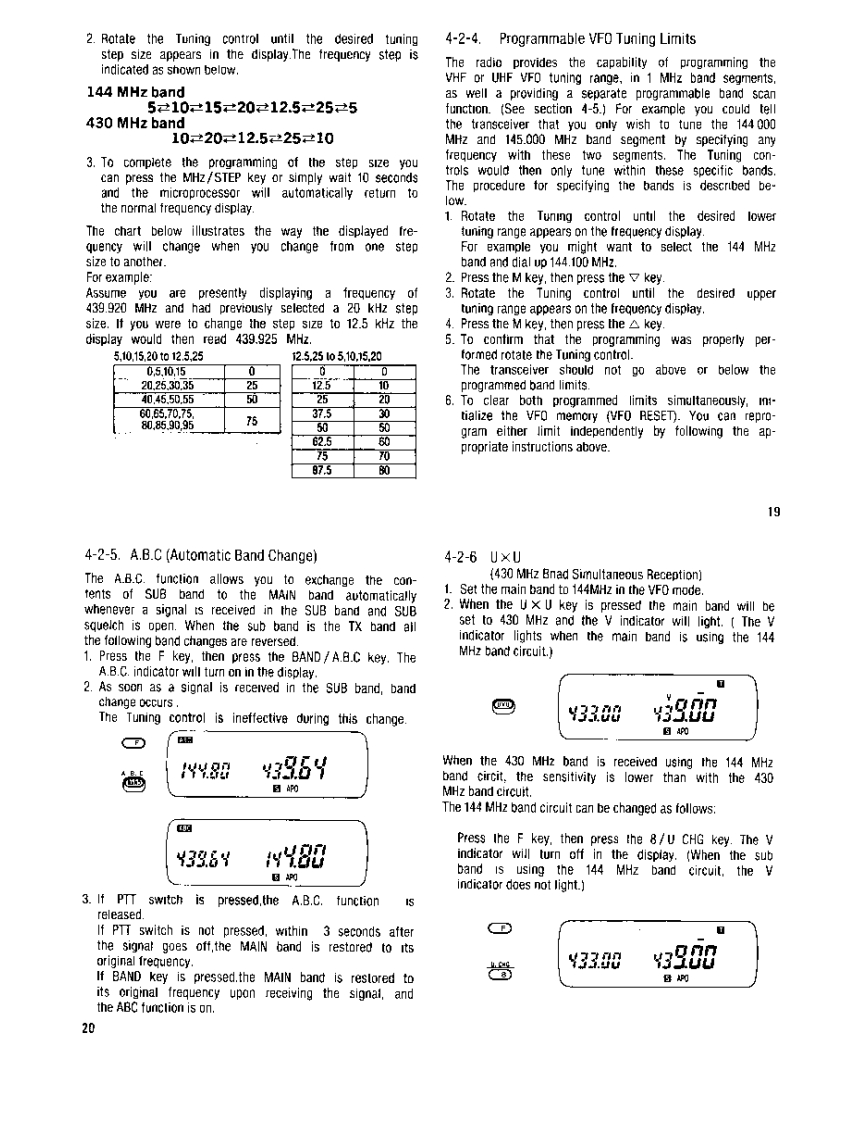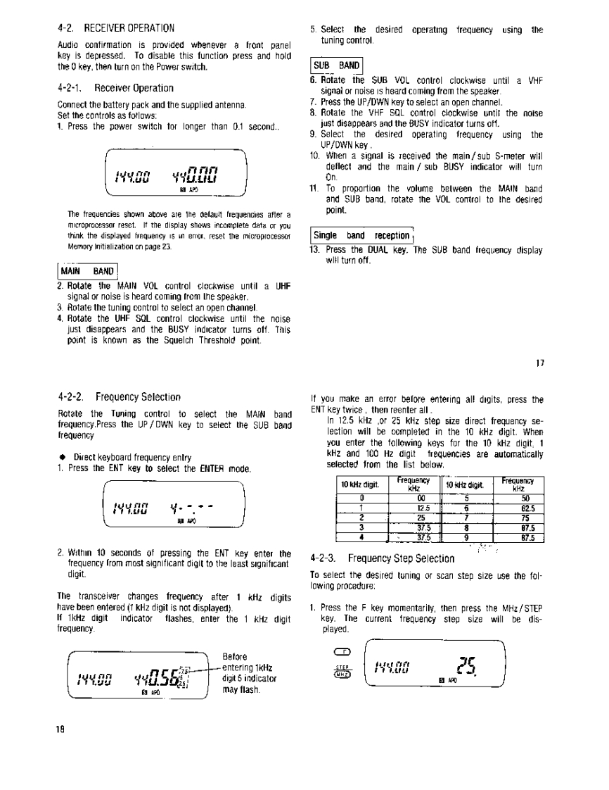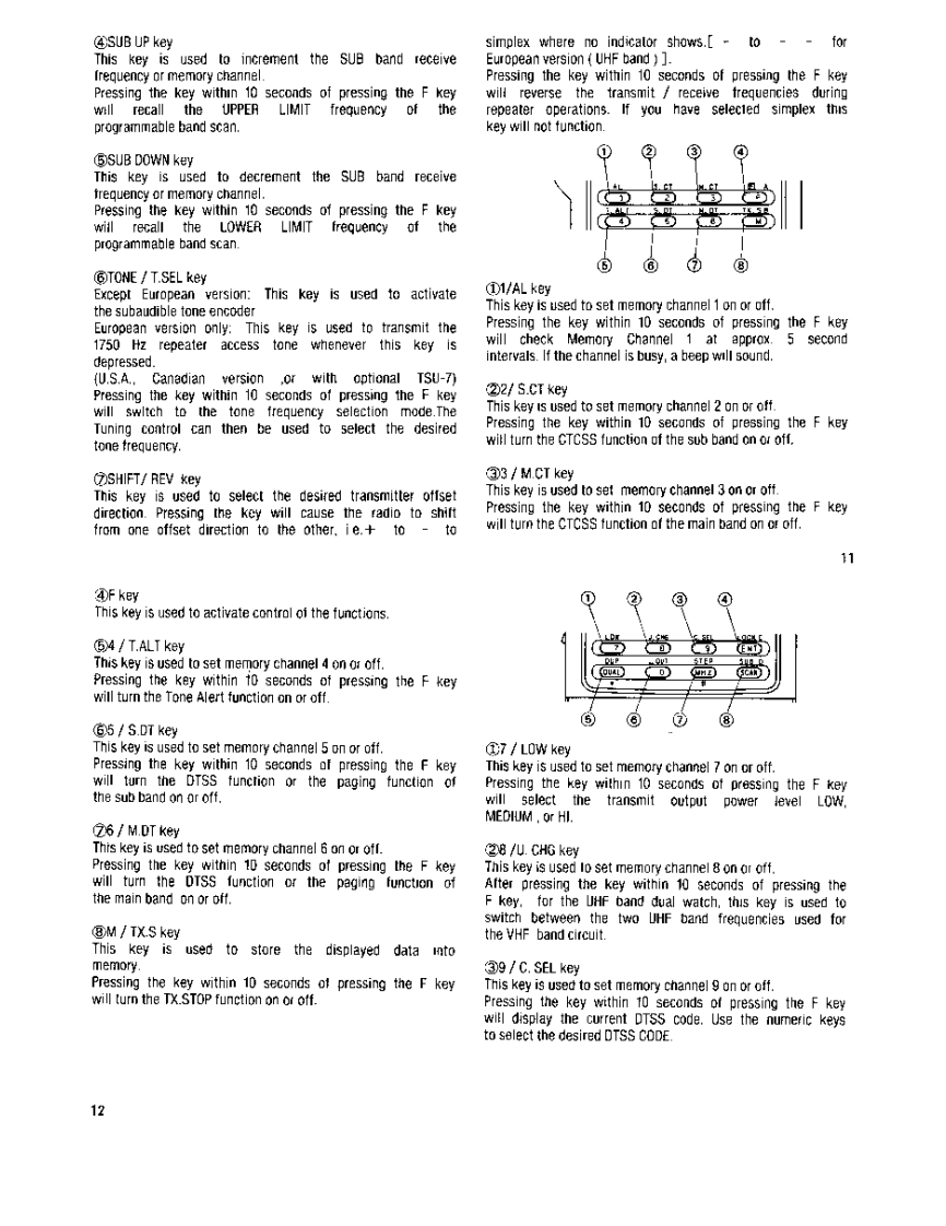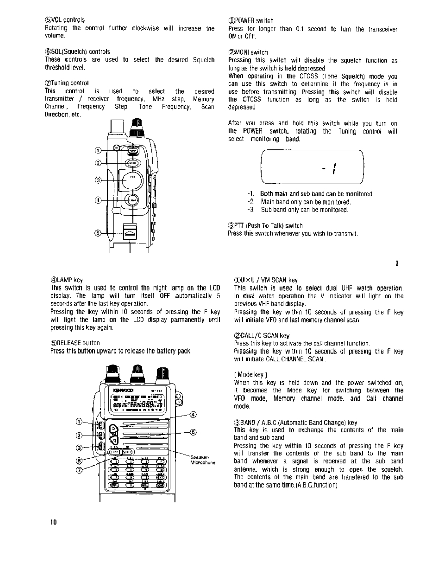 144/430MHz FM DUAL BANDER144/440MHz FM DUAL BANDER谷TH-77A144/430MHz FM DUAL BANDERTH-77EENWOODINSTRUCTION MANUALKENWOOD CORPORATIONOPRINTED IN JAPAN B62-0007-10(ATHK.P.T921211098765432191211b98765FCC WARNINGThis equipment may generate or use radio frequencyenergy.Changes or modifications to this equipmentmay cause harmful interference unlessthemodifications are expressly approved intheinstruchon manual.The user could lose the authorityto operate this equipment if an unauthorized changeor modification is made.Press thepowerswilch forlonger than0.1 secondto turn thetransceiveron or off.CAUTIONDuring fixed station operation,the supplied antenna may causeinterterence to nearby electronic equipment.It can aiso increasethe supply voltage from an external D.C.power supply.To avoidthese conditions,a low gain external antenna can be used.A gaintype antonna can leed to intermodulation distortion.