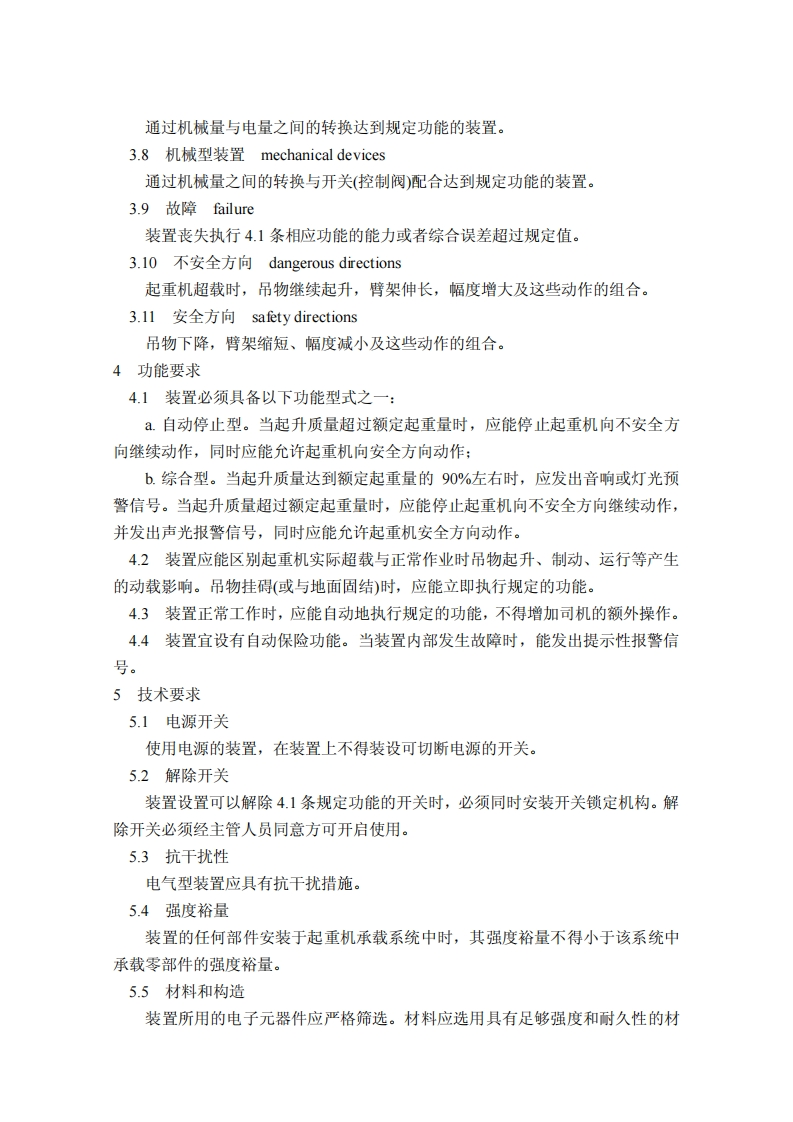 起重机械超载保护装置安全技术规范GB12602-90国家技术监督局1990-12-18发布,1991-12-01实施1主题内容及适用范围本标准规定了起重机械超载保护装置的功能要求、技术要求、试验方法、检验规则和安全管理措施。本标准适用于桥式重机、门式(半门式)超重机、塔式起重机、流动式起重机、门座(半门座)超重机、铁路起重机、电动葫芦、固定式起重机所使用的超载保护装置(以下简称“装置”)。2引用标准GB998低压电器基本试验方法GB4942.2低压电器外壳防护等级GB2423.3电工电子产品基本环境试验规程试验Ca:恒定湿热试验方法3术语3.l超载保护装置safety devices against overloading起重机工作时,对于超载作业有防护作用的安全装置,包括起重量限制器起重力矩限制器。3.2动作点action point装机条件下,是指由于装置的超载防护作用,起重机停止向不安全方向动作时,起重机的实际起重量。试验室条件下,是指判定到装置可以使起重机停止向不安全方向动作时,装置承受的实际载荷值。3.3设定点set point装置标定时的动作点。3.4综合误差combined error装置安装在起重机上,动作点偏离设定点的相对误差。3.5动作误差action error在试验室条件下,装置动作点偏离设定点的相对误差。3.6起重机状态crane configuration起重机在某一工况条件下的外部形状。3.7电气型装置electric devices