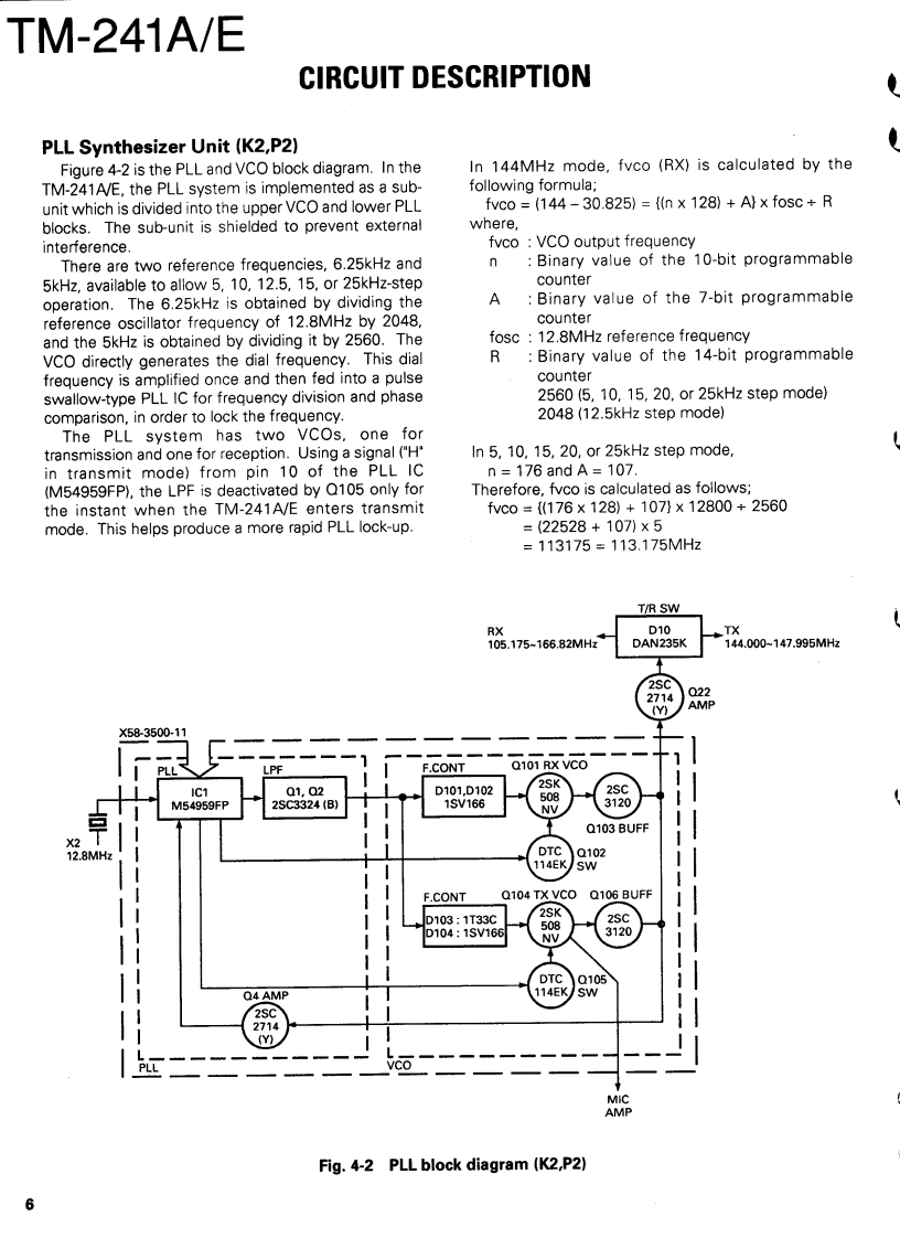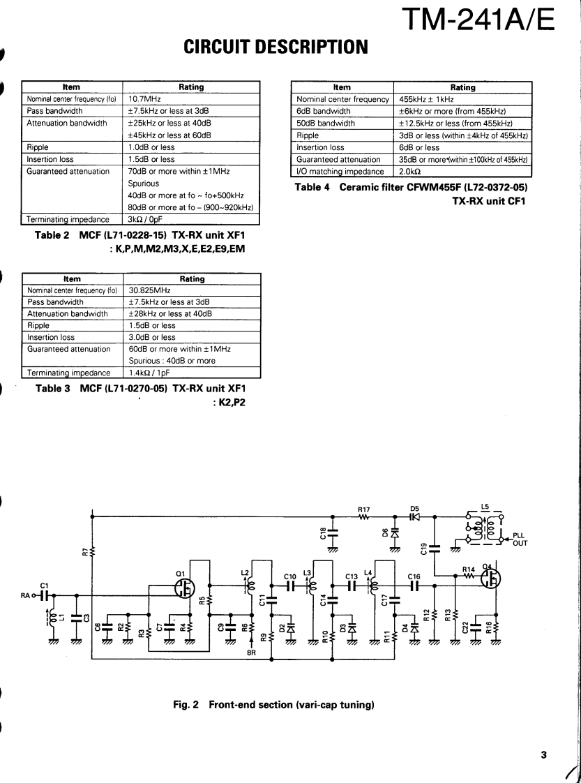 144MHz FM TRANSCEIVERKENWOODTM-241A/ESERVICE MANUALREVISED1994-5 PRINTED IN JAPANB51-8059-10(N)1177This service manual is the same as the ser-Knob (VFO,MR,MHz)Microphone*vice manual (B51-8059-00)for TM-241A/EK27-3035-14)×3(T91-)Panel ass'y"(TM-241A K,P,M,M2 TM-241E:E,E2)desti-(A62-)nations except that this manual contains newitems for (TM-241A:M3.X,K2,P2 TM-241E:Knob (VOL,SQL)E9,EM)destinations.(K29-3157-04)x2Use it together with the previous serviceKnob (LOW)m8nual(B51-8059-001(K27.3067-04)Knob (POWER)(K27-3066-04)KENWOOD4y6.970F28CNNBSKnob (SHIFT)Knob (REV)(K27-3074-14)K27-3072-14Knob (MAIN)Knob (CALL)Knob (F)Knob (TONE)Knob (DR/DT)Mic receptacle(K29-3156-04)(K27-3068-14)(K27-3069-14)(K27-3071-14)(K27-3075-14)(E06-0860-05)Photo is TM-241A.Refer to parts list on page 15.CONTENTSCIRCUIT DESCRIPTION ......2TX-RX UNIT (X57-369X-XX)........................4.4DESCRIPTION OF COMPONENTS11SCHEMATIC DIAGRAM.............................47PARTSBLOCK DIAGRAM........51EXPLODED VIEW.......30LEVELDIAGRAM........54PACKING31DRU-1 (DIGITAL RECORDING UNIT).55ADJUSTMENT...............32DTU-2 (DTMF UNIT)......................63TERMINAL FUNCTION..........37MC-44DM/MC-44DME (MULTI FUNCTIONCIRCUIT DIAGRAMS PC BOARD VIEWSMICROPHONE WITH AUTOPATCH).....................65LCD ASS'Y(B38-0330-05)38MC-44(MULTI FUNCTION MICROPHONE)..........66PLL(X58-3470-00).39MC-44E (MULTI FUNCTION MICROPHONE)........67PLL(X58-3500-11).41TSU-6 (CTCSS UNIT).........................68APC(X59-3130-00)43SPECIFICATIONS....................BACK COVERMIC AMP(X59-3610-00).43