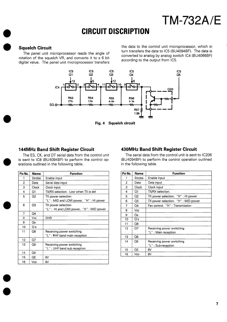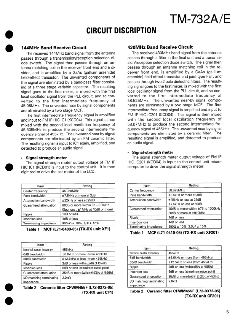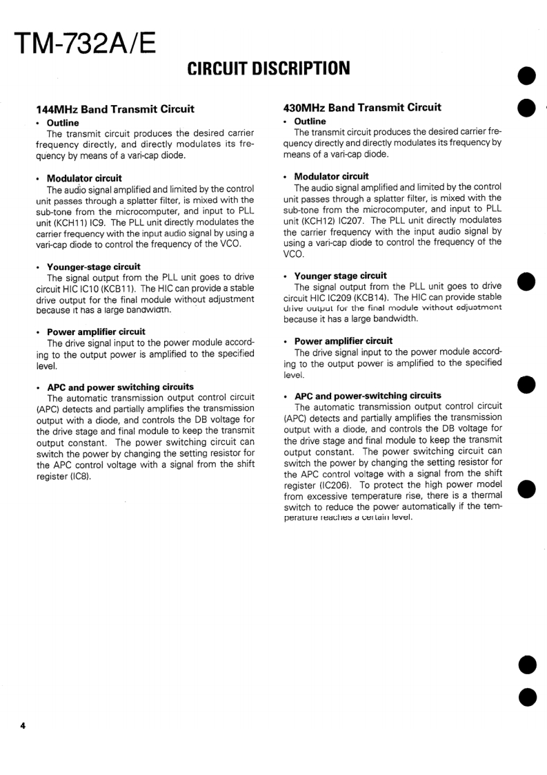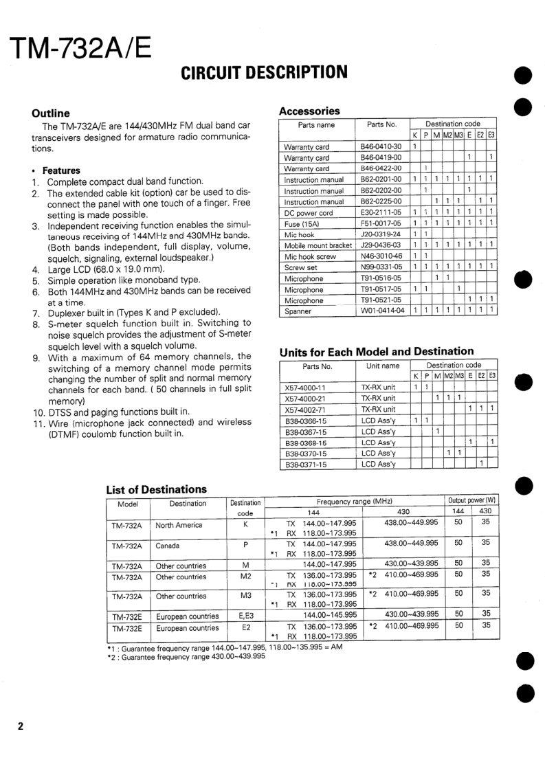 144/440MHz FM DUAL BANDERKENWOODTM-732A/ESERVICE MANUAL1991-11 PRINTED IN JAPANB51-8144-000)1740Knob (VFO)Microphone(K27-3124-03)T91-0516-05)M,M2T91-0517-05)K,P.M3T91-0521-05)E,E2,E3Panel(A62-0174-03)KP,M,M2,M3(A62-0175-03)E,E2,E3Knob (POWER)(K27-3121-04)w6.97025Knob (LOW)(K27-3122-04】w8525Metallic cabinet(BOTTOM)(A01-2051-13Knob (MAIN)Knob (CALL)Knob (SEL)Knob (VOL)(K29-4575-04)×2(K29-3156-04)(K27-3120-04)×6(K27-3123-04Knob (SQL)K29-4576-04)×2CONTENTSCIRCUIT DESCRIPTION .....2CONTROL UNIT (X57-400X-XX)(C/4)..........67SEMICONDUCTOR DATA.......18VOLUME UNIT (X57-400X-XX)(D/4)................70DESCRIPTION OF COMPONENTS2LCD ASSY (B38-03XX-15).70MODIFICATION ........26SCHEMATIC DIAGRAM71PARTS LIST..........27BLOCK DIAGRAM…4EXPLODED VIEW45LEVEL DIAGRAM76PACKING47MC-45 (MULTIFUNCTION MICROPHONE).........77ADJUSTMENT..40MC-45DMTERMINAL FUNCTIONS..56·(MULTI FUNCTION MICROPHONE WITH AUTOPACH )...78PC BOARD VIEWS/CIRCUIT DIAGRAMPG-4K/L(PANEL SEPARATE KIT K 4M,L 7M).....79144MHz TX-RX UNIT (X57-400X-XX)(A/4)........57TSU-7 (CTCSS UNIT).....80430MHz TX-RX UNIT (X57-400X-XX)(B/4)........62SPECIFICATIONS.......BACK COVER