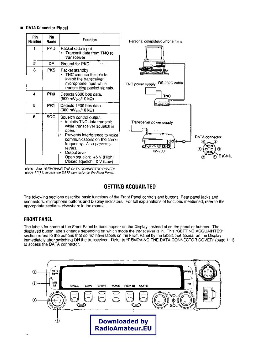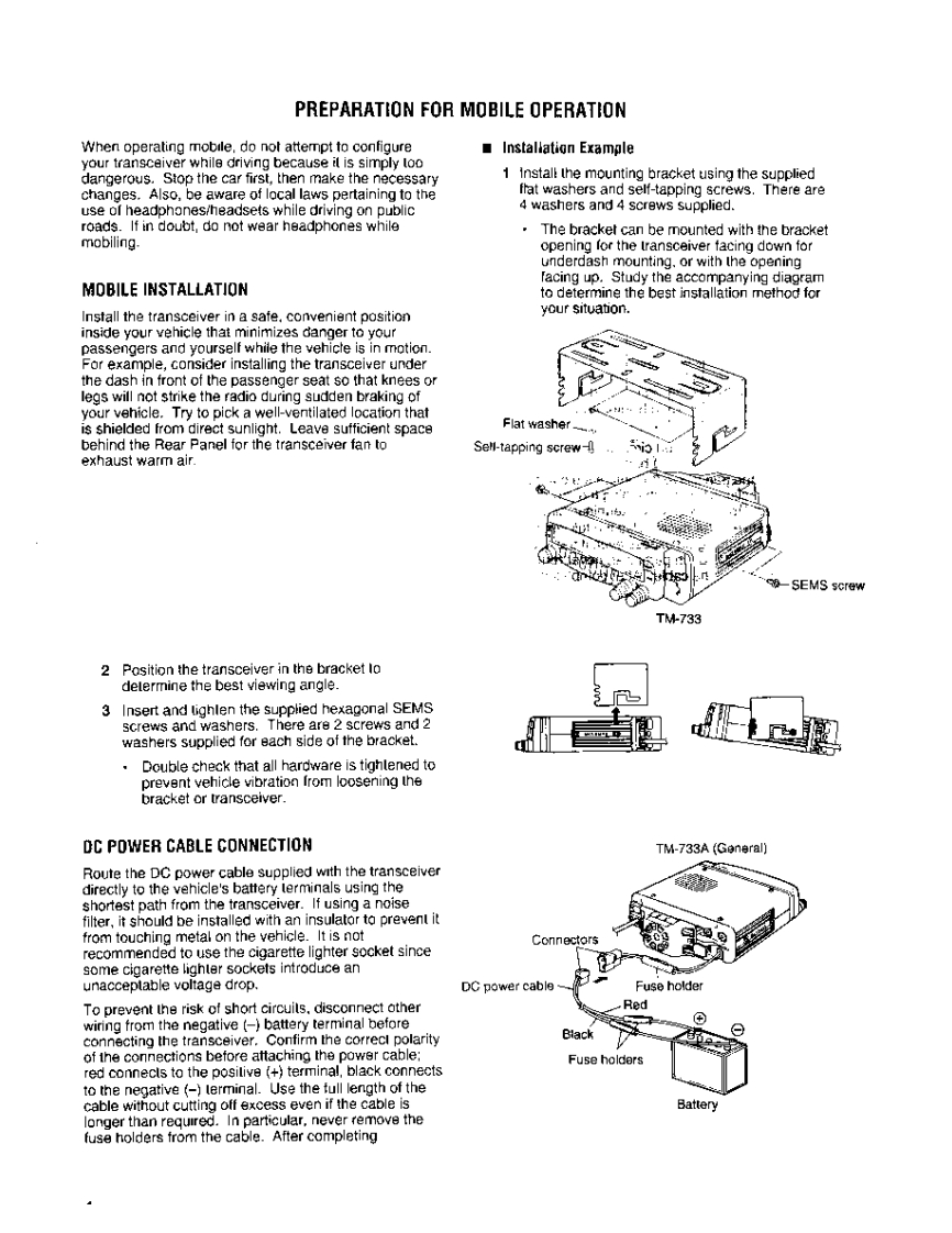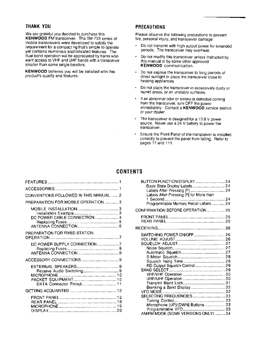 144/440 MHz FM DUAL BANDERTM-733AKENWOOD144/430 MHz FM DUAL BANDERTM-733A144/430 MHz FM DUAL BANDERTM-733EINSTRUCTION MANUALKENWOOD CORPORATIONDownloaded byRadioAmateur.EUOPRINTED IN JAPAN B62-0391-60(K.P,E,M)[MC}95/1211109876543Notlce to the user:Models Covered by this ManualOne or more of the following statements may beTM-733A:144/440 MHz FM Dual Banderapplicable to this equipment.(U.S.A./Canada)TM-733E:144/430 MHz FM Dual BanderFCC WARNING(Europe)TM-733A:144/430 MHz FM Dual BanderThis equipment generates or uses rado frequency energy.Changes or modficalons to this equipment may cause harmfur(General)inlarference unlass the modificalions are expressly approved in theinstruction manual.The user could lose the authority to operate thsequipment if an unauthorited change or modification is made.Note:Functions requiring the microphone keypad,such as RemoteControl.cannot be used without a keypad-equipped microphone.This type of microphone is optonl for cerain transceivar vergions.INFORMATION TO THE DIGITAL DEVICE USER REQUIRED BYTHE FCCThis eguipment hes been tested and found to comply with the limtsfor a Class B digital device.pursuant to Part 15 of the FCC Rules.These fimits are designed to provide reasonable prolecton agenstharmful intertersnce in a residertial instafation.Tms eqtpment genarates.uses and can generate radio frequencyenergy and,if not installod and used in accordance with thenstructions,may cause harmful interierence to radiocommurcations.However.there is no guarantee that theintarforance will not occur in a parcular installation.If thisegurpment does cause harmfuf interference to radio or fetevisionreception,which can be determined by tuming the equipment offand on,the user is encouraged to try to correet the interference byone or more of the following measures:Roorient or relocate the receiving antenna.Increase the separation between the equpment and receiver.Connect the aquipment to an outiet on a circut different fromthat to which the receiver is connecled.Consult the deafer for technical assistance.
