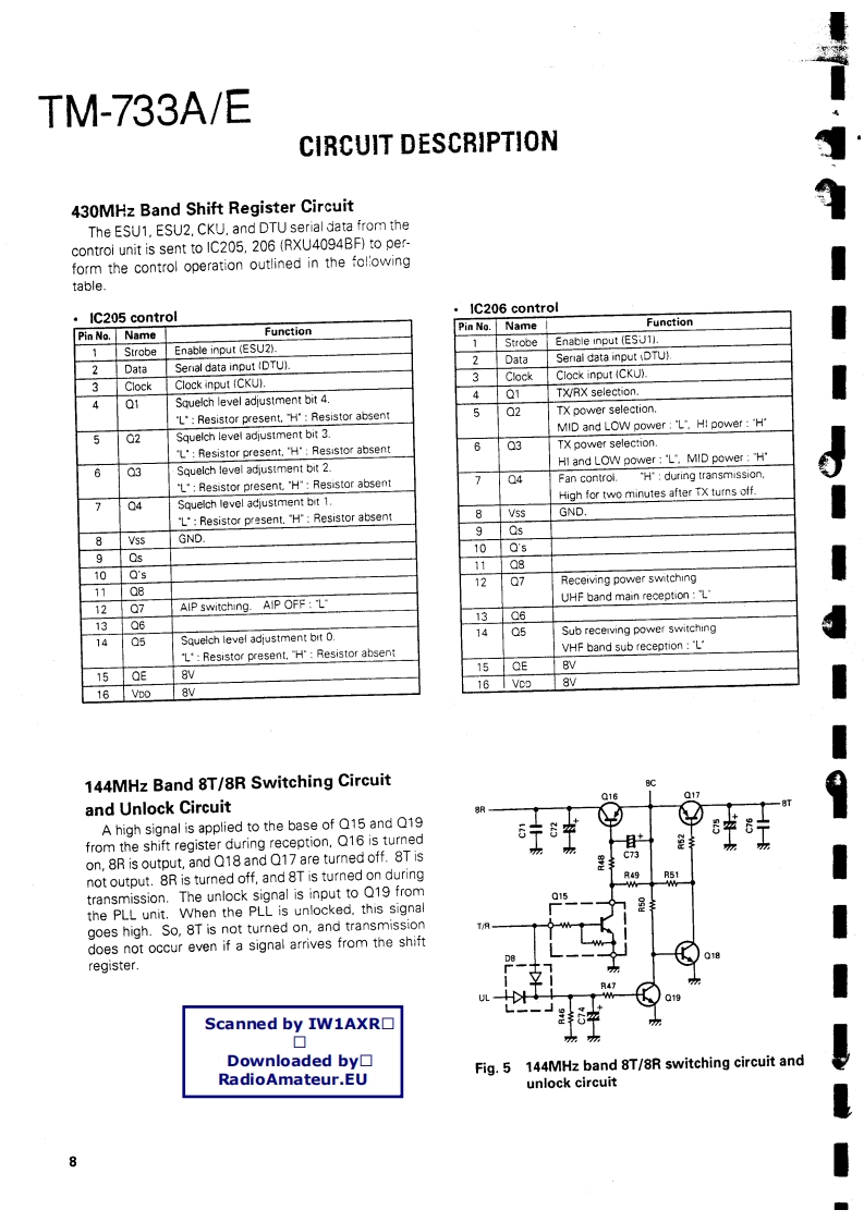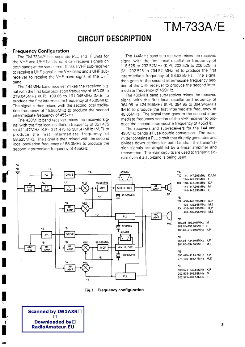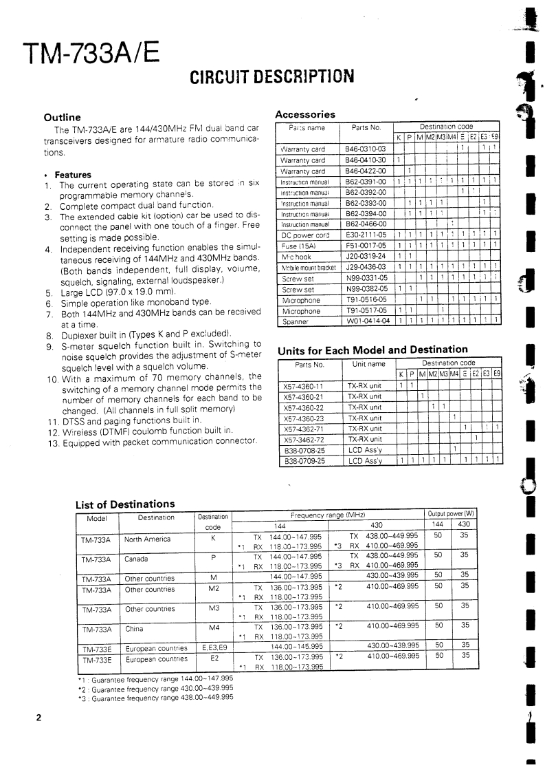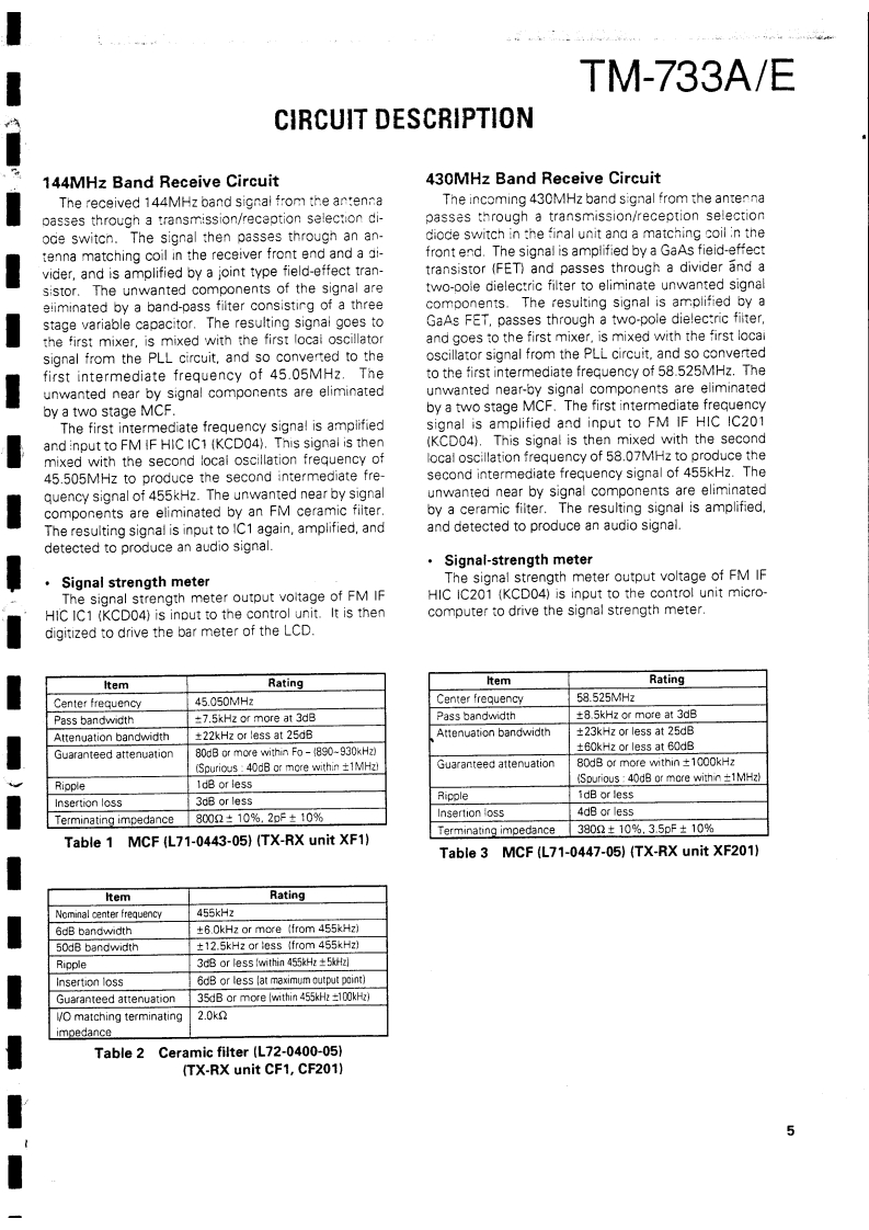 144/44CMHz FM DUAL BANDERKENWOODTM-733A/ESERVICE MANUAL1994-3 PRINTED IN JAPAN651-8254-004N1501KnobKnobPanel ASSYMetallic cabinet (TOP)(K27-3144-04[K27-3142.04)(A62-0281-23(A01-2083-03}KnobCover (DIN)Knob(K27-3141-04)(K27.3143-04(F07-1376-0415coSHIFKnobKnob(K27-3146-041(K29-4888-04)×2KnobKnob(K29-4887-041(K29-4839-041×2CONTENTSCIRCUIT DESCRIPTIONTX-RX UNIT (X57-436X-XX)(B/4,D/4)...........69SEMICONDUCTOR DATA..23TX-RX UNIT(X57-436X-XX(C/4到…73DESCRIPTION OF COMPONENTS ...26LCD ASSY (B38-070X-25)..4PARTSSCHEMATIC DIAGRAM75BLOCK DIAGRAM97PACKING.5LEVEL DIAGRAM.........79ADJUSTMENT...........52TERMINAL FUNCTION......80PC BOARD VIEWS/CIRCUIT DIAGRAMSOPTION (DFK-3B/4B/7B)8TX-RX UNIT (X57-436X-XX)(A/4)...................6SPECIFICATIONS..........BACK COVERScanned by IW1AXR▣QDownloaded byl▣RadioAmateur.EU
