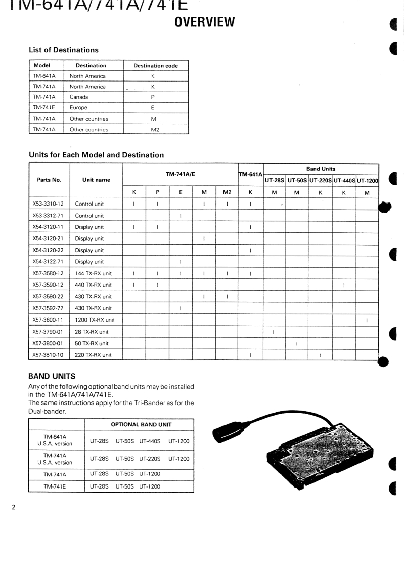 144/220 MHz,144/430 MHz FM MULTI BANDERTM-641AKENWOOLDownloaded byAmateur Radio DirectoryTM-741A/Ewww.hamdirectory.infoSERVICE MANUAL1991-9 PRINTED IN JAPANB51-8139-00(A)1599.MICROPHONET91-1KENWOODFM MULTIBANCET-B4AKNOB (VFO)K27-3078-04)PANEL ASSYA62.JKNOB (MR)-(K27-3079-04)8295:m6978:224988KNOB (MHz)-(0K27-3080-041-KNOB (POWER)K27-3108-04)KNOB-(K293156-04KNOB (RELEASE]K27-3092-041DRESSING PLATEKNOB (SQL]KNOB (VOL)(B03-0562-041K29-4576-04)(K29-4575-041KNOB (CALL)KNOB (SHIFT)KNOB(REV)KNOB(LOW)K27-3110-04K27.3118-04K27.3114-04K27-3116-04BKNOB(F)KNOB (TONE】KNOB (DTSS)KNOB (MUTE)K27-3111-04K27.3113-04K27-3115-04K27-3117-04Refer to parts list on page 62Photo is TM-641ACONTENTSOVER VIEW144MTX-RX UNIT(X57-3580-12)143CIRCUIT DESCRIPTION.3220MTX-RX UNIT(X57-3810-10)147DESCRIPTION OF COMPONENTS.41430/440M TX-RX UNIT (X57-359X-XX)...........151SEMICONDUCTOR DATA.581200MTX-RX UNIT(X57-3600-11)155PARTS LIST61BLOCK DIAGRAM.....159EXPLODED VIEW105LEVEL DIAGRAM167PACKING....110DTU-2 (DTMF UNIT)171ADJUSTMENT ....113TSU-7(CTCSS UNIT)....173PC BOARD VIEWS SCHEMATIC DIAGRAMMC-45 (MULTI FUNCTION MICROPHONE).....175CONTROL UNIT (X53-331X-XX).126MC-45DM (MULTI FUNCTION MICROPHONEDISPLAY UNIT (X54-312X-XX)128WITH AUTOPATCH).......176SCHEMATIC DIAGRAM..........129PK-4K/L (PANEL SEPARATE KIT K:4M,L:7M).17728MTX-RX UNIT(X57-3790-01)133UT-28S/50S/1200 SPECIFICATION...........17850MTX-RX UNIT(X57-3800-01)....139SPECIFICATION...........................BACK COVER