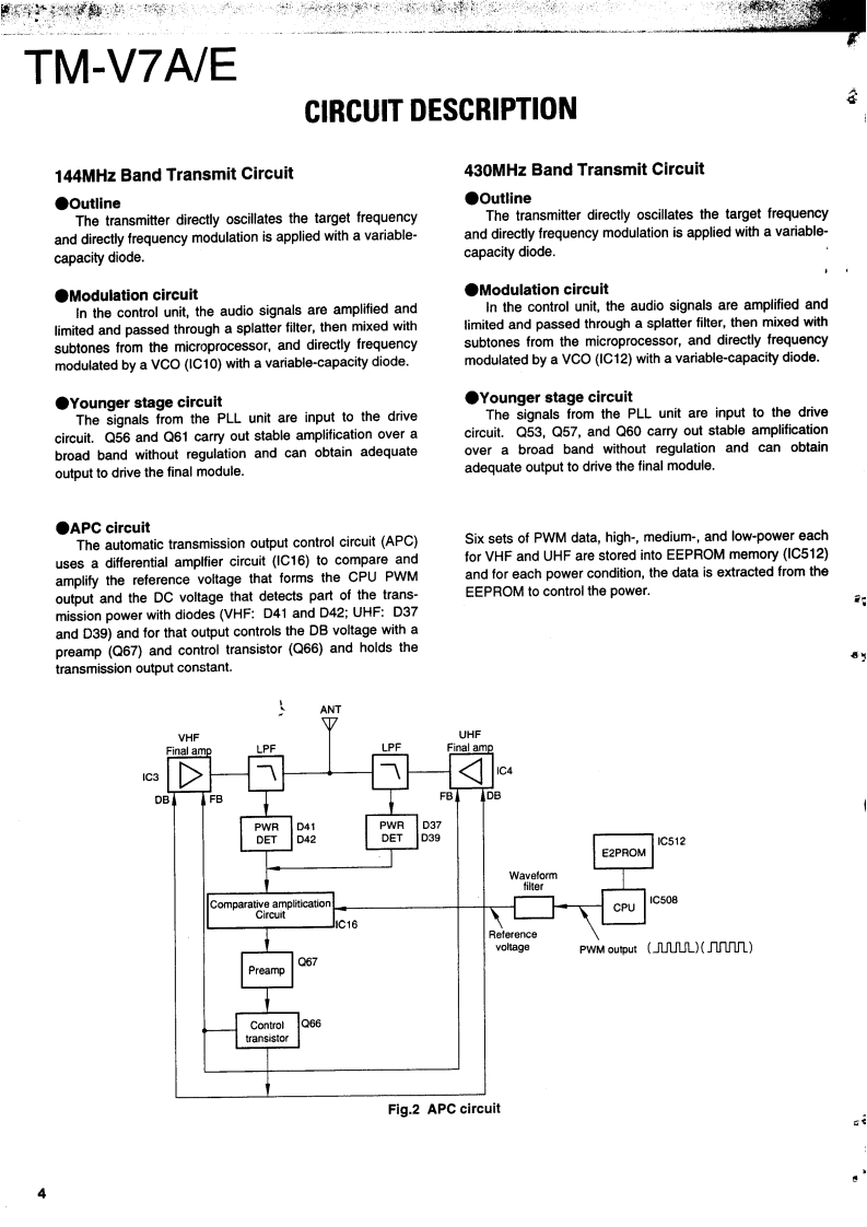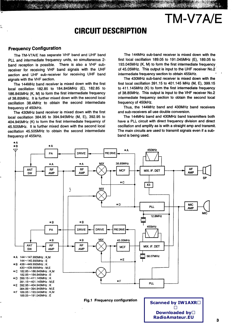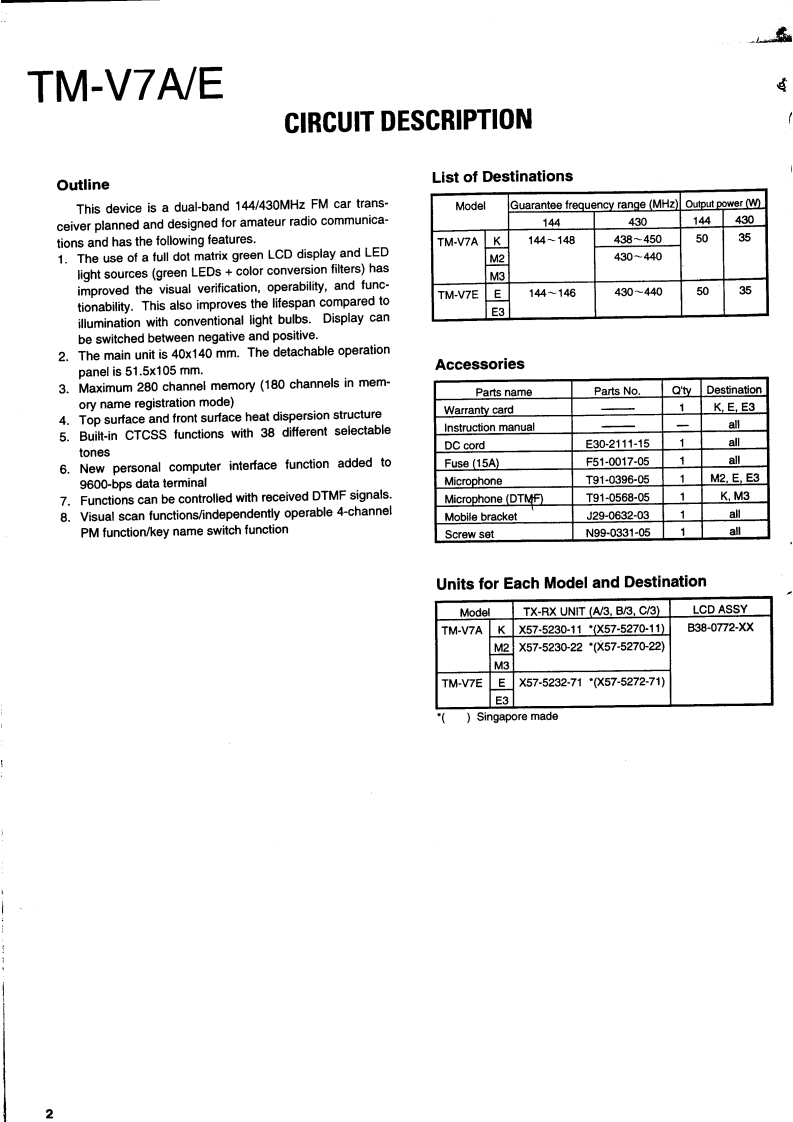 144/430MHz FM DUAL BANDERKENWOCTM-V7A/ESERVICE MANUAL1996-11 PRINTED IN JAPAB51-8348-00(B)1100Scanned by IW1AXR▣Microphone assy▣(T91-0568-05):K,M3Downloaded by□RadioAmateur.EUMetallic cabinet(Upper)(A01-2122-13)NKENWOODKnob (PM)(K27-3168-23)KENWOOD FM DUAL BANDEKnob (MNU)TM.V7Knob (VFO)_(K27-31603(K27-3166-23)9Knob (MR)(K27-3167-23)146.970448.625EF-EEMNCover (DIN 6P)(f07-1428-23)Sub panelKnob (MAIN)Panel assyKnob (VOL)Knob (SQL)(A22-0798-11)】(K29-5133-03)(A62-0492-33)(K29-5134-03)(K29-5135-03)Button knob(MAIN,PUSH)(K27-3172-03)Photo is K TypeCONTENTSCIRCUIT DESCRIPTION…mPC BOARD VIEWSEMICONDUCTOR DATA…19LCD ASSY(B38-0772-15)52DESCRIPTION OF COMPONENTS...........23TX-RX UNIT (X57-52XX-XX)(A/3)..........53TERMINAL FUNCTION..26TX-RX UNIT (X57-52XX-XX)(B/3)..........57PARTS LIST.…29TX-RX UNIT (X57-52XX-XX)(C/3)..........59EXPLODED VIEW........40SCHEMATIC DIAGRAM.....61PACKINGAlBLOCK DIAGRAM69ADJUSTMENT42WIRING DIAGRAM ...71LEVEL DIAGRAM......72OPTIONS(DFK-3C/DFK-4C/DFK-7C)........73SPECIFICATIONS.…Back cover
