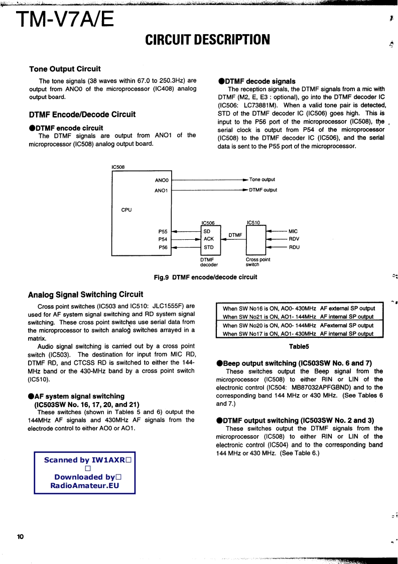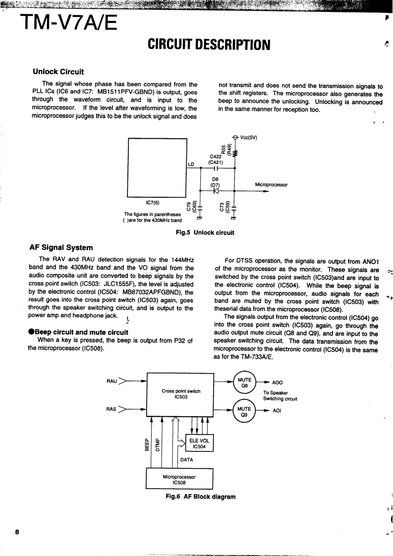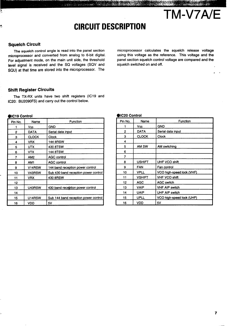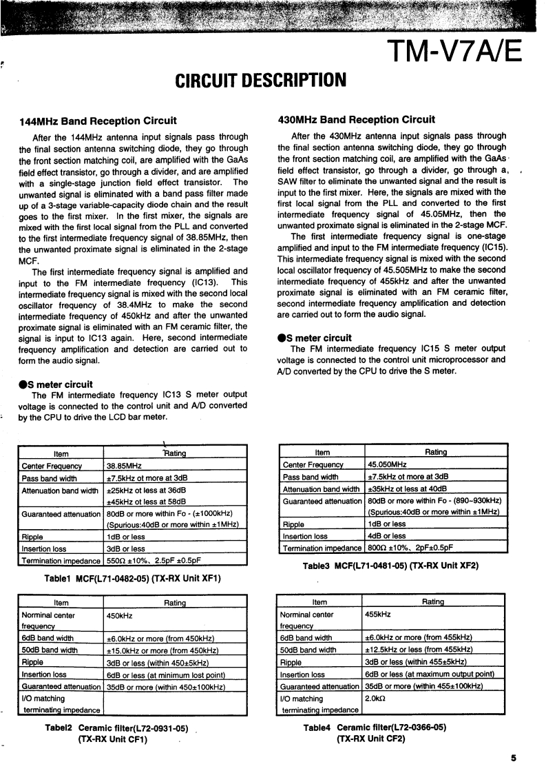 144/430MHz FM DUAL BANDERKENWOCTM-V7A/ESERVICE MANUAL1996-11 PRINTED IN JAPAB51-8348-00(B)1100Scanned by IW1AXR▣Microphone assy▣(T91-0568-05):K,M3Downloaded by□RadioAmateur.EUMetallic cabinet(Upper)(A01-2122-13)NKENWOODKnob (PM)(K27-3168-23)KENWOOD FM DUAL BANDEKnob (MNU)TM.V7Knob (VFO)_(K27-31603(K27-3166-23)9Knob (MR)(K27-3167-23)146.970448.625EF-EEMNCover (DIN 6P)(f07-1428-23)Sub panelKnob (MAIN)Panel assyKnob (VOL)Knob (SQL)(A22-0798-11)】(K29-5133-03)(A62-0492-33)(K29-5134-03)(K29-5135-03)Button knob(MAIN,PUSH)(K27-3172-03)Photo is K TypeCONTENTSCIRCUIT DESCRIPTION…mPC BOARD VIEWSEMICONDUCTOR DATA…19LCD ASSY(B38-0772-15)52DESCRIPTION OF COMPONENTS...........23TX-RX UNIT (X57-52XX-XX)(A/3)..........53TERMINAL FUNCTION..26TX-RX UNIT (X57-52XX-XX)(B/3)..........57PARTS LIST.…29TX-RX UNIT (X57-52XX-XX)(C/3)..........59EXPLODED VIEW........40SCHEMATIC DIAGRAM.....61PACKINGAlBLOCK DIAGRAM69ADJUSTMENT42WIRING DIAGRAM ...71LEVEL DIAGRAM......72OPTIONS(DFK-3C/DFK-4C/DFK-7C)........73SPECIFICATIONS.…Back cover