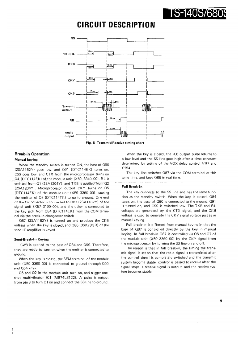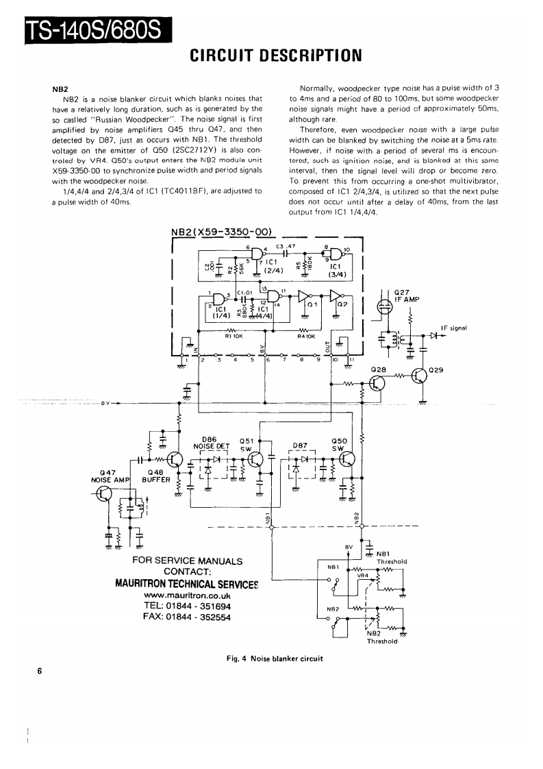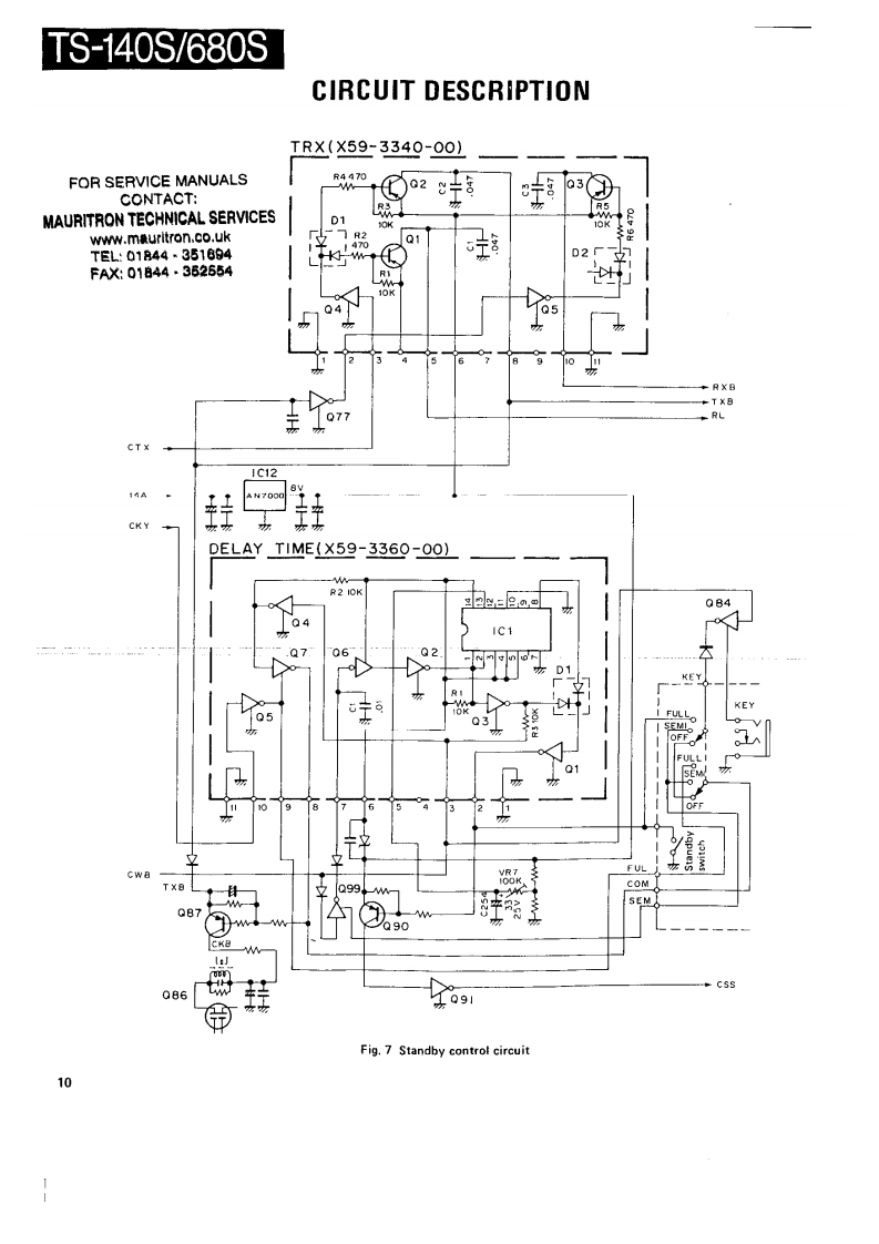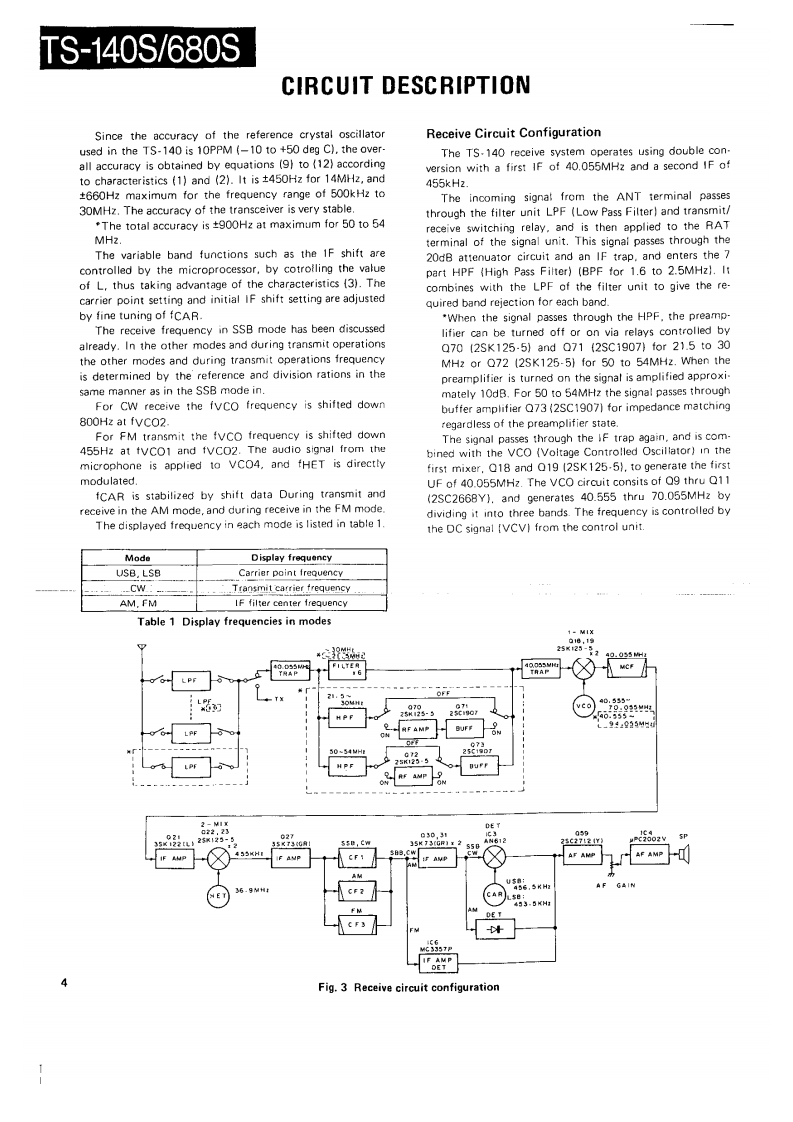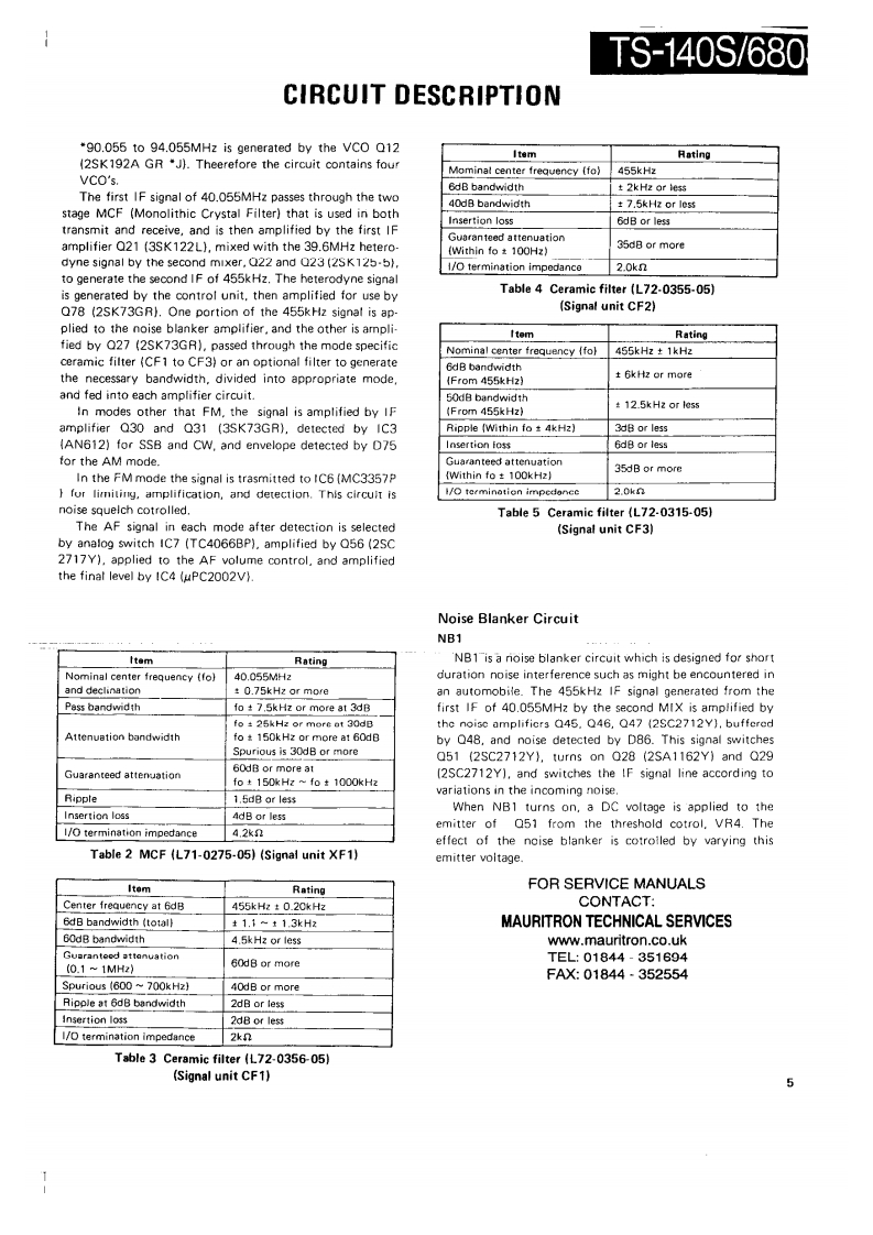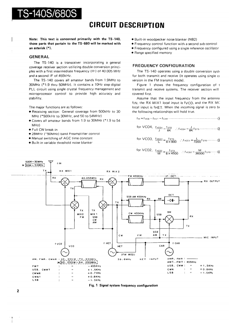 HF TRANSCEIVER/MULTI BANDERTS-140S/680SSERVICE MANUAL1987-11 PRINTED IN JAPANB51-3337-00(0)1573Phone jockKnoKnobKaobCaseiUpper!KnobPanet ass'y'{E11-041305引{K29-3090-041(K29-3089-049(K29.3084-04)(401-1032.02){K290741341×2IA20-)长nobnobPush knobXnobFront arassMain knobKnobK29-309104)K29-0758-1411K29-3080-14}4日10-)1K210778-02】[K29-30B1041(K230710041x2(K29-307804)¥¥2阳60Knobn0为Kn0边KnobKnob4E07.0852.15)(K29-3092-041gK29-3088041[K29-3085-04)(K29309304】x2(J02.0442-04)【K29-3079-041×4KnabKnobKnobKnobKnobKnob(K29-3094-041×61K29-3087-0451K293086041{×293083.041[K29-3082.041fK29-3094-04}x4"Refer to parts list on page 42.CONTENTSCIRCUIT DESCRIPTION20 ELAY TIME X59-33G0.00)...,...,101,110SEMICONDUCTOR DATA.,..,..·.,..,,.,·.22SGNA1U114¥3/3100-001:TS-80S......,102DESCRIPTION OF COMPONENTS..,,...·..··.32TERMINAL FUNCTIONS.......·106PARTS LIST,,,··:41PC BOARD VIEWS/CIRCUIT DIAGRAMDISASSEMBLY,.,,...,..·..,,,.········.75SIGNAL UNIT (X57.3200-XX):TS-140S··..111PACKING.....,···,,·79SWITCH UNIT (X11-3030-XX).115LEVEL DIAGRAM,,,,......,,,,.··80FINAL UNI (X3100-XX]116ADJUSTMENT·.··,:81FANX.337001··,,········,··116BLOCK DIAGRAM (TS-680S)91FILTER UNIT (51.3040-XX]117BLOCK DIAGRAM (TS-140S)93DISPLAY UNIT 1X54-3050-XX]119PC BOARD VIEWS/CIRCUIT DIAGRAMSCHEMATIC DIAGRAM (TS-140S)121CONTROL UNIT (X53-3100-XX)...124,。95SCHEMATIC DIAGRAM (TS-680S]SIDE TONE{X59-1060-00)101,110YK.455C-1 CW FILTER)...·..,,.·,.·.·..127V0X(X59.1080-00)....,.110TU-8 (TONE UNIT]...128FM MIC AMP.(X59-3000-02)101,1101F.10C (INTERFACE KIT)132TR×(X593340-001...,,101,110SPECIFICATIONS134NB2(X59-3350-00101,110FOR SERVICE MANUALSCONTACTMAURITRON TECHNICAL SERVICESwww.mauritron.co.ukTEL:01844-351694FAX:01844-352554