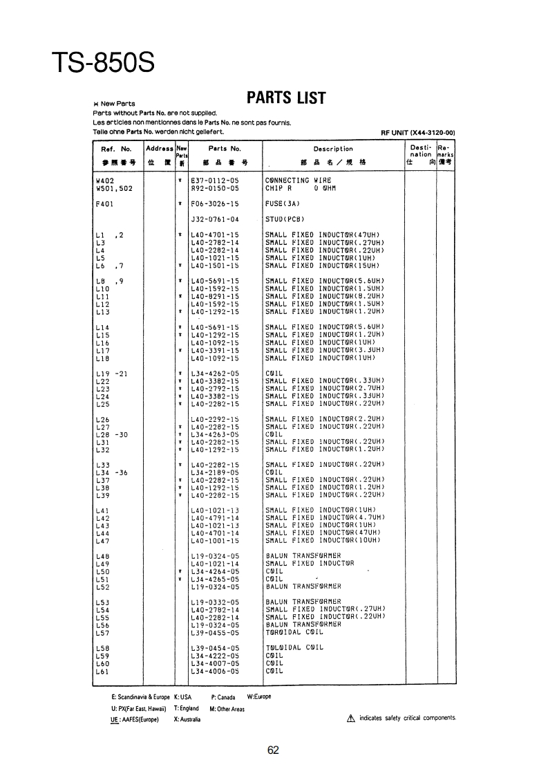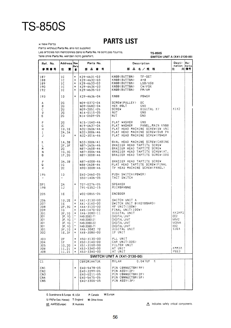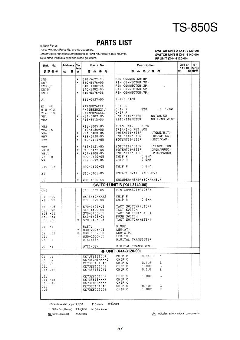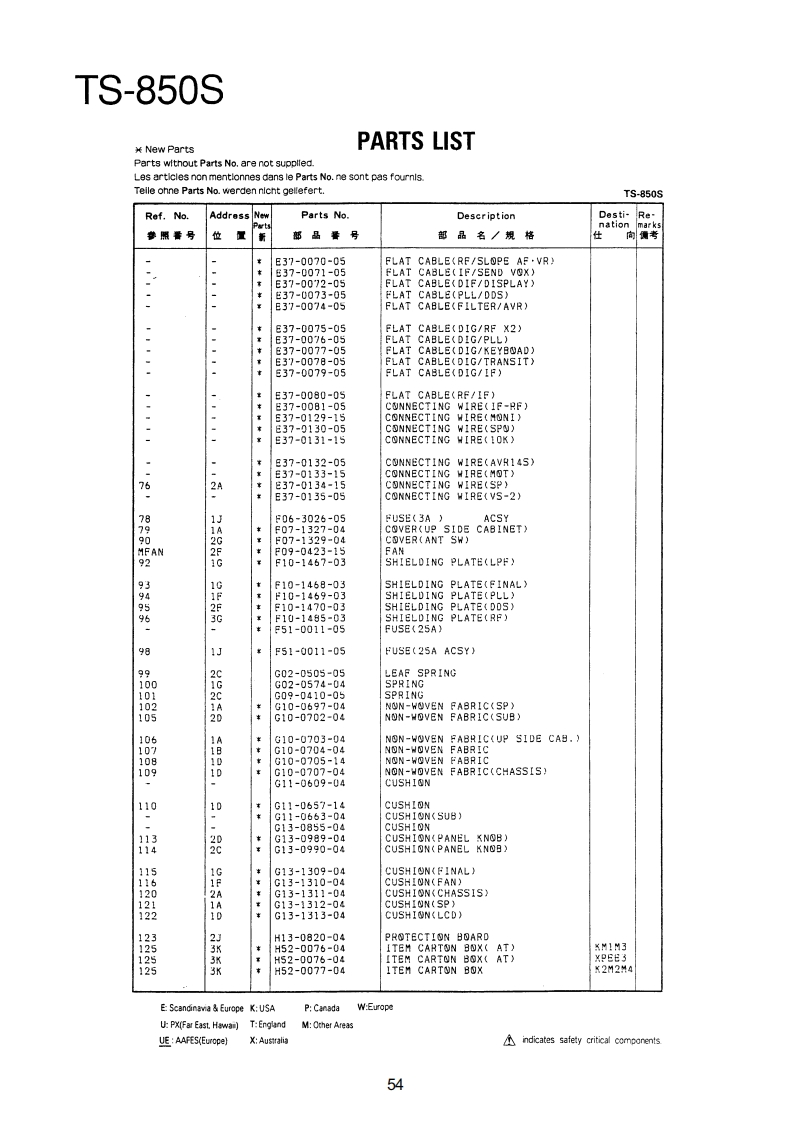 TS-850SPARTS LIST¥New PartsParts wlthout Parts No.are not supplled.Les articles non mentlonnes dans le Parts No.ne sont pas foumls.Telle onne Parts No.werden nicht gellefert.TS-850SRef.NoAddressNeParts No.DescriptionDesti-Renation位品号部品名/规格向考TS-850S1日A01-2014-01METALLIC CABINET(TOP)A01-2015-D110850METALLIC CABINET(BOTTOMXA22-0775-02SUB PANELA40-0630-03BOTTOM PLATEA62-0043-03PANELA62-0045-02PANEL ASSY789025-器A82-0002-02REAR PANEL10458810-1159-03FRONT GLASS日11-0466-04FILTERB38-0350-15LCD ASSY342-3343-04LABEL(S/NO)944-2163-04LABEL(UPC CORD)846-0410-30WARRANTYCARDKK2KKKKK日46-0419-00WARRANTY CARDEE283846-0419-00WARRANTYCARD日46-0422-00WARRANTYCARD862-0061-00INSTRUCTION MANUALKK2XX2651561631313185666161600019213141545771KKKKK日62-0062-001NSTRUCTI⑤N MANUALMM2M3日名2=00春)=001NsTR山CT10NMANUALMA口口762-0062-00MANUALB62-0062-00INSTRUCTION MANUALE4362-0063-00MANUAL862=0063-00INSTRUCTIONMANUALE4K1K18139862-0065-00MANUALB72-0120-04MODEL NAME PLATE(TS-8505)KK2XX2872-0120-04M四0ELNAMEPLATE(TS-8505)PP2性M2B72-0120-04MODEL NAMEPLATE(TS-8505)N34甜272-0223-04MODEL NAMEPLATE(TS-850S)72-0223-04MODEL NAMEPAT513=5505032-0416-04E04-0167-05RF COAXIAL CABLE RECEPTACLE07-0751-05DIN PLUGACSYE07-1351-0513P ROUND PLUGACSYPIN PLUGRTTYANT日30=3035.05DC CABLE31-2154-0时CONNECTING WIRE(CAL>:831-0081-05CONNECTING WIRE(IF-RF)E31-6117-09CONNECTINGHIRECEINAL/ANTIK2州2M483i-6117-05CONNECTINGWIRE(FINAL/ANTX2P2E2E31-6117-05CONNECTING WIRE(FINAL/ANTE437-0060-05CONNECTINGWIRE(RF/PLL)E37-0061-15CONNECTING WIRECCAR/RE)7-88:9CONNECTINGWIRE(RF/PLL>CUNNECTINGWIRE(CAR/IF)WIRE(CAR/PLL)CONNECTINGWIRE(CAR/PLL,ANT/RFg37=0066=09的VNECTING HIRECR台/F1NAL3E37-0067-05CONNECTINGWIRE(RF/IF)E37-0068-05FLAT CABLE(IF/NB PROC AGC)E37-0069-05FLATCABLE(RF/RITNOTC·VRE:Scandinavia Europe K:USAP:CanadaW:EuropeUP%MF制Ea5tHwa司T:EnglandM:Other AreasUE AAFES(Europe)indicates safety critical components.53