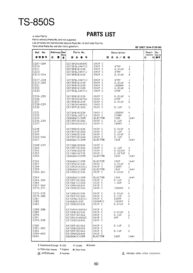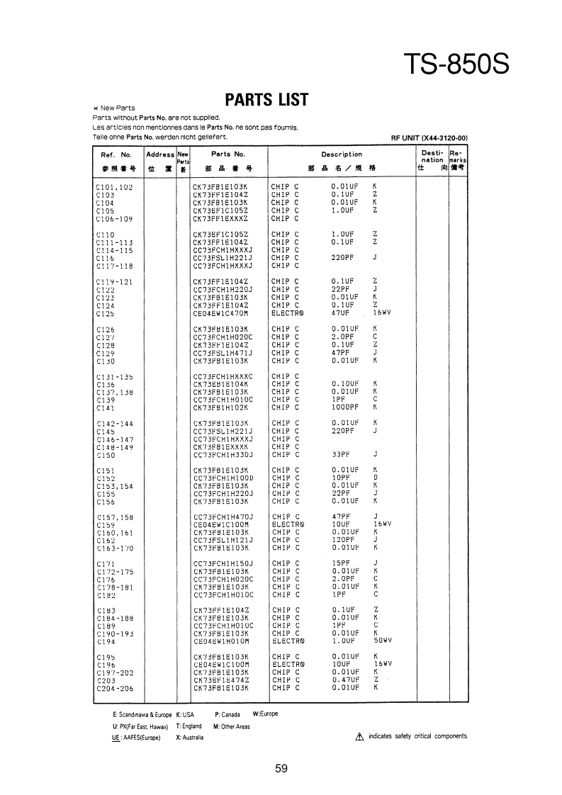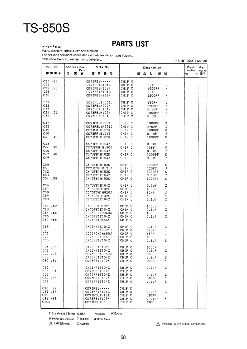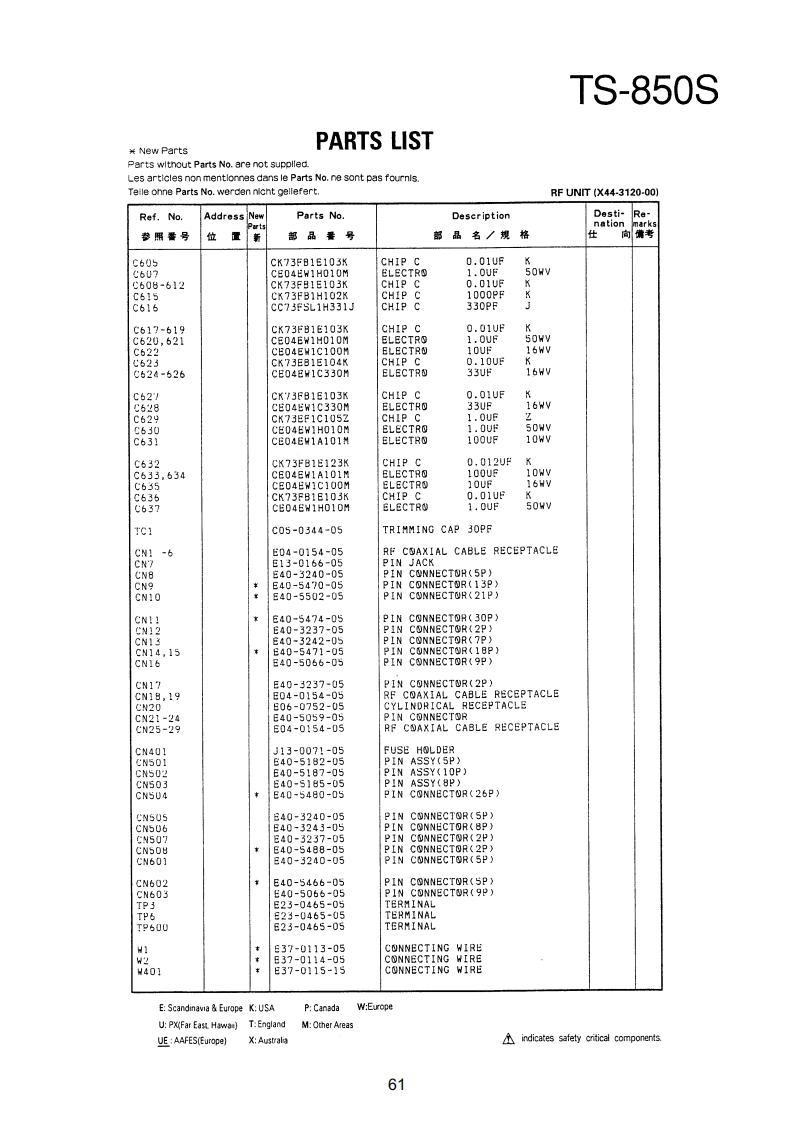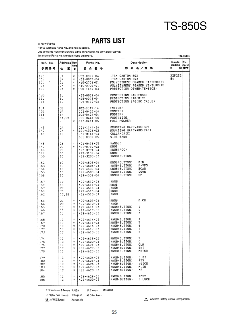 TS-850SPARTS LIST¥New PartsParts wlthout Parts No.are not supplled.Les articles non mentlonnes dans le Parts No.ne sont pas foumls.Telle onne Parts No.werden nicht gellefert.TS-850SRef.NoAddressNeParts No.DescriptionDesti-Renation位品号部品名/规格向考TS-850S1日A01-2014-01METALLIC CABINET(TOP)A01-2015-D110850METALLIC CABINET(BOTTOMXA22-0775-02SUB PANELA40-0630-03BOTTOM PLATEA62-0043-03PANELA62-0045-02PANEL ASSY789025-器A82-0002-02REAR PANEL10458810-1159-03FRONT GLASS日11-0466-04FILTERB38-0350-15LCD ASSY342-3343-04LABEL(S/NO)944-2163-04LABEL(UPC CORD)846-0410-30WARRANTYCARDKK2KKKKK日46-0419-00WARRANTY CARDEE283846-0419-00WARRANTYCARD日46-0422-00WARRANTYCARD862-0061-00INSTRUCTION MANUALKK2XX2651561631313185666161600019213141545771KKKKK日62-0062-001NSTRUCTI⑤N MANUALMM2M3日名2=00春)=001NsTR山CT10NMANUALMA口口762-0062-00MANUALB62-0062-00INSTRUCTION MANUALE4362-0063-00MANUAL862=0063-00INSTRUCTIONMANUALE4K1K18139862-0065-00MANUALB72-0120-04MODEL NAME PLATE(TS-8505)KK2XX2872-0120-04M四0ELNAMEPLATE(TS-8505)PP2性M2B72-0120-04MODEL NAMEPLATE(TS-8505)N34甜272-0223-04MODEL NAMEPLATE(TS-850S)72-0223-04MODEL NAMEPAT513=5505032-0416-04E04-0167-05RF COAXIAL CABLE RECEPTACLE07-0751-05DIN PLUGACSYE07-1351-0513P ROUND PLUGACSYPIN PLUGRTTYANT日30=3035.05DC CABLE31-2154-0时CONNECTING WIRE(CAL>:831-0081-05CONNECTING WIRE(IF-RF)E31-6117-09CONNECTINGHIRECEINAL/ANTIK2州2M483i-6117-05CONNECTINGWIRE(FINAL/ANTX2P2E2E31-6117-05CONNECTING WIRE(FINAL/ANTE437-0060-05CONNECTINGWIRE(RF/PLL)E37-0061-15CONNECTING WIRECCAR/RE)7-88:9CONNECTINGWIRE(RF/PLL>CUNNECTINGWIRE(CAR/IF)WIRE(CAR/PLL)CONNECTINGWIRE(CAR/PLL,ANT/RFg37=0066=09的VNECTING HIRECR台/F1NAL3E37-0067-05CONNECTINGWIRE(RF/IF)E37-0068-05FLAT CABLE(IF/NB PROC AGC)E37-0069-05FLATCABLE(RF/RITNOTC·VRE:Scandinavia Europe K:USAP:CanadaW:EuropeUP%MF制Ea5tHwa司T:EnglandM:Other AreasUE AAFES(Europe)indicates safety critical components.53