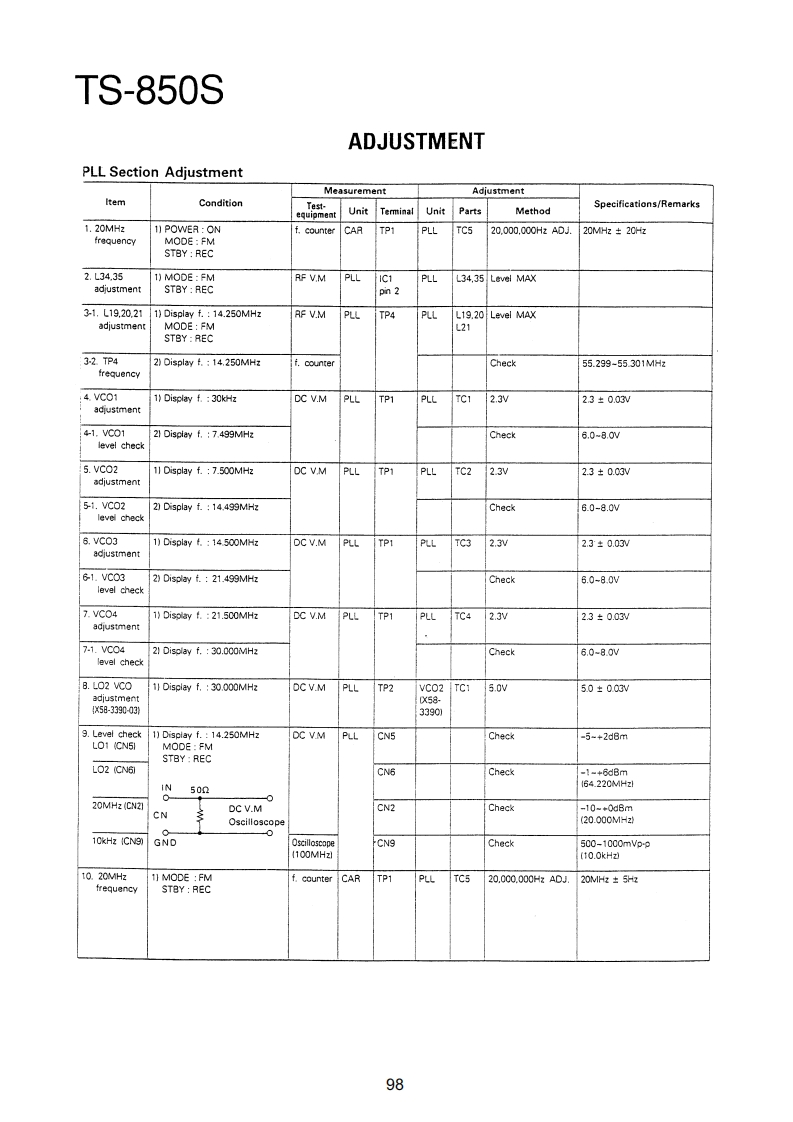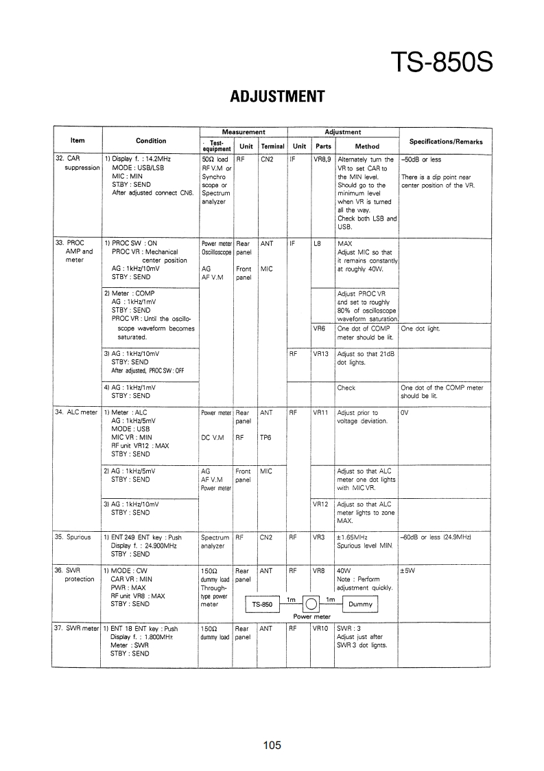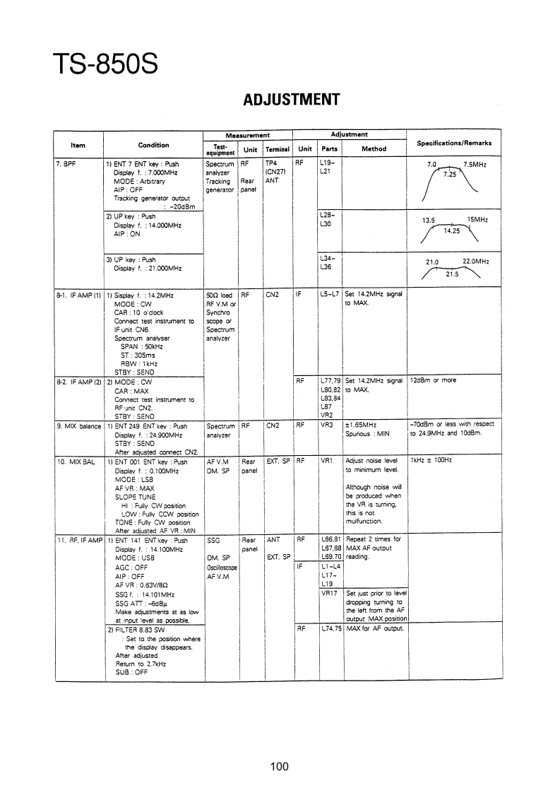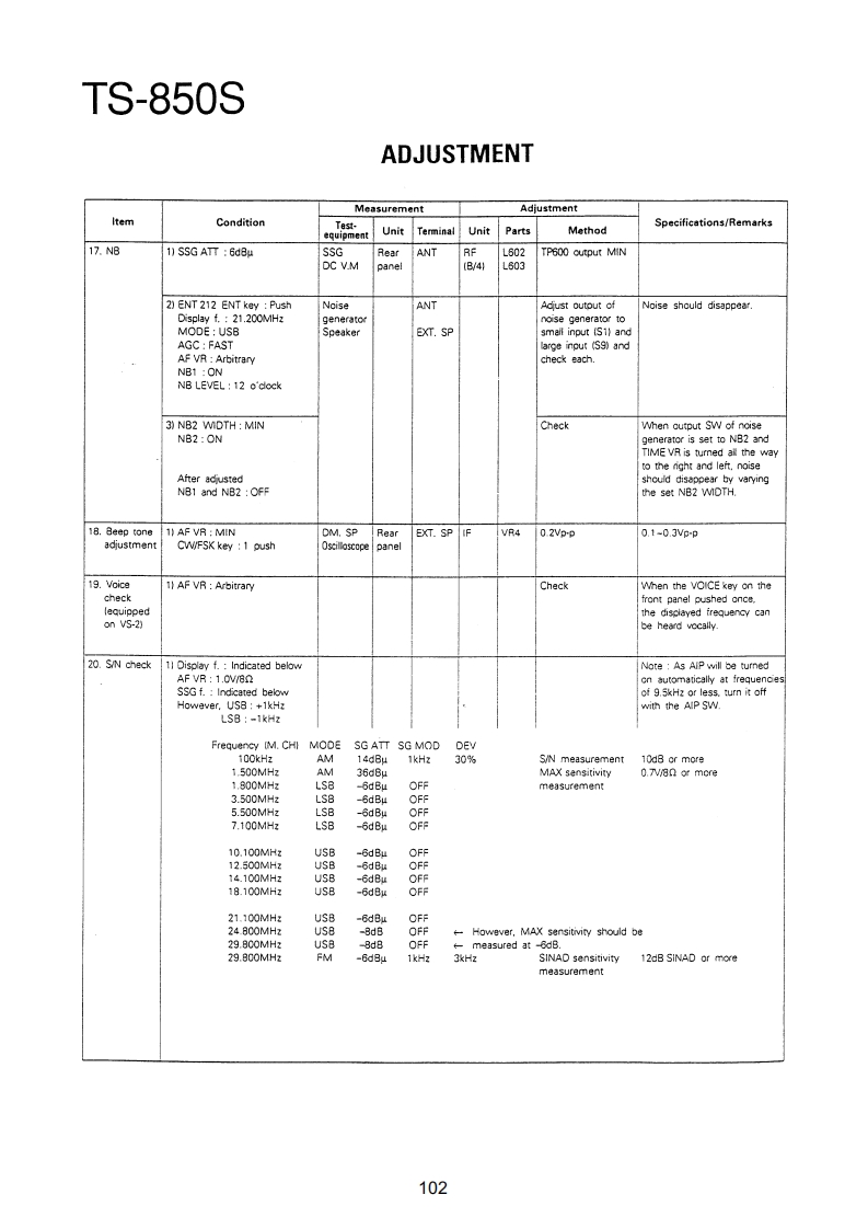 TS-850SADJUSTMENTRequired Test Equipment1.DC Voltmeter (DC V.M)11.Noise Generator1)Input resistance More than 1MMust generate ignition noise containing harmonics2)Voltage range:1.5 to 1000V AC/DCbeyond 30MHzNote A high-precision multimeter may be used.12.RF Dummy LoadHowever,accurate readings can not be obtained for1)Impedance 1500 and 502high-impedance circuits.2)Dissipation:150W or greater2.DC Ammeter13.Linear Detector1)Current range:100mA,1.5A,15A,High-precision1)Frequency range 30MHzammeter may be used.14.Power Meter3.RF VTVM(RF V.M)1)Impedance:5021)Input impedance:1MR and less than 3pF,min.2)Dissipation:300W continuous or greater2)Voltage range:10mV to 300V3)Frequency limits:60MHz or greater3)Frequency range 10kHz to 500MHz15.Spectrum Analyzer4.AF Voltmeter (AF V.M)1)Frequency range:100kHz to 110MHz or greater1)Frequency range 50Hz to 10kHz2)Bandwidth 1kHz to 3MHz2)Input resistance 1M or greater16.Detector3)Voltage range:10mV to 30V1)For adjustment of BPF5.AF Generator(AG)1)Frequency range:200Hz to 5kHzINPUTOOOUTPUT2)Output:1mV or less to 1V,low distortionTo AF unit1N60To oscilloscope6.AF Dummy Load5611N60OGNO1)Impedance:8GNDO2)Dissipation 3W or greater7.Oscilloscope2)For adjustment of PLL/CO BPFRequires high sensitivity,and external synchroniza-tion capability (150MHz or greater).INPUT OOOUTPUT8.Sweep Generator1)Center frequency 50kHz to 90MHzTo oscilloscope1N602)Frequency deviation:Maximum 35MHzGNDOOGNO3)Output voltage 0.1V or greater4)Sweep rate:At least 0.5 sec/cm17.Directional Coupler9.Standard Signal Generator (SSG)18.Monitor Receiver1)Frequency range:50kHz to 50MHzR-1000 class2)Output:-20dB/0.1uV to 120dB/1V19.Microphone3)Output impedance 50MC-43S or MC-60/60S84)AM and FM modulation can be possible.20.Tracking GeneratorNote:Generator must be frequency stable.10.Frequency Counter(f.counter)1)Minimum input voltage:50mV2)Frequency range:150MHz or greaterPreferenceJapanese "SG"American "SG"-6dB.…0.25μW0B0.5μV6dB…luv12dB2uV24dB.…8μV30dB.…15.8V40dB…50uV50dB…158uV60dB500μV70d81.58mW80dB.5mV90dB15.8mw100dB50mV120dB0.5V96