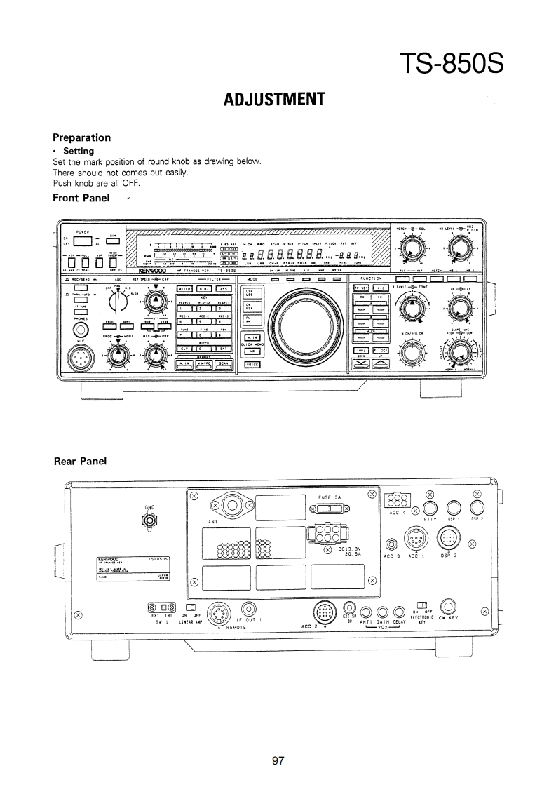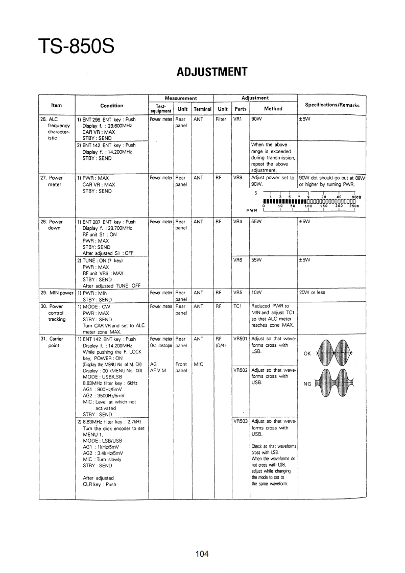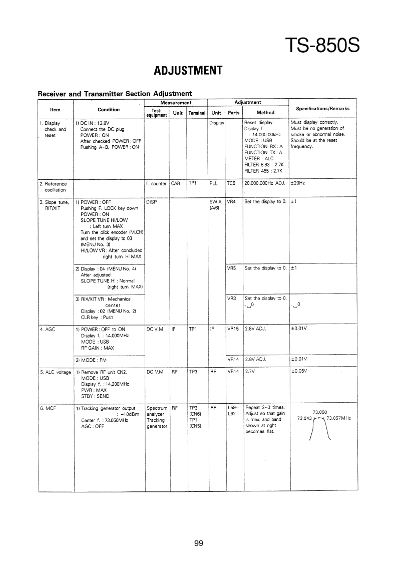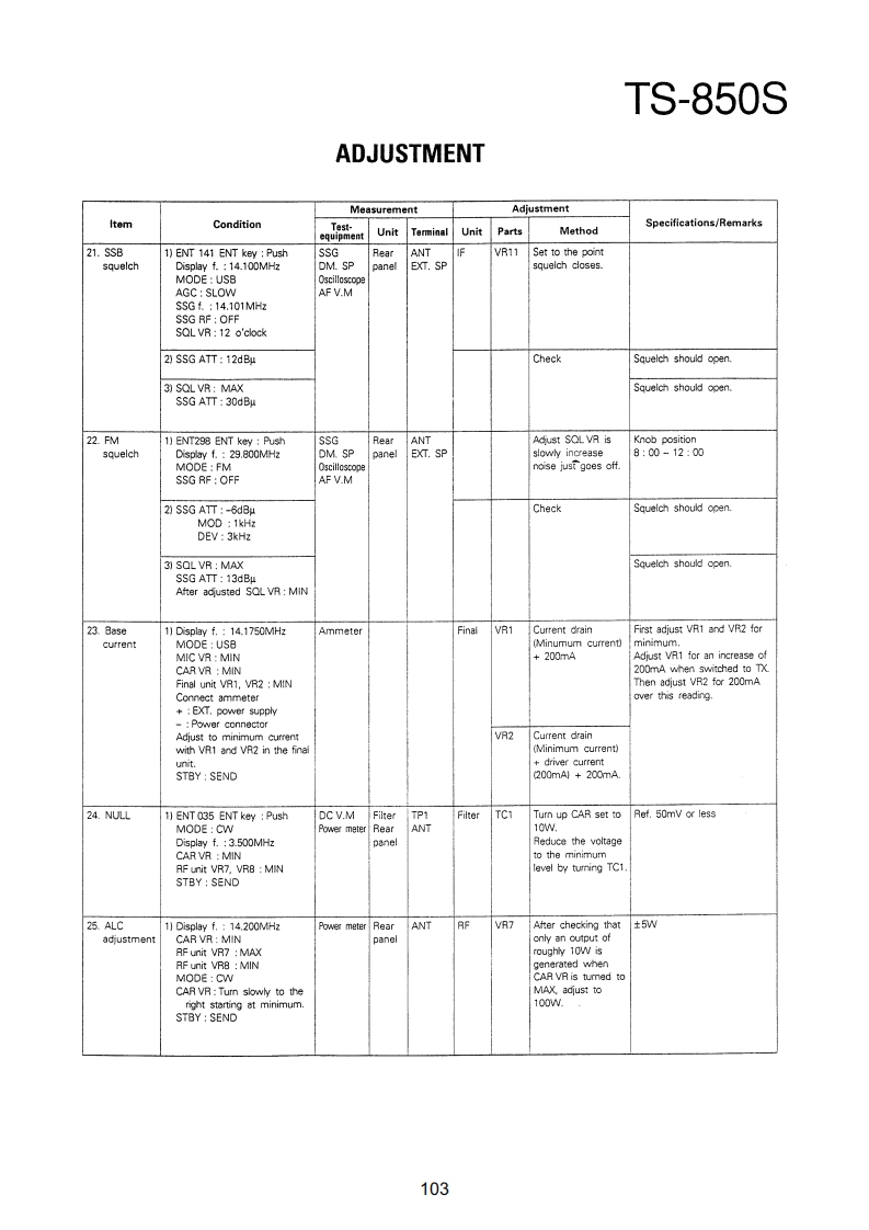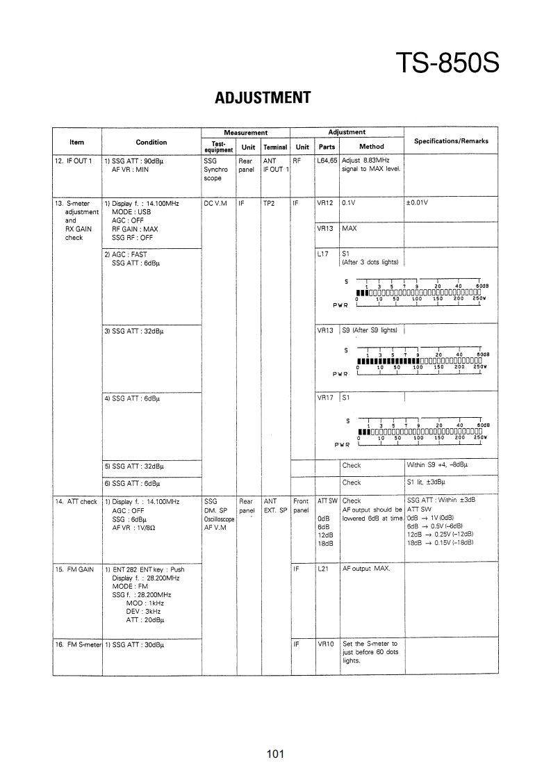 TS-850SADJUSTMENTRequired Test Equipment1.DC Voltmeter (DC V.M)11.Noise Generator1)Input resistance More than 1MMust generate ignition noise containing harmonics2)Voltage range:1.5 to 1000V AC/DCbeyond 30MHzNote A high-precision multimeter may be used.12.RF Dummy LoadHowever,accurate readings can not be obtained for1)Impedance 1500 and 502high-impedance circuits.2)Dissipation:150W or greater2.DC Ammeter13.Linear Detector1)Current range:100mA,1.5A,15A,High-precision1)Frequency range 30MHzammeter may be used.14.Power Meter3.RF VTVM(RF V.M)1)Impedance:5021)Input impedance:1MR and less than 3pF,min.2)Dissipation:300W continuous or greater2)Voltage range:10mV to 300V3)Frequency limits:60MHz or greater3)Frequency range 10kHz to 500MHz15.Spectrum Analyzer4.AF Voltmeter (AF V.M)1)Frequency range:100kHz to 110MHz or greater1)Frequency range 50Hz to 10kHz2)Bandwidth 1kHz to 3MHz2)Input resistance 1M or greater16.Detector3)Voltage range:10mV to 30V1)For adjustment of BPF5.AF Generator(AG)1)Frequency range:200Hz to 5kHzINPUTOOOUTPUT2)Output:1mV or less to 1V,low distortionTo AF unit1N60To oscilloscope6.AF Dummy Load5611N60OGNO1)Impedance:8GNDO2)Dissipation 3W or greater7.Oscilloscope2)For adjustment of PLL/CO BPFRequires high sensitivity,and external synchroniza-tion capability (150MHz or greater).INPUT OOOUTPUT8.Sweep Generator1)Center frequency 50kHz to 90MHzTo oscilloscope1N602)Frequency deviation:Maximum 35MHzGNDOOGNO3)Output voltage 0.1V or greater4)Sweep rate:At least 0.5 sec/cm17.Directional Coupler9.Standard Signal Generator (SSG)18.Monitor Receiver1)Frequency range:50kHz to 50MHzR-1000 class2)Output:-20dB/0.1uV to 120dB/1V19.Microphone3)Output impedance 50MC-43S or MC-60/60S84)AM and FM modulation can be possible.20.Tracking GeneratorNote:Generator must be frequency stable.10.Frequency Counter(f.counter)1)Minimum input voltage:50mV2)Frequency range:150MHz or greaterPreferenceJapanese "SG"American "SG"-6dB.…0.25μW0B0.5μV6dB…luv12dB2uV24dB.…8μV30dB.…15.8V40dB…50uV50dB…158uV60dB500μV70d81.58mW80dB.5mV90dB15.8mw100dB50mV120dB0.5V96