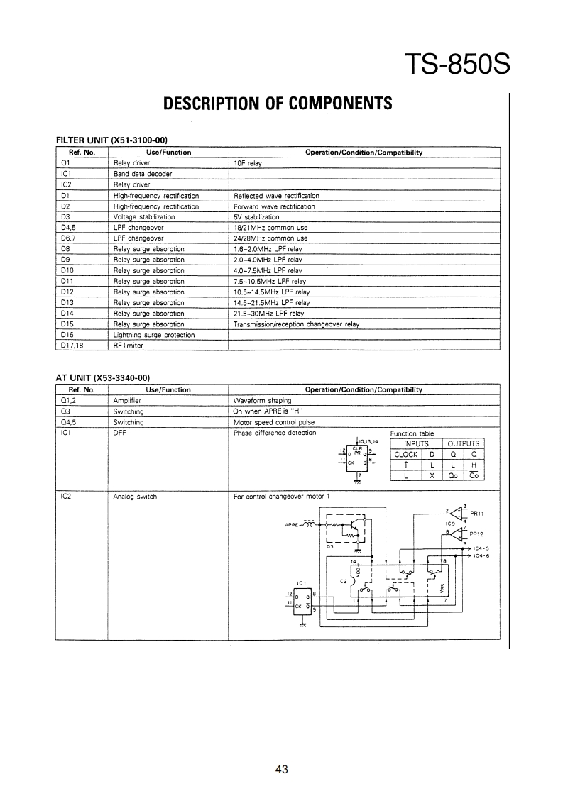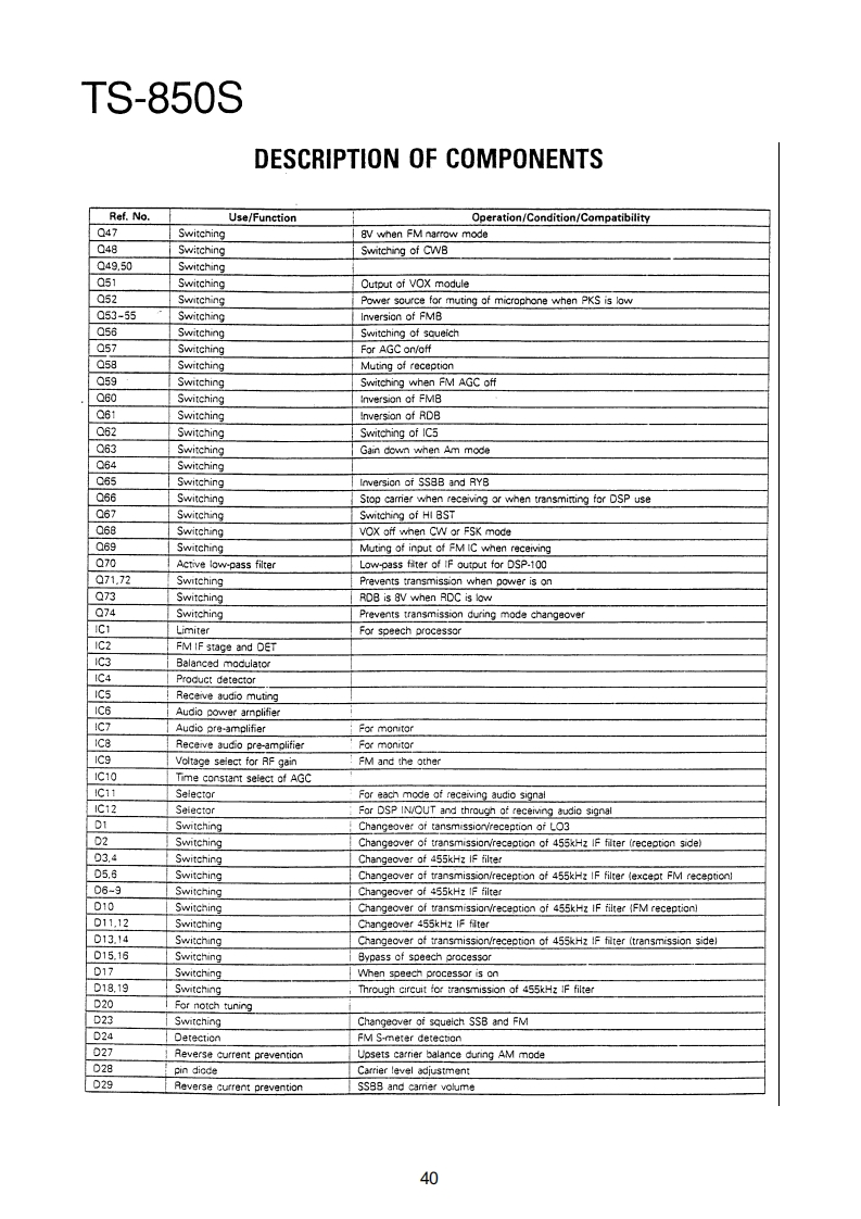 TS-850SDESCRIPTION OF COMPONENTSRF UNIT(X44-3120-00)Ref.No.Use/FunctionOperation/Condition/CompatibilityQ1RX RF amplifier22-30MHz02.3RX RF amplifier22MHz or lessQ4DC switchK4 control05TX RF amplifierDrive outputQ6.7DC switchQ8-11RX 1st mixerfRx 73.05MHzQ12Ripple filterQ13IF amplifier73.05MHzQ14Buffer015Mixer73.05MHz-8.83MHz for monitorQ16.17RX 2nd mixer73.05MHz+8.83MHzQ18RF amplifierNB RF outputQ19DC switchNB gateQ20TX IF amplifier8.83MHzQ21RF amplifierFor monitor,8.83MHzQ22DC switchQ23.24TX 2nd mixer8.83MHz+73.05MHzQ26.27TX 3rd mixer73.05MHz -fTxQ28RF amplifier1st local amplifierQ29DC LPFACL keyingQ30.31DC switchOn when ARPD or PT or TPD are "H"032DC switchOn when S1 is on or BPD is "H"and Q30 is off033DC switchOn when PDE is "L"Q34DC switchOn when 031 is cnQ35DC switchOn when TPD is on036-38DC amplifierALC amplifier039DC amplifierSWR protectionQ40.41DC amplifierALC amplifierQ42DC switchQ43DC switchTXB -RLQ45-48DC switchQ49RF switchiOPn when TXQ50DC switchOn when PDE is "L"Q51DC switchOn when Q50 is onQ52OC switchOn when Q45 is on and Q51 is offQ501AF switchOn when VOB is“HQ502OC switchOn when VOB is "H"Q503AF switchOn when VOA is "H"and VOB is"L"Q601-603RF amplifier8.83MHz NBC604DC amplifierNB AGCQ605DC switchOn at noise puise (NB1,N821Q606DC switchOn at noise puise (NB2)Q607DC switchCn at noise pulse (NB1.N82]Q608DC switchCn at noise puise (N旧2Q609AF amplifierFM microphone amplifierQ610Af switchFM microphone muteQ611DC switchOn when 0612 is onQ612DC switchOn when 0613 is offQ613DC switchOn when NFB is"H"36