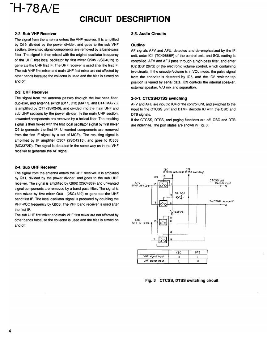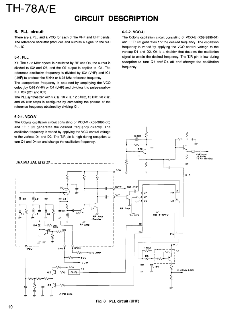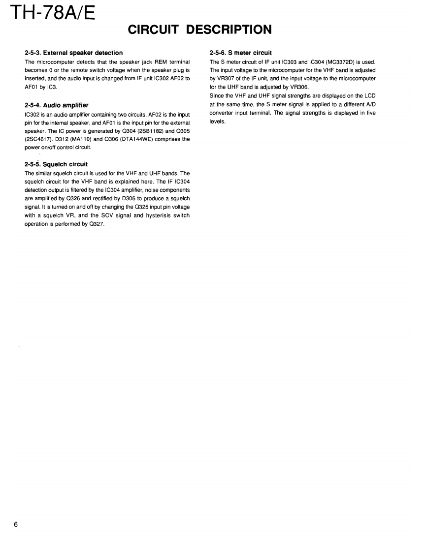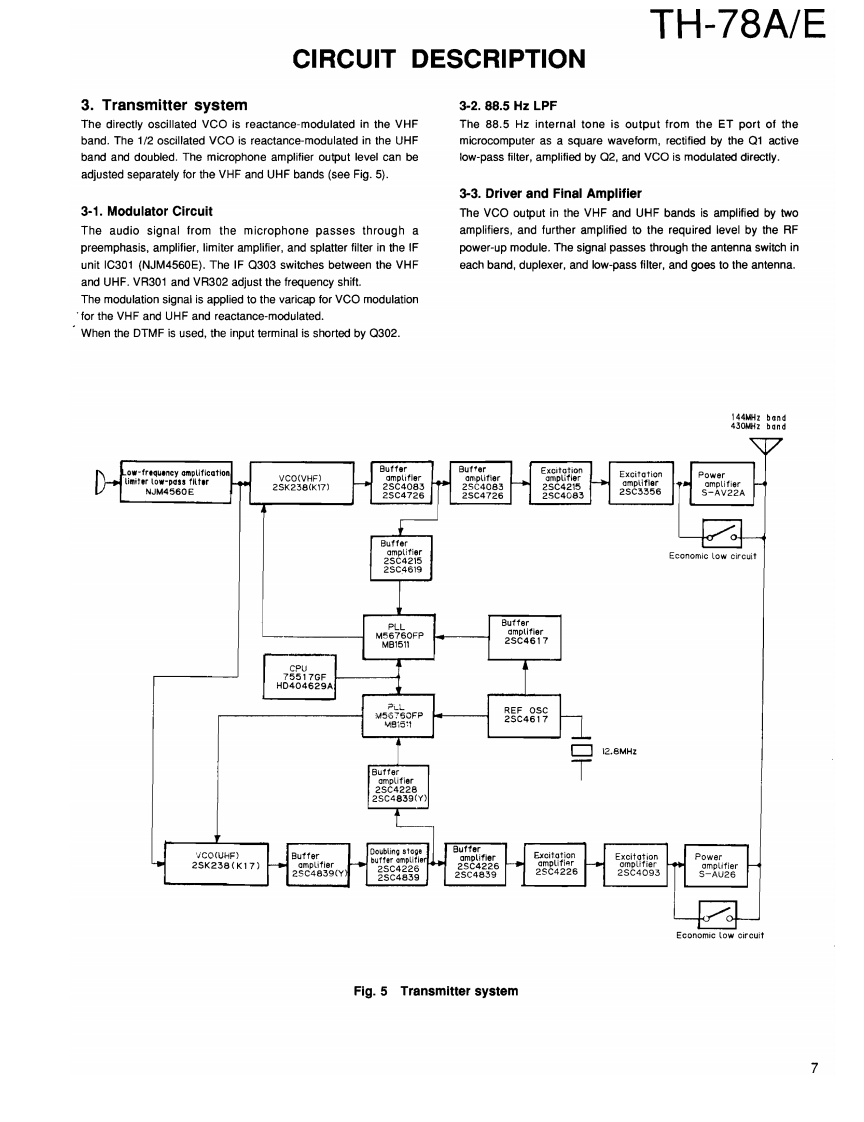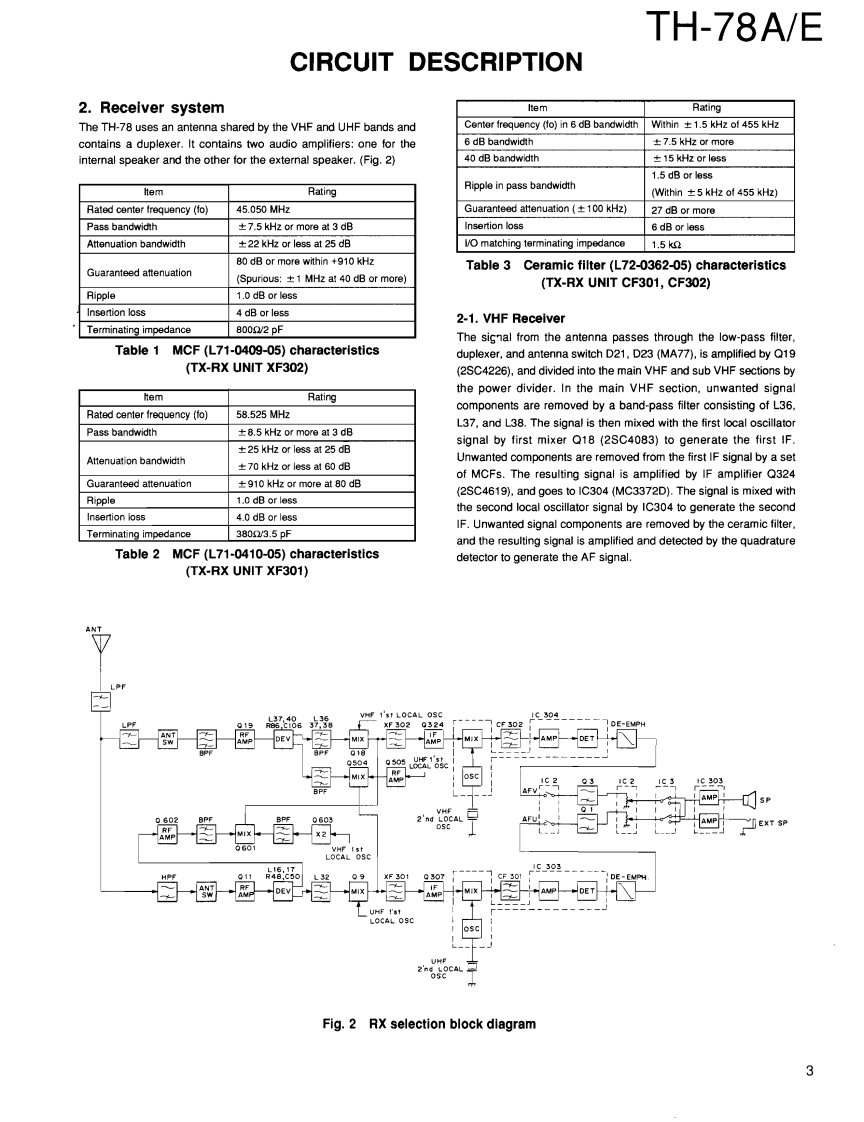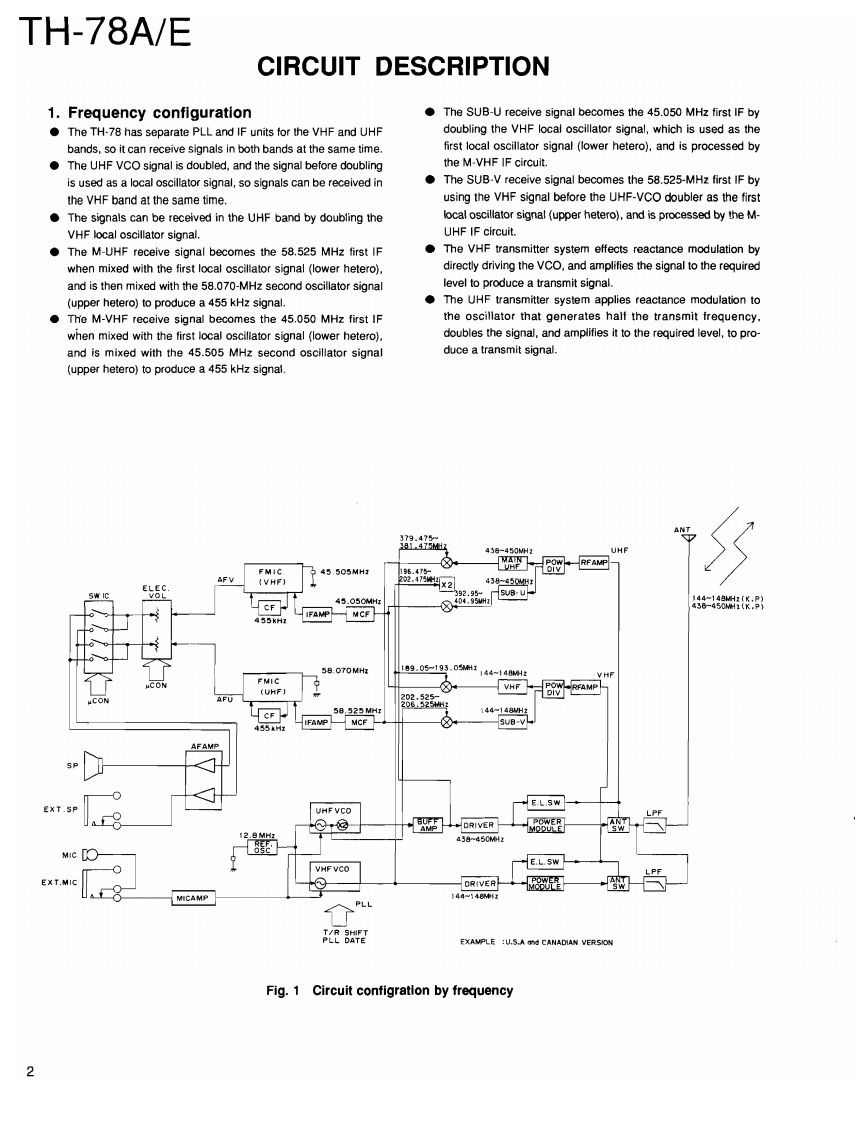 144/430(440)MHz FM DUAL BANDERKENWOODTH-78A/ESERVICE MANUAL1992-2 PRINTED IN JAPANB51-8167-00(B)1197CONTENTS-AntennaCIRCUIT DESCRIPTION....T90-0445-05DESCRIPTION OF COMPONENTS.15SEMICONDUCTOR DATA.......20PARTS LST33DISASSEMBLY ..54PACKING.56ADJUSTMENT.....4.57PC BOARD VIEWS/CIRCUIT DIAGRAMSTX-RX UNIT-RF (X57-409X-XX)B/4 BOARD VIEWS ........65TX-RX UNIT-RF CIRCUIT DIAGRAMS.69KnobTX-RX UNIT-IF (X57-409X-XX)A/4 BOARD VIEWS ........73{K29478304)TX-RX UNIT.IF CIRCUIT DIAGRAMS......77CONTROL UNIT(X53-342X-XX)A/5 BOARD VIEWS ........81CONTROL UNIT CIRCUIT DIAGRAMS.85-Knob(K29-4773-04)TX-RX UNIT (X57-409X-XX)C/4,D/4 BOARD VIEWS ........89SUB UNIT (VHF VCO)(X58-3890-00)BOARD VIEWS .....90KnobSUB UNIT (UHF VCO)(X58-3890-00)BOARD VIEWS .......90(K294782-03)SUB UNIT (UHF PA)(X58-3900-00)A/2 BOARD VIEWS ....91Plastic Cabinet Ass'ySUB UNIT (VHF PA)(X58-3900-00)B/2 BOARD VIEWS ....92(A02-1649-13):TH-78ACONTROL UNIT (X53-342X-XX)B/5 BOARD VIEWS .....93(A02.1650-13):TH-78ECONTROL UNIT(X53-342X-XX)C/5 BOARD VIEWS.........95CONTROL UNIT (X53-342X-XX)D/5 BOARD VIEWS ......96CONTROL UNIT (X53-342X-XX)E/5 BOARD VIEWS96BLOCK DIAGRAM..97Knob-LEVEL DIAGRAM.....99(K294781-12)TERMINAL FUNCTIONS4101BT-8(BATTERY CASE).....103Dressing PlateHMC-2 (HEAD SET WITH VOX PTT).(B03-0572-04).104HMC-2(HEAD SET WITH VOX PTT).105ME-1(EXTENSION MEMORY UNIT).........+106PG-2W (DC CORD)/PG-3F(PLUG WITH CORD)..107SC-35/36(SOFT CASE)/MB-6(MOBILE BRACKET)/WR-2(WATERPROOF CASE).......108SMC-31/32(SPEAKER MICROPHONE)..109SMC-33 (SPEAKER MICROPHONE)/HS-9 (EARPHONE)....110TSU-7 CTSS UNIT)..111TSU-7 (CTCSS UNIT)....112SPECIFICATIONS..........................BACK COVERPhoto is TH-78A