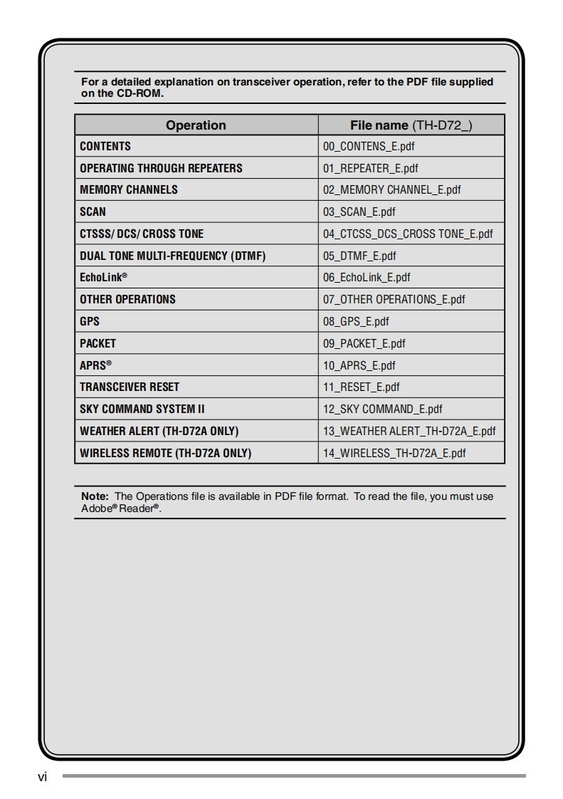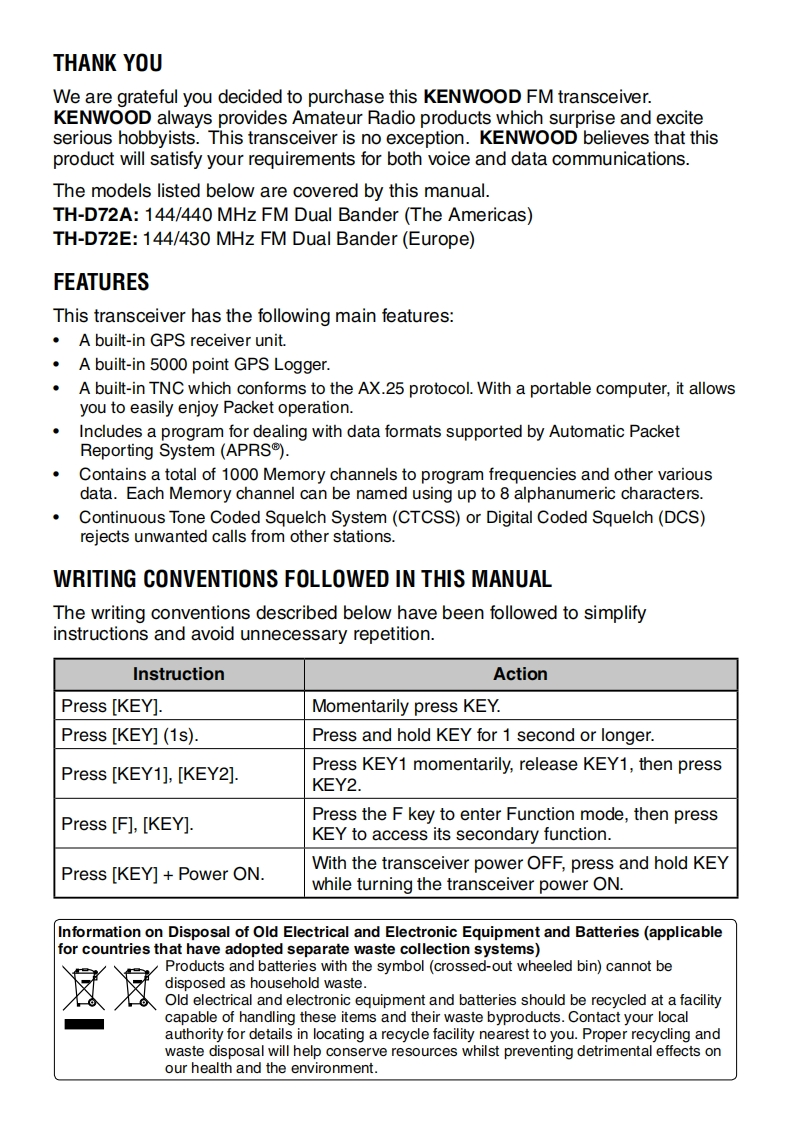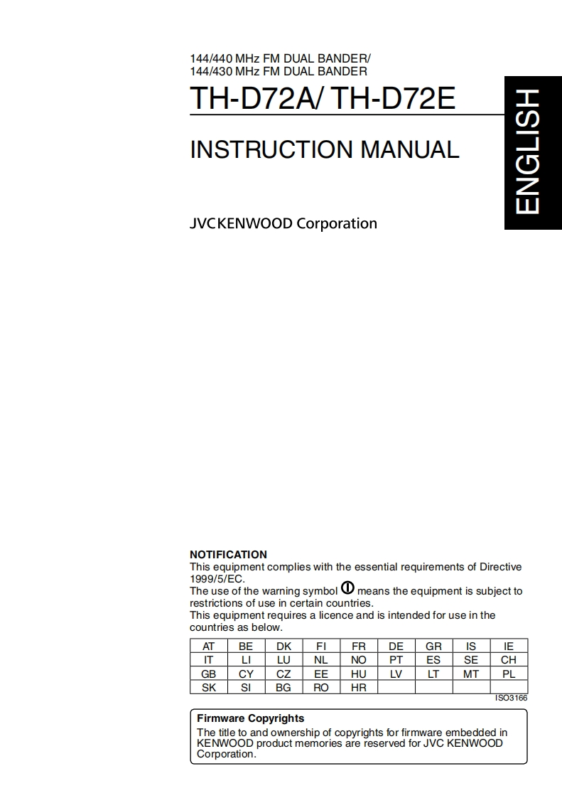 TH-D72A/TH-D72EKENWOODDATA144/440 MHz FM DUAL BANDER/144/430 MHz FM DUAL BANDERINSTRUCTION MANUAL144/440 MHz FM DOUBLE BANDE144/430 MHz FM DOUBLE BANDEMODE D'EMPLOIDOBLE BANDA DE 144/440 MHz EN FM/DOBLE BANDA DE 144/430 MHz EN FMMANUAL DE INSTRUCCIONESOnly basic operations are explained in this instruction manual.For a detailed explanation on the operations,refer to the PDF filesupplied on the CD-ROM.Seules les fonctions de base sont expliquees dans ce moded'emploi.Pour le detail sur les autres operations,reportez-vousau fichier PDF a votre disposition sur le CD-ROMEn este manual de instrucciones solamente se explican lasoperaciones basicas.Si desea obtener una descripcion detalladade las operaciones,consulte el archivo PDF correspondienteincluido en el CD-ROM.JVCKENWOOD Corporation©B62-2235-40(K,E)(€0682①
