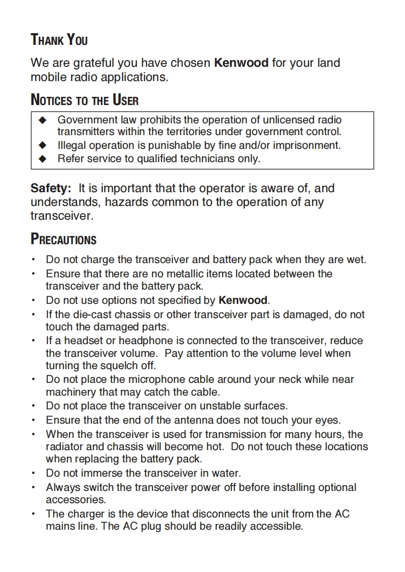 kenwood-tk2306_3306操作说明书手册找手册网31天前发布关注私信0.47MB18页023kenwood-tk2306_3306操作说明书手册此内容为付费资源,请付费后查看¥19¥21黄金会员免费钻石会员免费登录购买付费资源 第1页 / 共18页 第2页 / 共18页 第3页 / 共18页 第4页 / 共18页 第5页 / 共18页 第6页 / 共18页 第7页 / 共18页 第8页 / 共18页 第9页 / 共18页 第10页 / 共18页 试读已结束,还剩8页,您可下载完整版后进行离线阅读 THE END建武 文本预览 INSTRUCTION MANUALKENWOODVHE FM TRANSCEIVERTK-2306UHF FM TRANSCEIVERTK-3306Kenwood Corporation©B62-2111-00(M)09080706050403020100Downloaded from www.rads.ru 查看更多 收起部分 喜欢就支持一下吧收藏